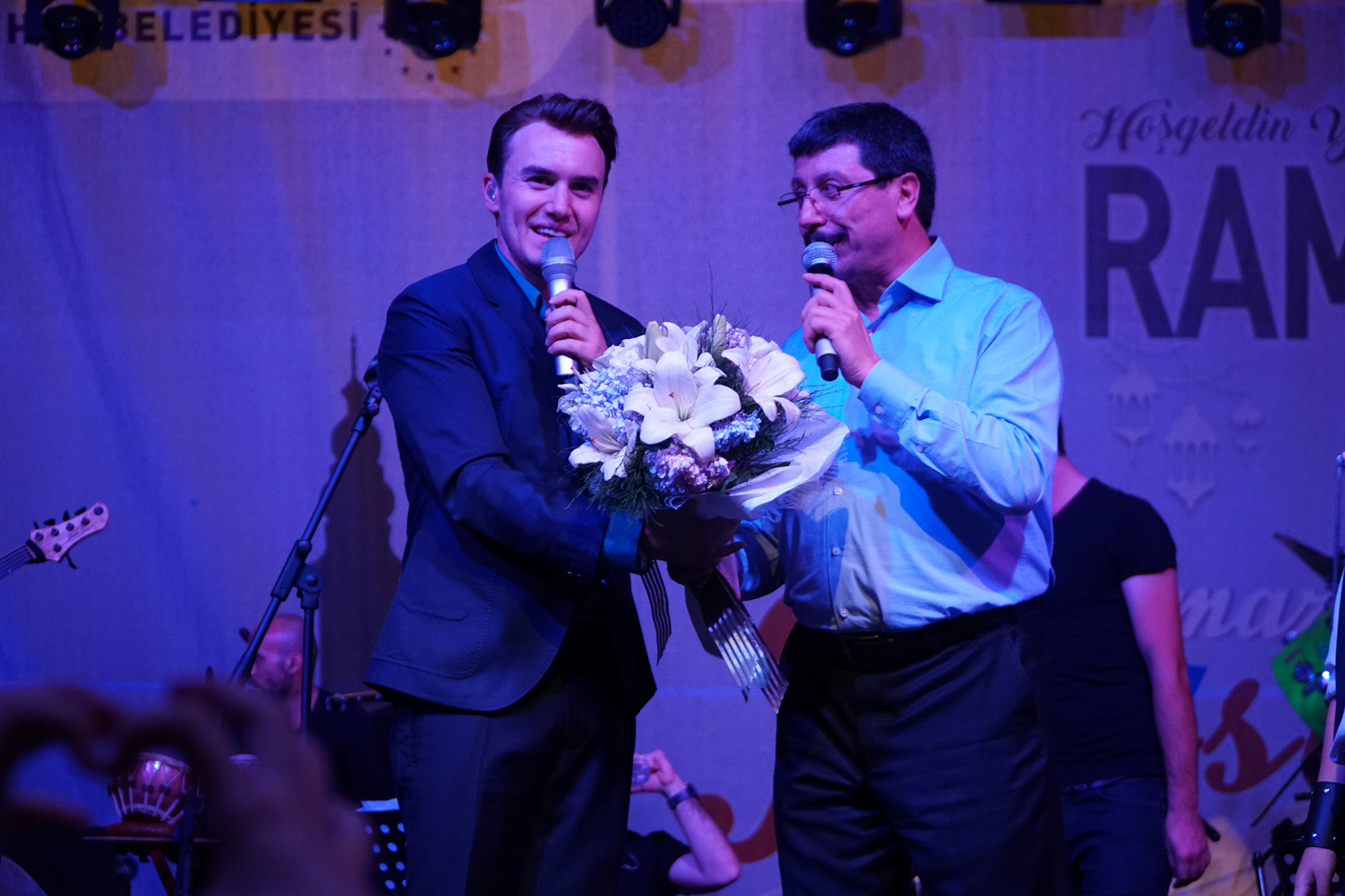 Büyükşehir Belediyesi iştiraklerinden Kültür A.Ş. tarafından Merinos Park’ta düzenlenen ‘Şehr-i Ramazan’ etkinlikleri, ünlü isimleri Bursalılar ile buluşturmaya devam ediyor. Son yılların en başarılı seslerinden olan ve tüm Türkiye’nin gönlünde taht kuran ünlü sanatçı Mustafa Ceceli de Bursalılarla buluştu. Teravih namazı sonrası sahneye çıkan ünlü sanatçı, en güzel şarkılarını hayranları ile birlikte seslendirdi. Programında ilahilere de yer veren Ceceli, hayranlarına unutulmaz bir gece yaşattı. Gecenin sonunda Kültür A.Ş. Yönetim Kurulu Başkanı Rıfat Bakan, günün anısına ünlü sanatçıya çiçek verdi.