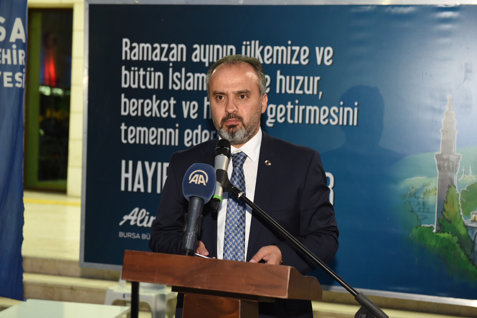 Büyükşehir Belediye Başkanı Alinur Aktaş, iftar öncesinde masaları tek tek dolaşarak vatandaşları dinledi. Ardından kürsüye çıkan ve halka hitap eden Başkan Alinur Aktaş, Büyükşehir Belediyesi’nin kurduğu iftar sofralarıyla ramazan ayının dolu dolu geçtiğini söyledi. Bursa’da olduğu gibi Balkan ve Kafkas ülkelerinde de benzer atmosferlerin yaşandığını, kurulan onlarca iftar sofrasıyla yüzlerce-binlerce Müslümanın aynı mekanda omuz omuza oruç açtığını ifade eden Başkan Aktaş, “Hedefimiz güzelliği paylaşmaktır, gönüllere dokunmaktır. Bana göre, burada da maksat hasıl olmuştur. Davetimize icabet ettiğiniz için hepinize teşekkür ediyorum. 17 ilçenin tamamında bu sofralar kuruluyor. Hatta gönül coğrafyalarımızda, başta Balkanlar olmak üzere Kafkaslarda aynı organizasyonlar yapılıyor. İhtiyaç sahiplerine erzaklar dağıtılıyor. Allah’a hamdolsun. Bursa’nın insanı, iş dünyası, Büyükşehir Belediyesi her tarafa yetişmeye çalışıyor. İnşallah bu mutluluk ve huzur ile Kadir Gecesi’ni de bayramı da idrak ederiz. Şimdiden bayramınızı tebrik ediyorum. Allah birlik ve beraberliğimizi bozmasın” dedi.
