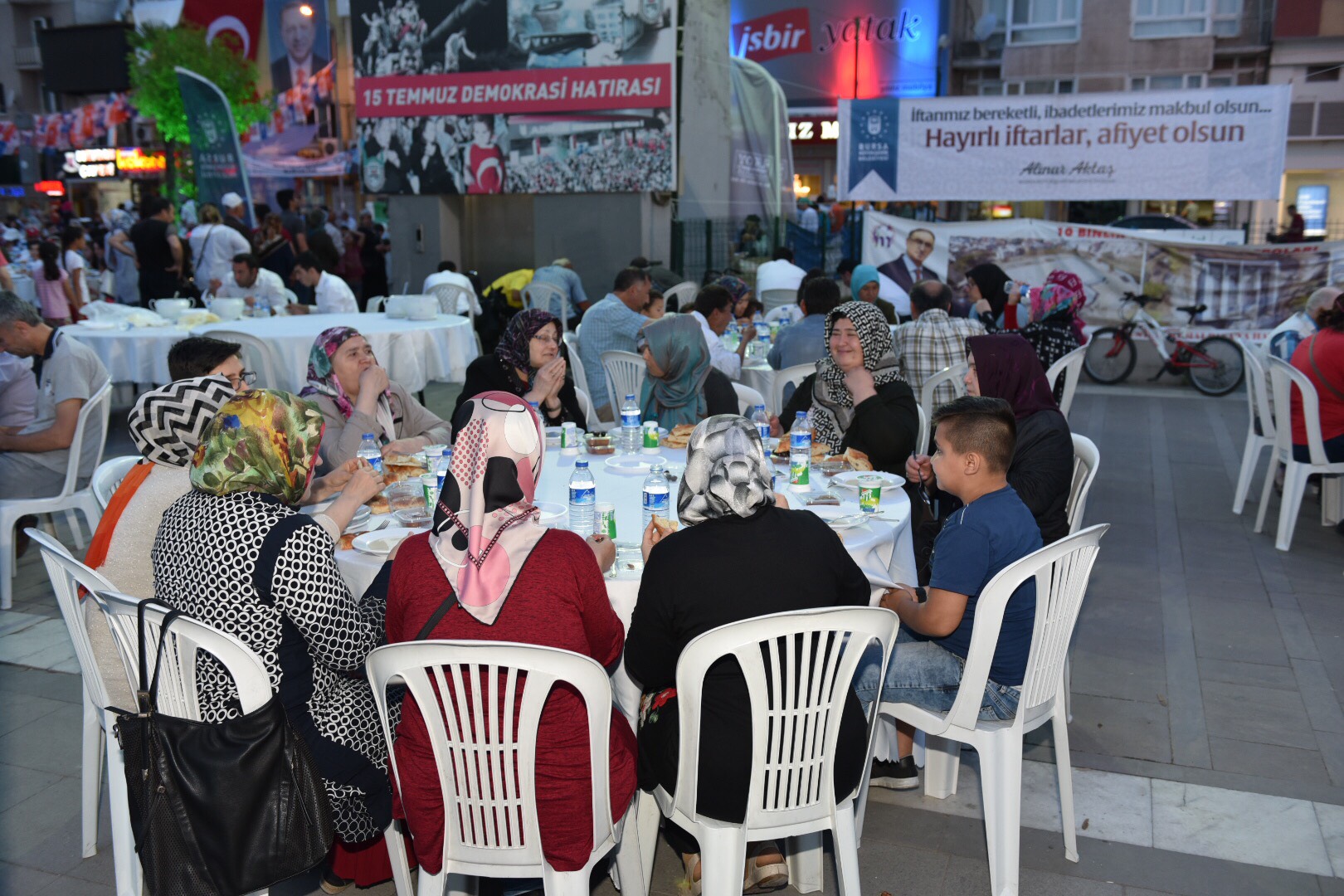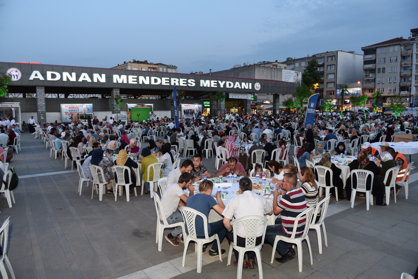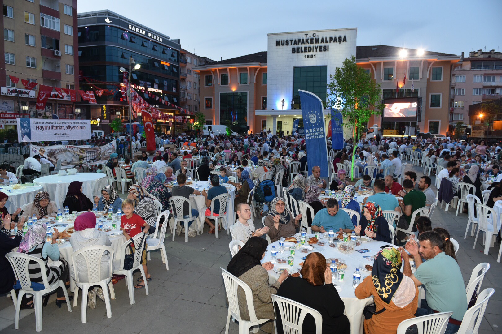 Büyükşehir Belediyesi, yaptığı organizasyonlarla, 17 ilçe ile 7 farklı ülkede 11 ayın sultanı ramazanı ‘ruhaniyetine uygun şekilde’ yaşatmaya devam ediyor. Bir yandan Bursa’nın tüm ilçelerinde kurduğu iftar sofralarıyla vatandaşları bir araya getiren Büyükşehir Belediyesi, diğer yandan başta Balkan ve Kafkas ülkeleri olmak üzere dünyanın değişik coğrafyalarında benzer etkinliklerle Müslümanlar arasında birlik ve beraberliği sağlıyor. Ramazan ayının coşkusunu insanlara aktaran, katılımcıların kalplerinde manevi hislerin oluşmasına neden olan etkinliklerden biri de Mustafakemalpaşa’da gerçekleştirildi. Adnan Menderes Meydanı’nda kurulan iftar sofraları, binlerce Mustafakemalpaşalıyı bir araya getirdi. Başbakan Yardımcısı Hakan Çavuşoğlu ile Büyükşehir Belediye Başkanı Alinur Aktaş’ın da katıldığı organizasyonda, 2 bin 500’ü aşkın kişi orucunu birlikte açtı.
