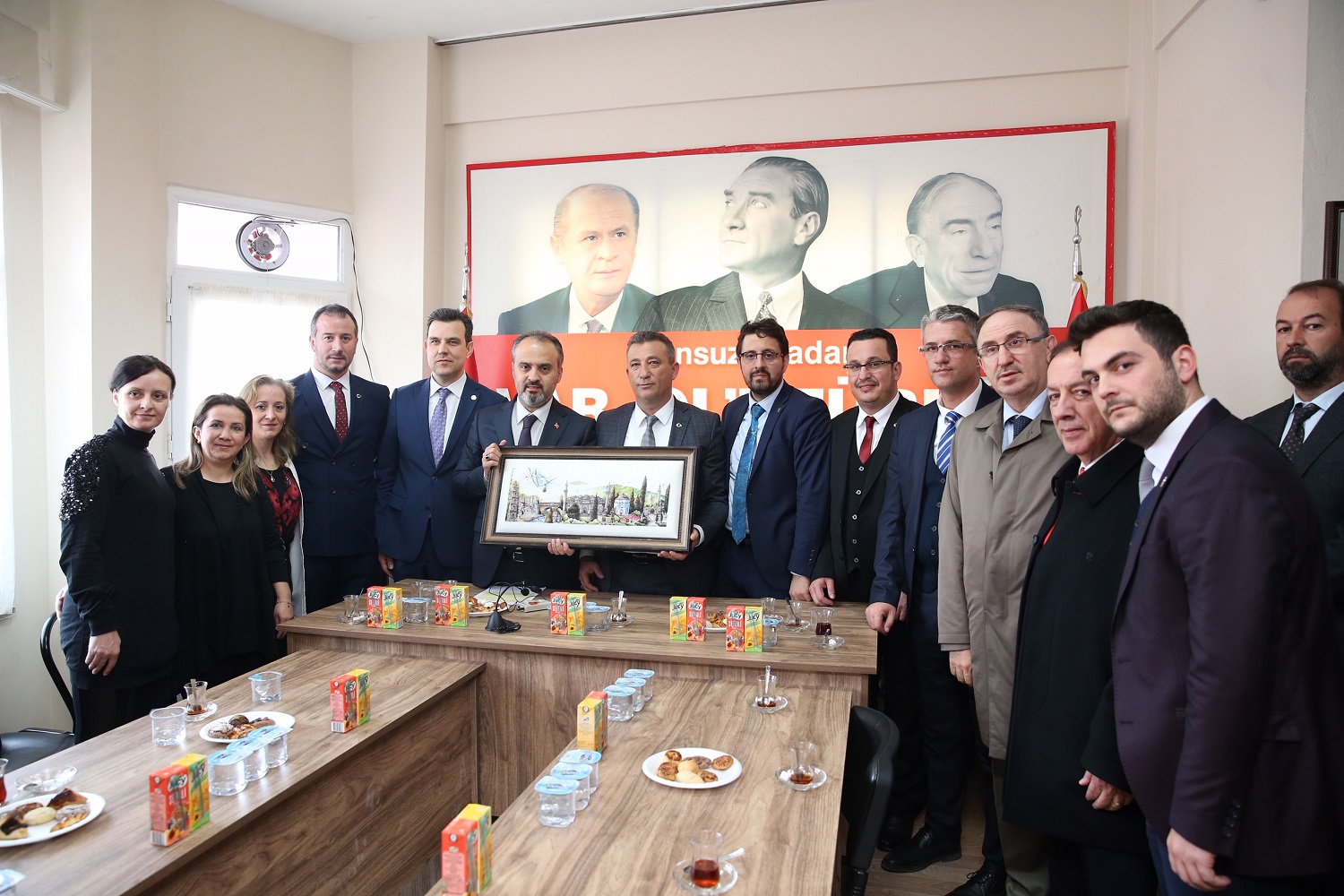 AK Parti Bursa Milletvekili Mustafa Esgin, İl Başkan Yardımcısı Mustafa Sayılgan, Milliyetçi Hareket Partisi (MHP) Bursa İl Başkan Yardımcısı Halil İbrahim Bozkurt, Mustafakemalpaşa Belediye Başkanı Sadi Kurtulan ve AK Parti Mustafakemalpaşa Belediye Başkan Adayı Mehmet Kanar da düğün salonundaki toplantıda söz alarak, gündem ve siyasete dair konuşmalar gerçekleştirdi.