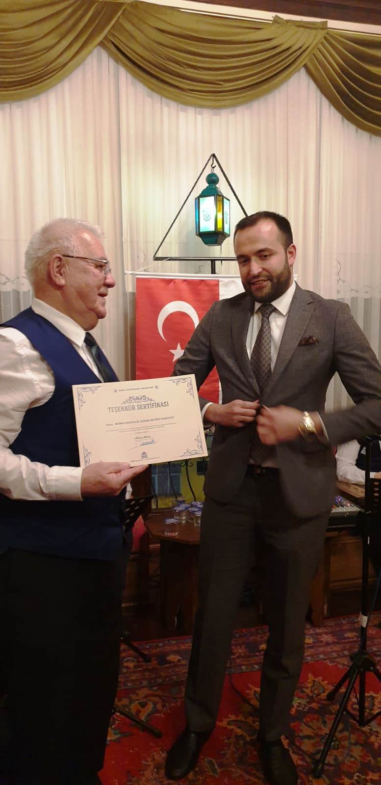 Büyükşehir Belediyesi tarafından kent belleğine armağan edilen Bursa’da Yaşam Kültürü Müzesi, renkli etkinlilere ev sahipliği yapıyor. Bursa Büyükşehir Belediyesi Müzeler Şube Müdürlüğü bünyesinde faaliyetlerini sürdüren müzede düzenlenen ‘Saz Başlayınca Söz Biter- Geleneksel Gezek Gecesi’ nde Türk Sanat Müziği’nin unutulmaz eserleri hep bir ağızdan seslendirilirdi. Bursa Dostluk Gezeği Musiki Derneği saz ustalarının eserleri ile renk kattığı gecede müze dostları gönüllerince eğlendi. Bursa Büyükşehir Belediyesi Başkanvekili Ahmet Yıldız ile Müzeler Şube Müdürü Muhterem Çevik’in yanı sıra çok sayıda musiki meraklısının katıldığı gecede 200 yıllık müze konağın mistik atmosferinde Türk Sanat Müziği’nin unutulmaz eserlerinin nağmeleri yankılandı. Büyükşehir Belediyesi Başkanvekili Ahmet Yıldız, Büyükşehir Belediyesi olarak Bursa’da unutulmaya yüz tutmuş kent kültürünün yaşatılmasına ilişkin kültürel faaliyetleri önemsediklerini söyledi. Bursa’da Yaşam Kültürü Müzesi’nin birçok renkli etkinliğe ev sahipliği yaptığını ifade eden Başkanvekili Yıldız, gecenin sonunda Bursa’da Dostluk Gezeği Musiki Derneği saz ustalarına günün anısına teşekkür belgesi takdim etti.