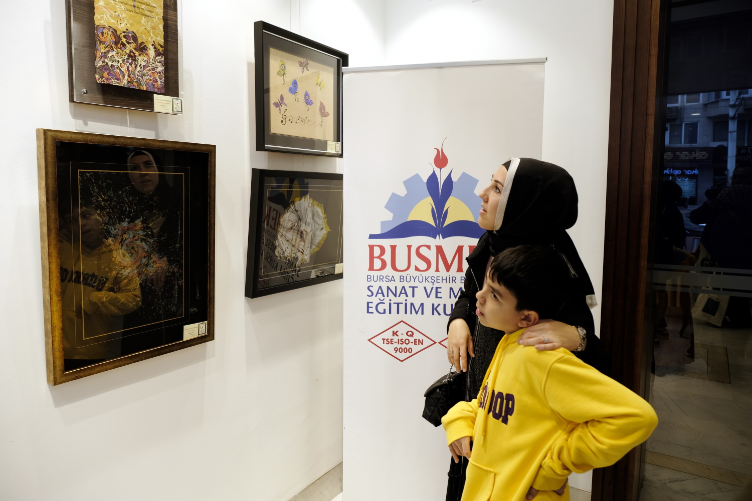 BURSA – Bursa Büyükşehir Belediyesi Sanat ve Meslek Eğitim Kursları’na (BUSMEK) devam eden 14 ihtisas sınıfı öğrencileri tarafından hazırlanan ve 50’ye yakın ebru ile 100’e yakın ciltleme çalışmasından oluşan ‘Nakşı Ebru’ sergisi, Tayyare Kültür Merkezi’nde ziyarete açıldı.