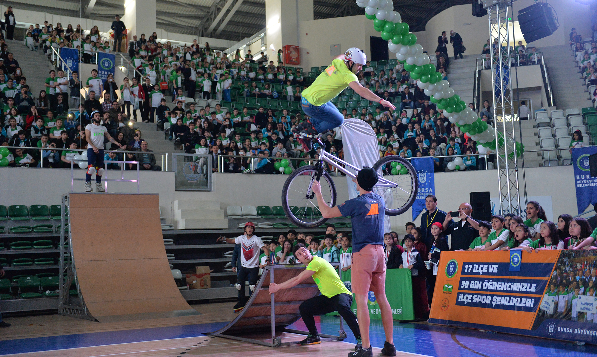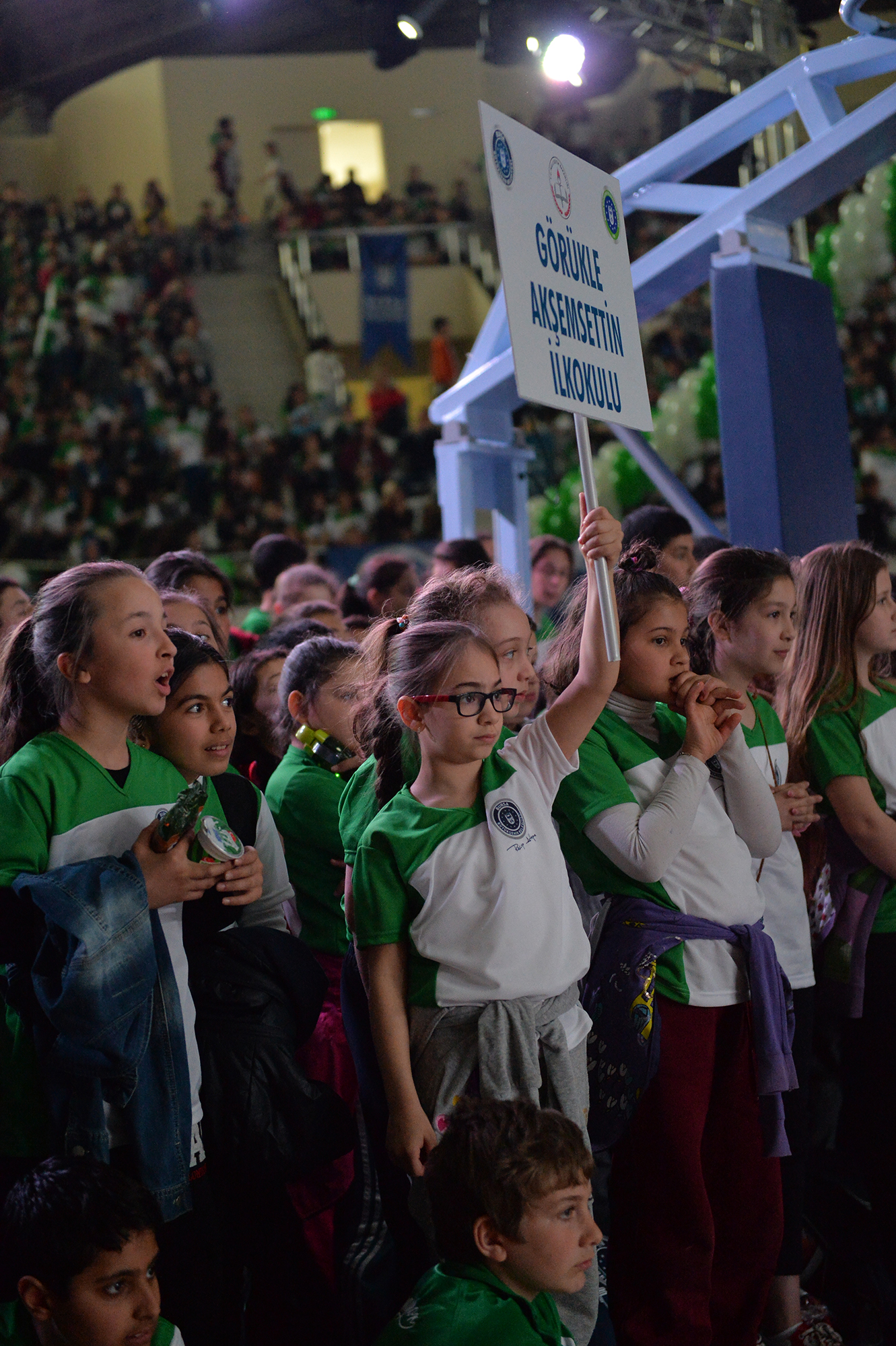 Gençlik ve Spor İl Müdürlüğü’ne ait Nilüfer Spor Salonu’nda yapılan şenliklere, ilçe genelindeki okullardan yaklaşık 15 bin öğrenci katıldı. Büyükşehir Belediye Bandosu’nun marşlarıyla renklenen şenlik, İstiklal Marşı’nın okunmasıyla başladı.