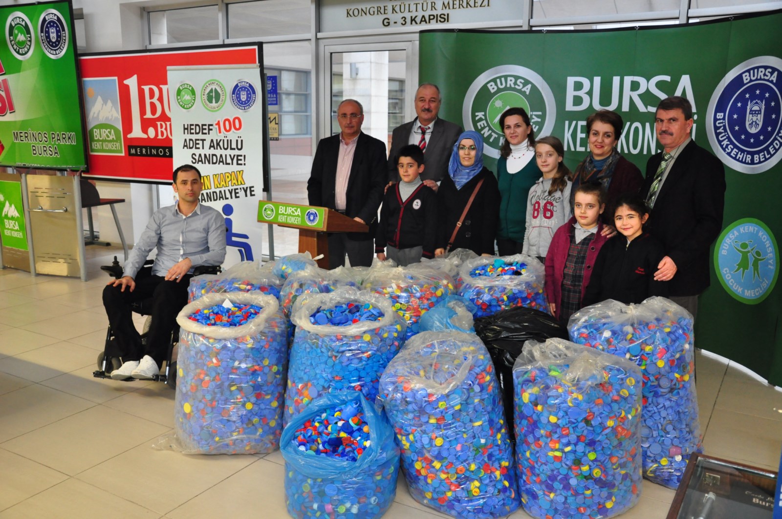 Plastik kapakların geri dönüşümüyle alınacak akülü arabaları ihtiyaç sahibi engelli vatandaşlara ulaştırmak amacıyla Bursa Kent Konseyi tarafından gerçekleştirilen projeye öğrenciler büyük ilgi gösteriyor. Fatih İlköğretim Okulu Müdürü Haluk Türköz’ün koordinasyonunda öğretmen ve öğrencilerin katkılarıyla toplanan kapaklar, Bursa Kent Konseyi yetkililerine teslim edildi.
