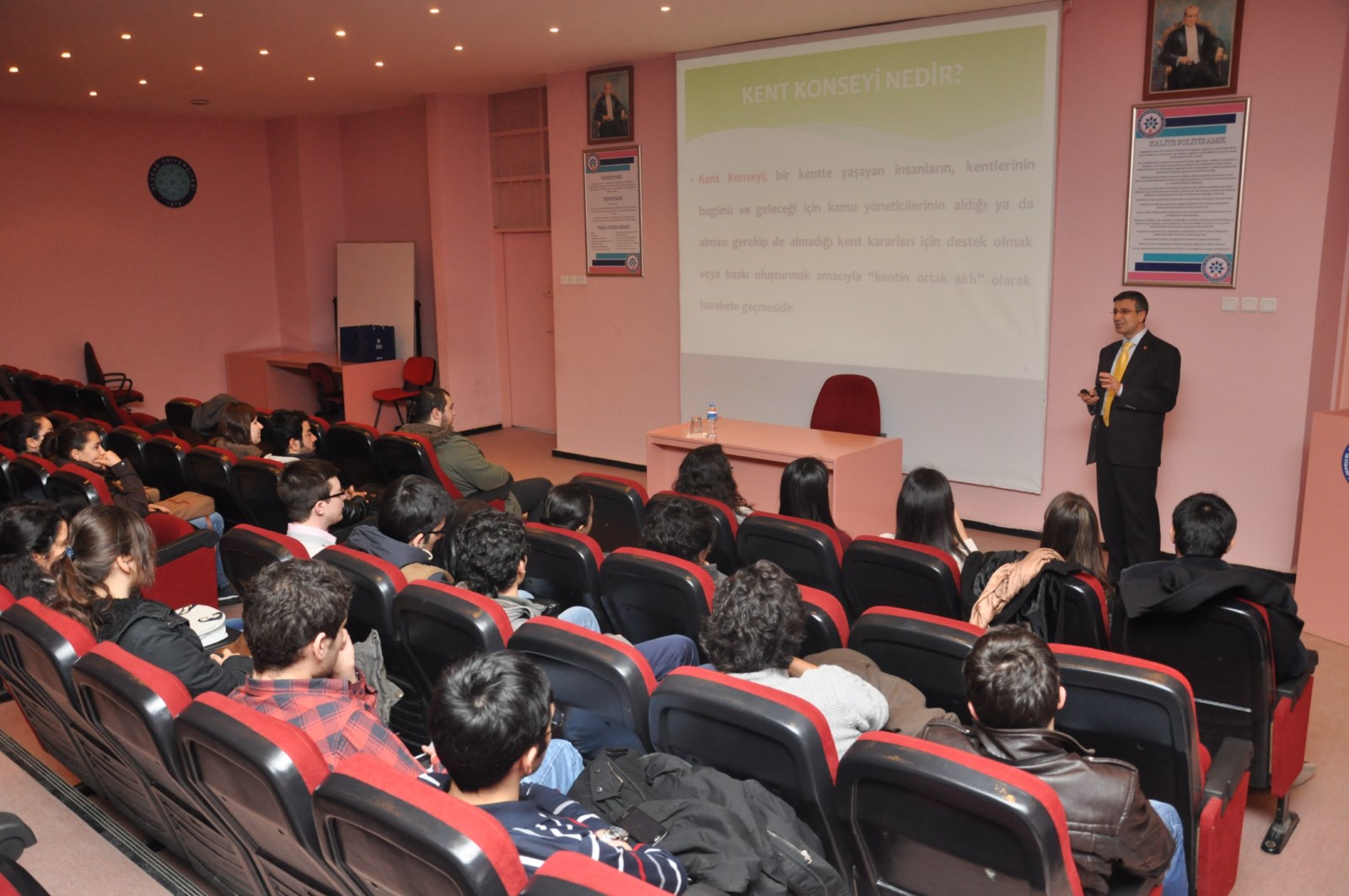 Uludağ Üniversitesi İktisadi ve İdari Bilimler Fakültesi seminer salonunda gerçekleştirilen konferansa Kamu Yönetimi Topluluğu üyeleri katıldı. Kent konseylerinin 5393 sayılı Belediye Kanunu’nun 76. Maddesi’nde tanımlandığını ifade eden BKK Genel Sekreteri Enes Battal Keskin, kent konseylerinin kamu yönetimi, özel sektör ve sivil toplum kuruluşları dışında bir platform olduğunu hatırlattı. Kent konseyinin aslında kamu ile sivil toplum arasında aracı bir mekanizma görevi yürüttüğüne değinen Keskin, “Kent Konseyi; bir kentte yaşayan insanların, kentlerinin bugünü ve geleceği için kamu yöneticilerinin aldığı ya da alması gerekip de almadığı kent kararları için destek olmak veya baskı oluşturmak amacıyla “kentin ortak aklı” olarak harekete geçmesidir. Kent konseylerinin oluşumda belediyelere düşen görev ise faaliyetlerinin etkili ve verimli yürütülmesi konusunda yardım ve destek sağlamasıdır” dedi.