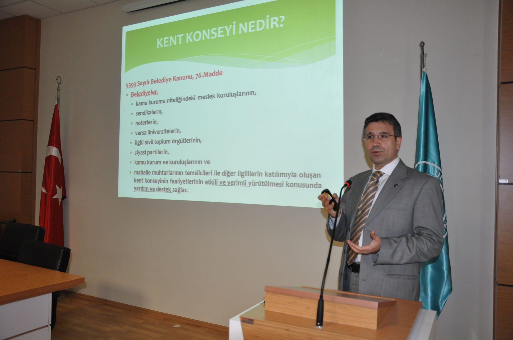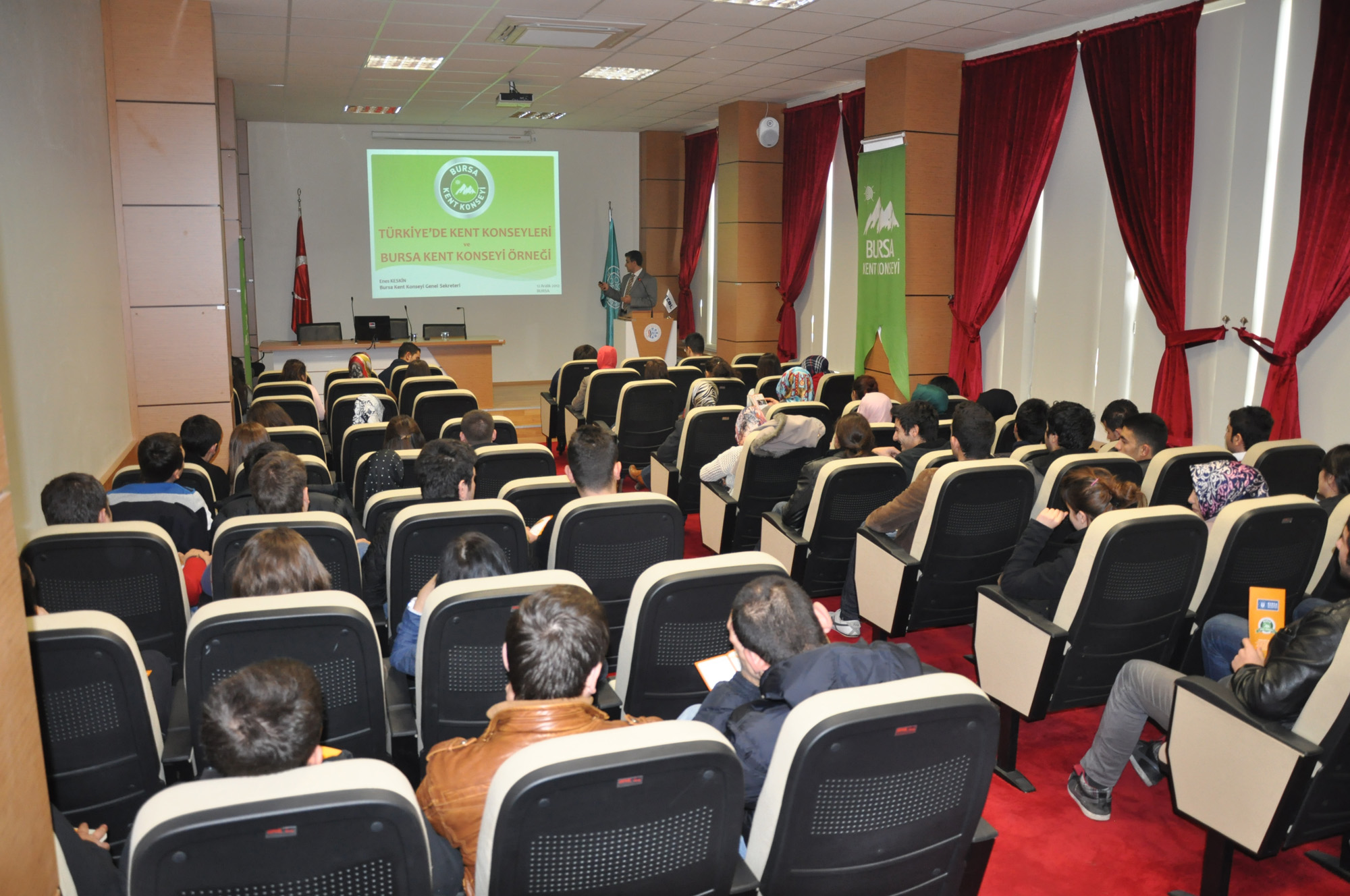 Uludağ Üniversitesi Sosyal Bilimler Meslek Yüksek Okulu seminer salonunda gerçekleştirilen konferansa Yerel Yönetimler Bölümü öğrencileri yoğun ilgi gösterdi. Bursa Kent Konseyi Genel Sekreteri Enes Keskin, kent konseyi kanununda tanımlanmış bir yapı olduğunu söyledi. 5393 sayılı Belediye Kanunu’nun 76. Maddesi’nde kent konseyinin tanımlandığını ifade eden Keskin, “Yasaya göre Kent konseyi, kent yaşamında; kent vizyonunun ve hemşehrilik bilincinin geliştirilmesi, kentin hak ve hukukunun korunması, sürdürülebilir kalkınma, çevreye duyarlılık, sosyal yardımlaşma ve dayanışma, saydamlık, hesap sorma ve hesap verme, katılım ve yerinden yönetim ilkelerini hayata geçirmeye çalışır. Kent konseyi dediğimiz yapı kamu yönetimi, özel sektör ve sivil toplum kuruluşları dışında bir platformdur. Kamu yönetimimizde yeni bir alana denk geliyor. Kent Konseyi aslında kamu ile sivil toplum arasında aracı bir mekanizma görevi görüyor. Kent Konseylerinin oluşumda belediyelere düşen görev ise faaliyetlerinin etkili ve verimli yürütülmesi konusunda yardım ve destek sağlamasıdır” diye konuştu.