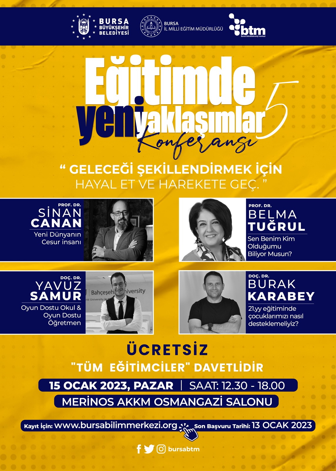 Büyükşehir Belediyesi’nin ‘Geleceği Şekillendirmek İçin Hayal Et ve Harekete Geç’ temasıyla bu yıl 5’incisini düzenleyeceği Eğitimde Yeni Yaklaşıklar Konferansı, 15 Ocak 2023 Pazar günü 12.30 – 18.00 saatleri arasında Atatürk Kongre ve Kültür Merkezi Osmangazi Salonu’nda gerçekleştirilecek. Bursa’daki tüm eğitimciler ve eğitime gönül verenlere açık olan ücretsiz konferansta, Prof. Dr. Sinan Canan, Prof. Dr. Belma Tuğrul, Doç. Dr. Yavuz Samur ve Doç. Dr. Burak Karabey, sunumlarıyla eğitim modellerinde yeni yaklaşımları ele alacak.