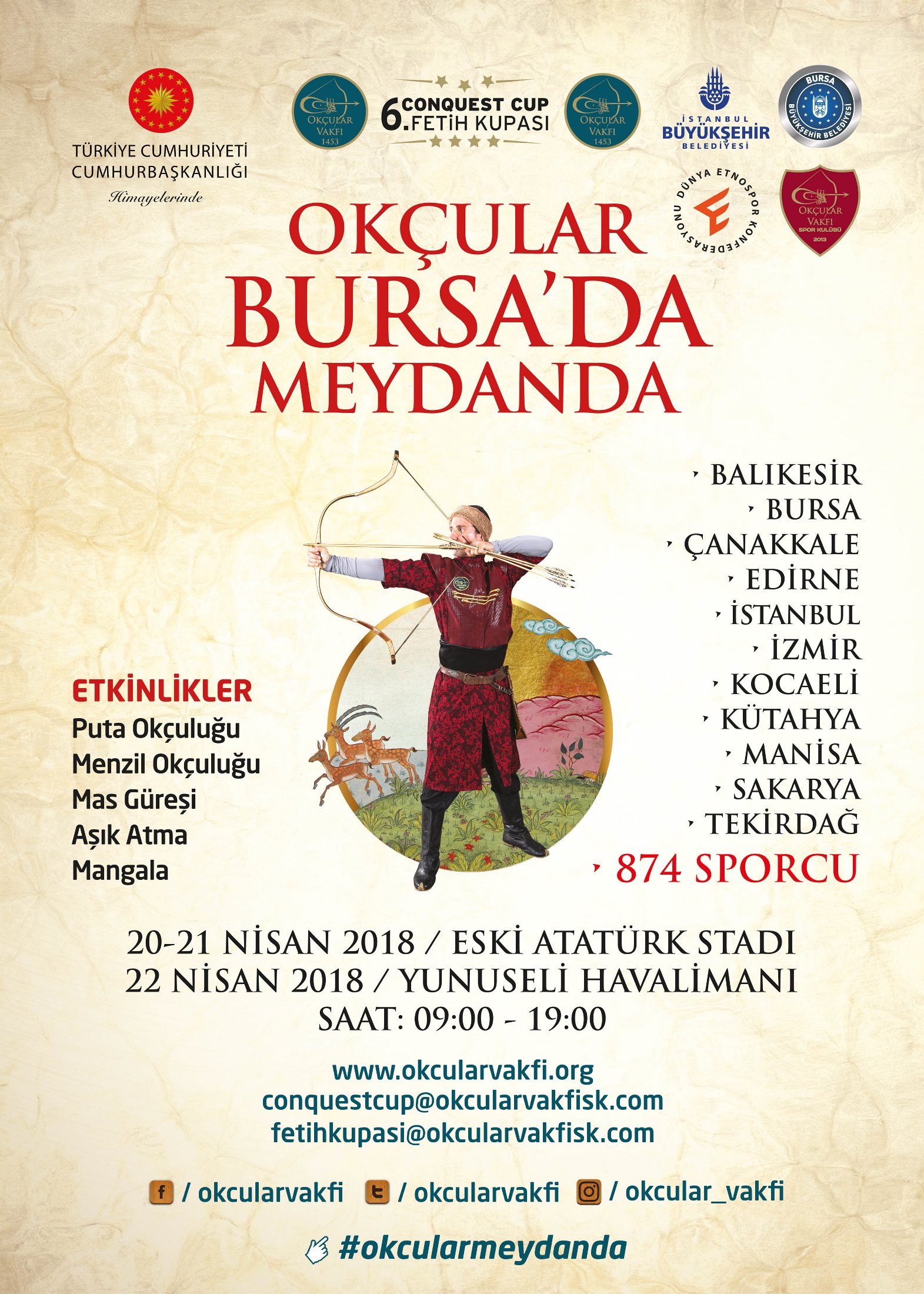 Geleneksel Türk Okçuluğu Bölge Elemelerinin Bursa ayağına; Dünya Etnospor Konfederasyonu Başkanı Bilal Erdoğan, Bursa Valisi İzzettin Küçük, Büyükşehir Belediye Başkanı Alinur Aktaş ve Okçular Vakfı Başkanı Haydar Ali Yıldız da katılacak.
