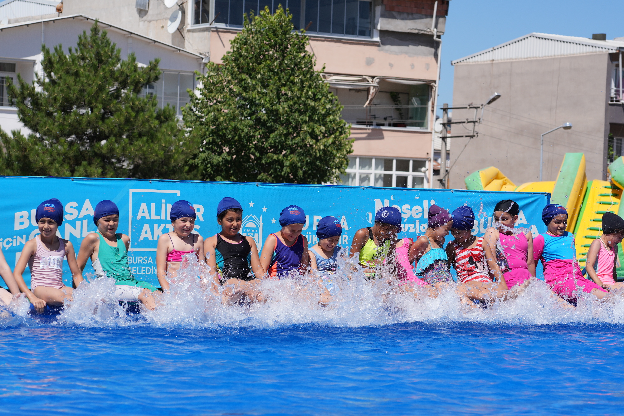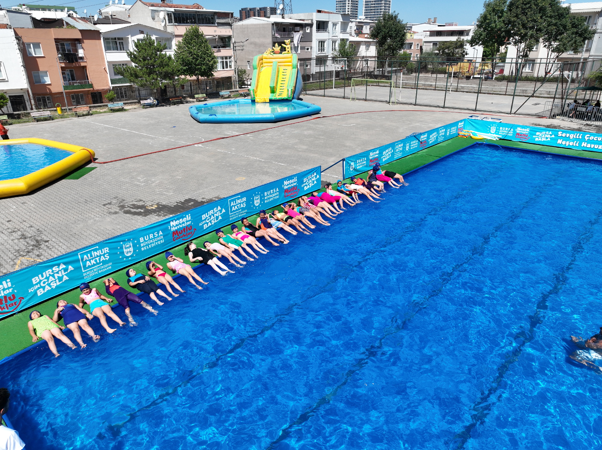 BURSA – Bursa Büyükşehir Belediyesi, ‘Neşeli Havuzlar Mutlu Çocuklar’ projesi kapsamında kurduğu portatif yüzme havuzları ile okul bahçelerini adeta tatil köyüne dönüştürdü. 3 ilçedeki 4 okul bahçesine kurulan portatif havuzlarda çocuklara ücretsiz yüzme eğitimi verilirken, isteyen çocuklar ise aquaparkta eğlencenin tadını çıkarıyor.