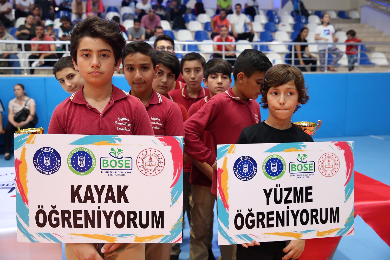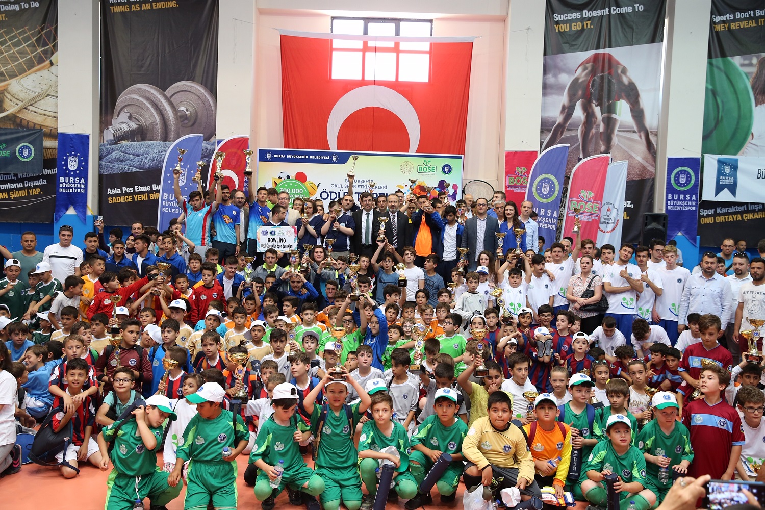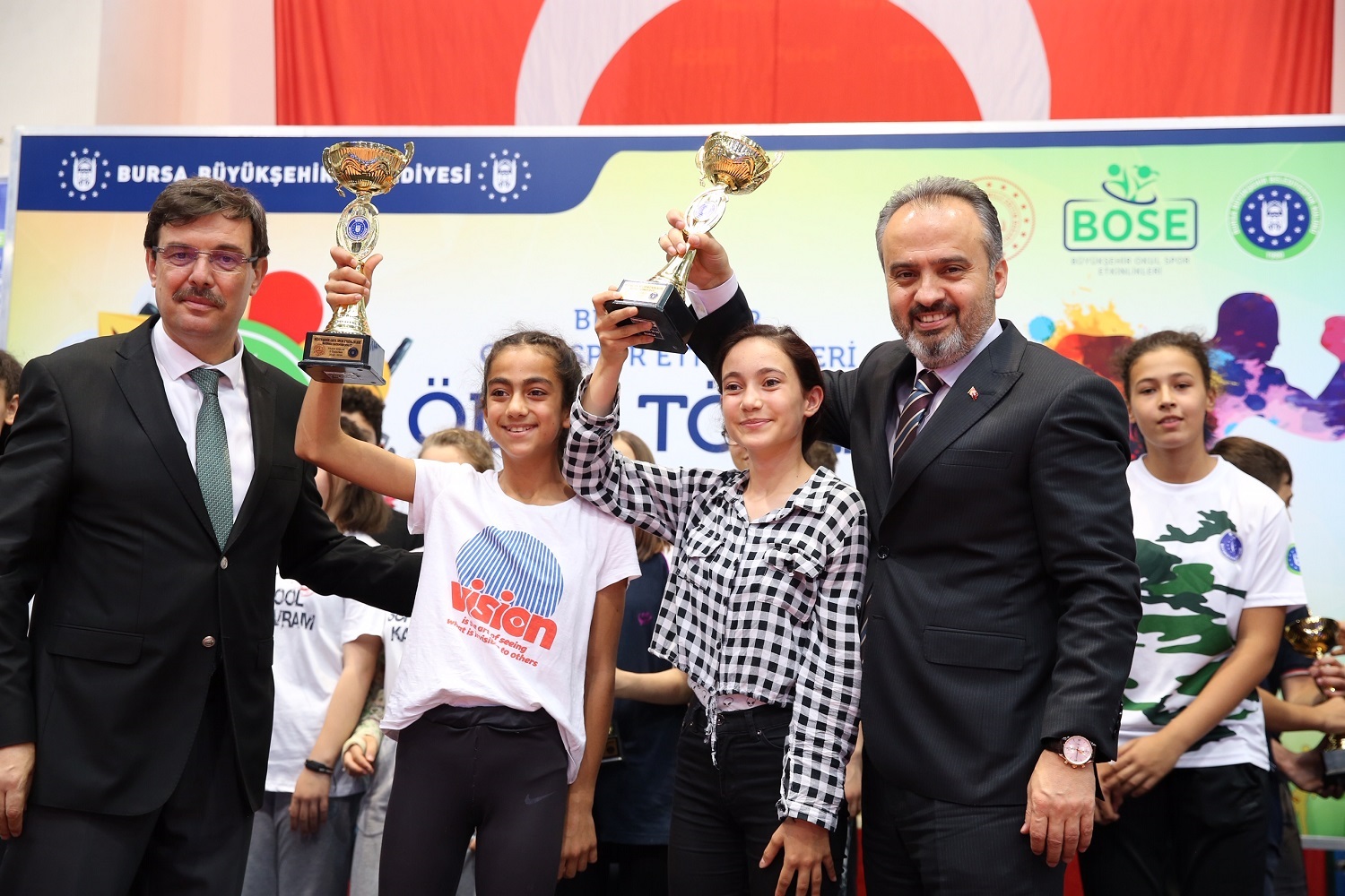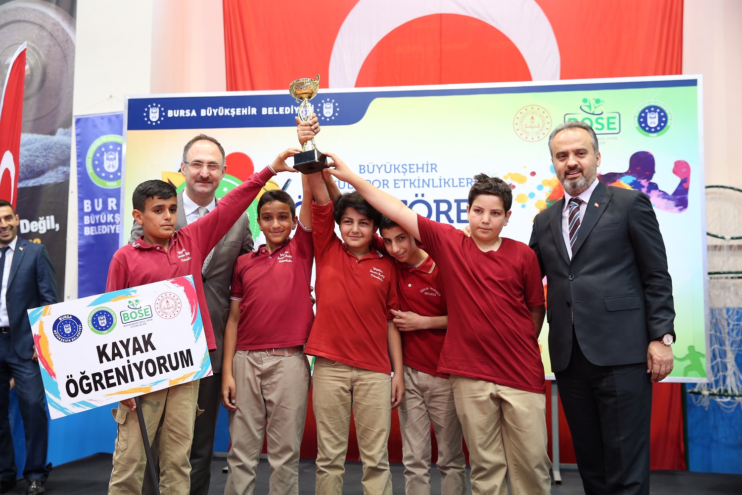 Sağlıklı şehir Bursa’da çocukları sporla buluşturan ‘Büyükşehir Okul Spor Etkinlikleri (BOSE)’ ödül ve kapanış töreni, coşkuyla gerçekleştirildi. Fethiye Spor Tesisleri’nde düzenlenen törene, sporcu öğrencilerin ödül heyecanı damgasını vurdu. Büyükşehir Belediye Başkanı Alinur Aktaş, İl Milli Eğitim Müdürü Sabahattin Dülger ve AK Parti Nilüfer İlçe Başkanı Ufuk Ay da bu heyecanlı günlerinde minikleri yalnız bırakmadı. Ödüllerin verildiği salonda branşlarına göre takım düzeni oluşturan öğrenciler, birincilik-ikincilik ve üçüncülük kupalarını Başkan Aktaş, İl Milli Eğitim Müdürü Dülger ve AK Parti Nilüfer İlçe Başkanı Ufuk Ay’ın elinden aldı.