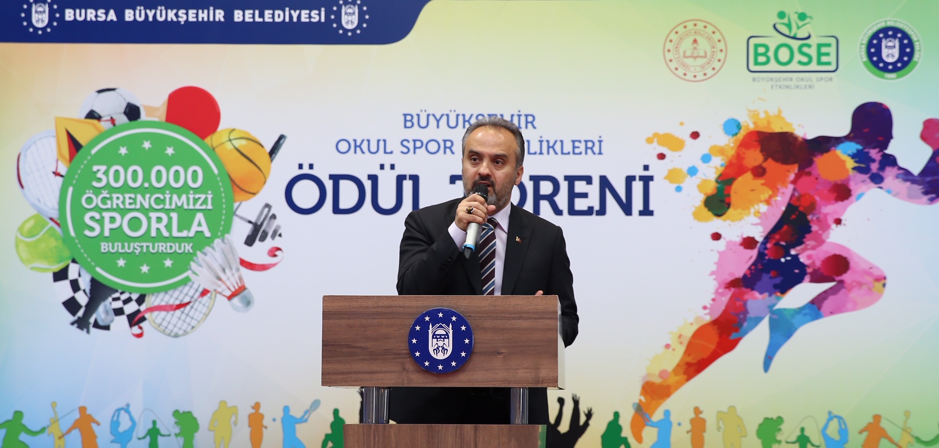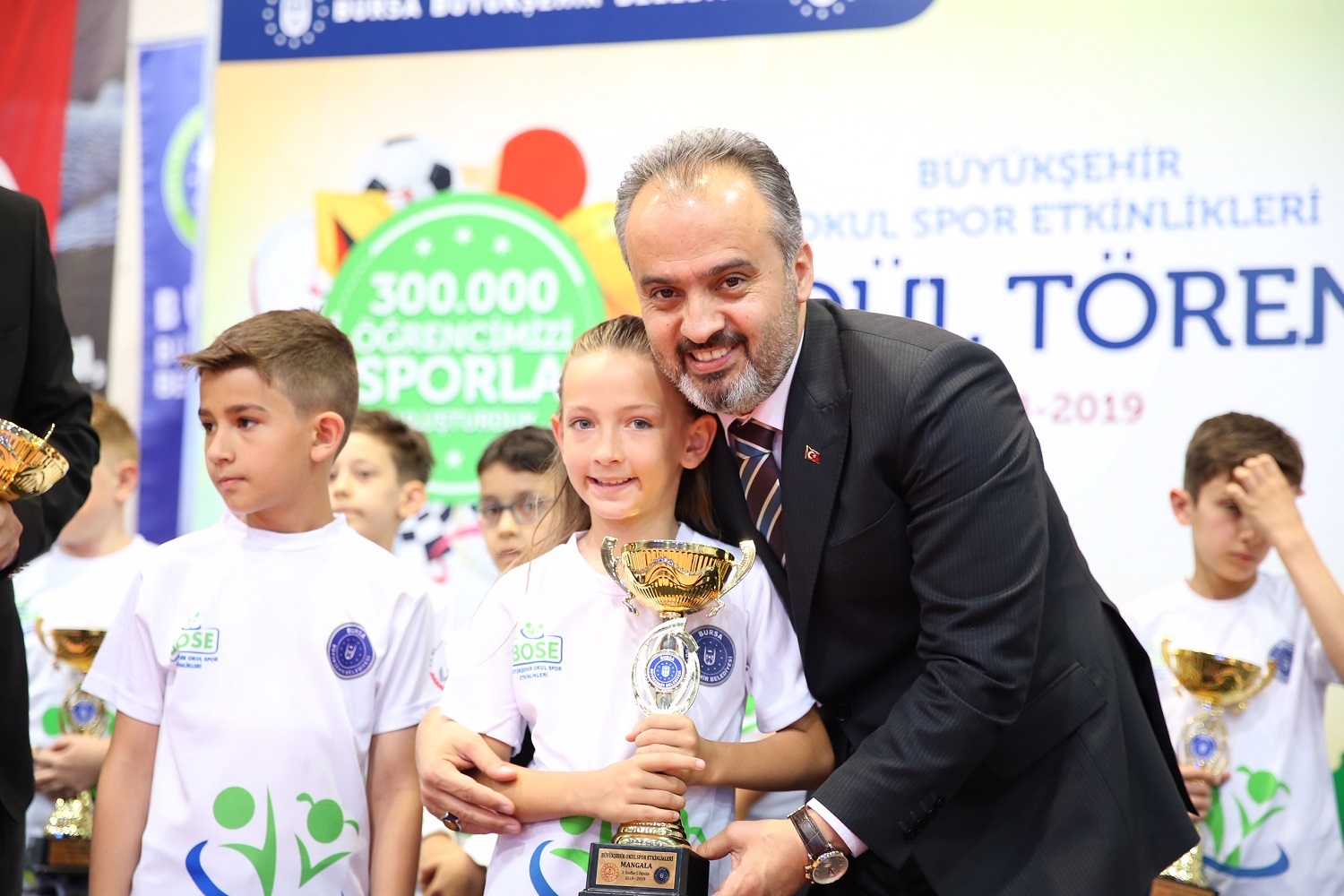 BURSA - Bursa Büyükşehir Belediyesi’nin ‘öğrencilere spor alışkanlığını kazandırmak amacıyla’ İl Milli Eğitim Müdürlüğü ile birlikte düzenlediği Bursa Okul Sporları Etkinlikleri’nin (BOSE) ödül ve kapanış töreni, Başkan Alinur Aktaş ile 524 öğrencinin katıldığı renkli programla yapıldı. Büyükşehir Belediye Başkanı Alinur Aktaş, toplumda fark edilmese de çocukları gelecekte bekleyen en büyük tehlikenin fiziksel etkinlik eksikliği olduğunu belirterek, bunun önüne geçebilmek için 2018-2019 öğretim yılı içerisinde 300 bini aşkın çocuğa spor yapma fırsatını verdiklerini söyledi.
