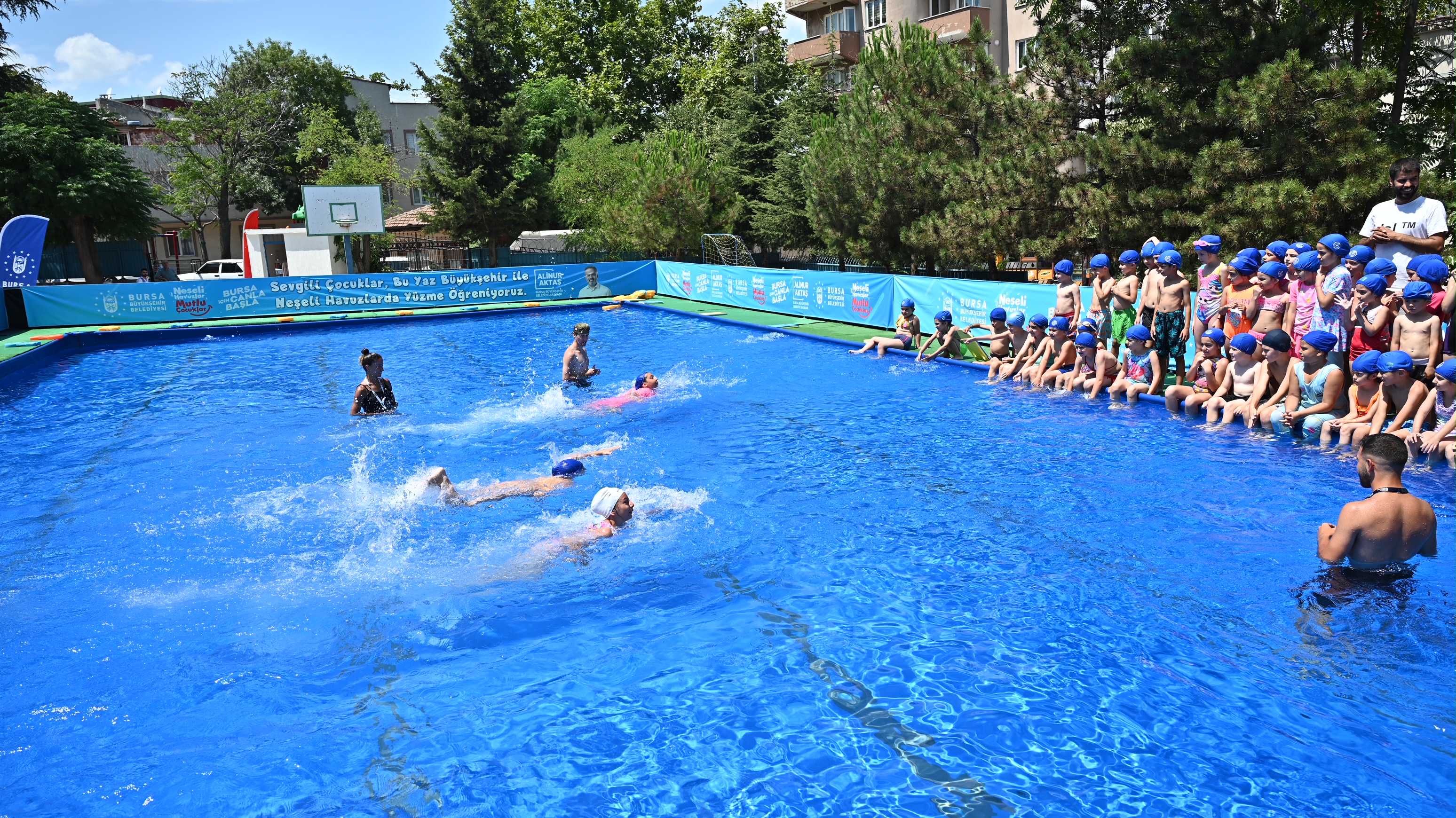 BURSA – Bursa Büyükşehir Belediyesi, ‘Neşeli Havuzlar Mutlu Çocuklar’ projesi kapsamında kurulan portatif yüzme havuzları ile okul bahçelerini yüzme eğitim merkezlerine dönüştürdü. Çocukları eğitim aldıkları havuzda ziyaret eden Büyükşehir Belediye Başkanı Alinur Aktaş, “Çocuklarımızın neşesine şahit olmak büyük mutluluk” dedi.
