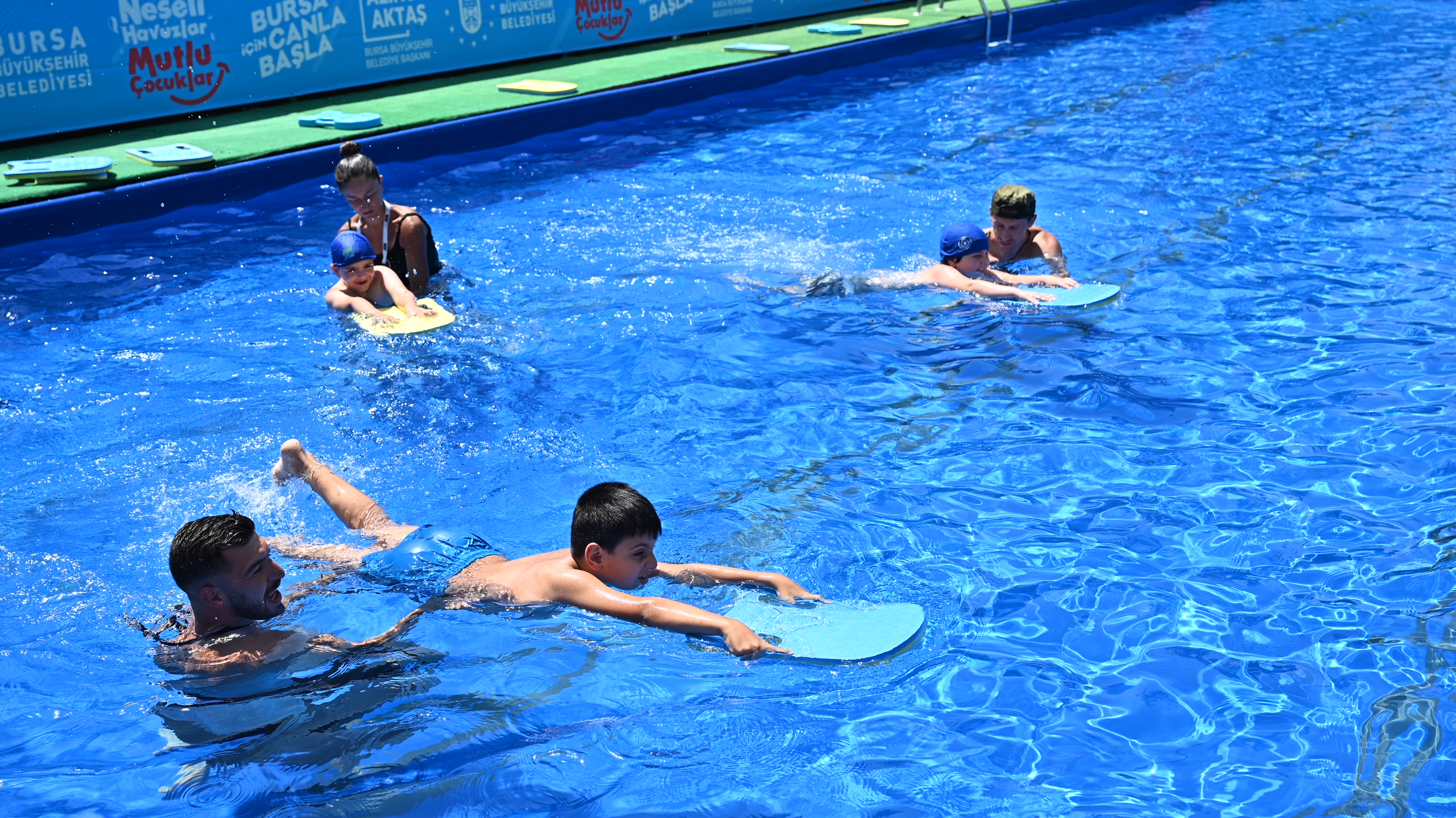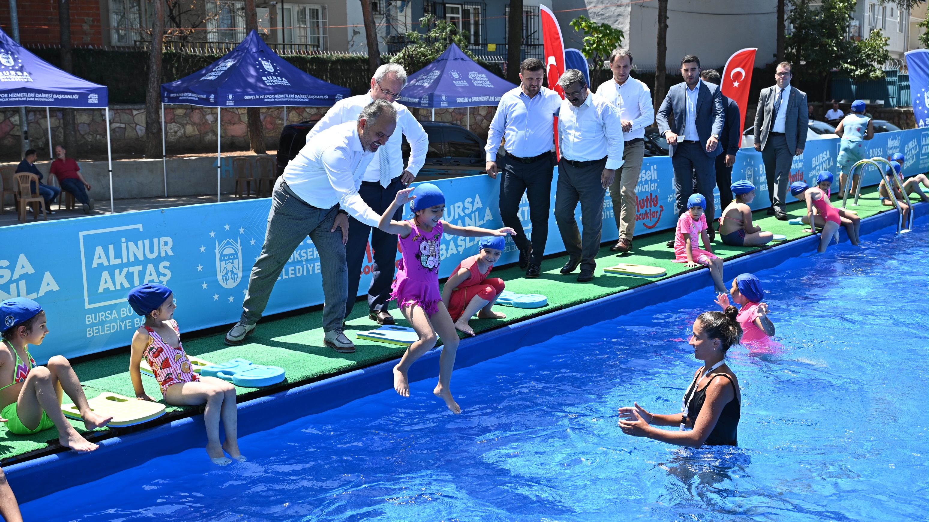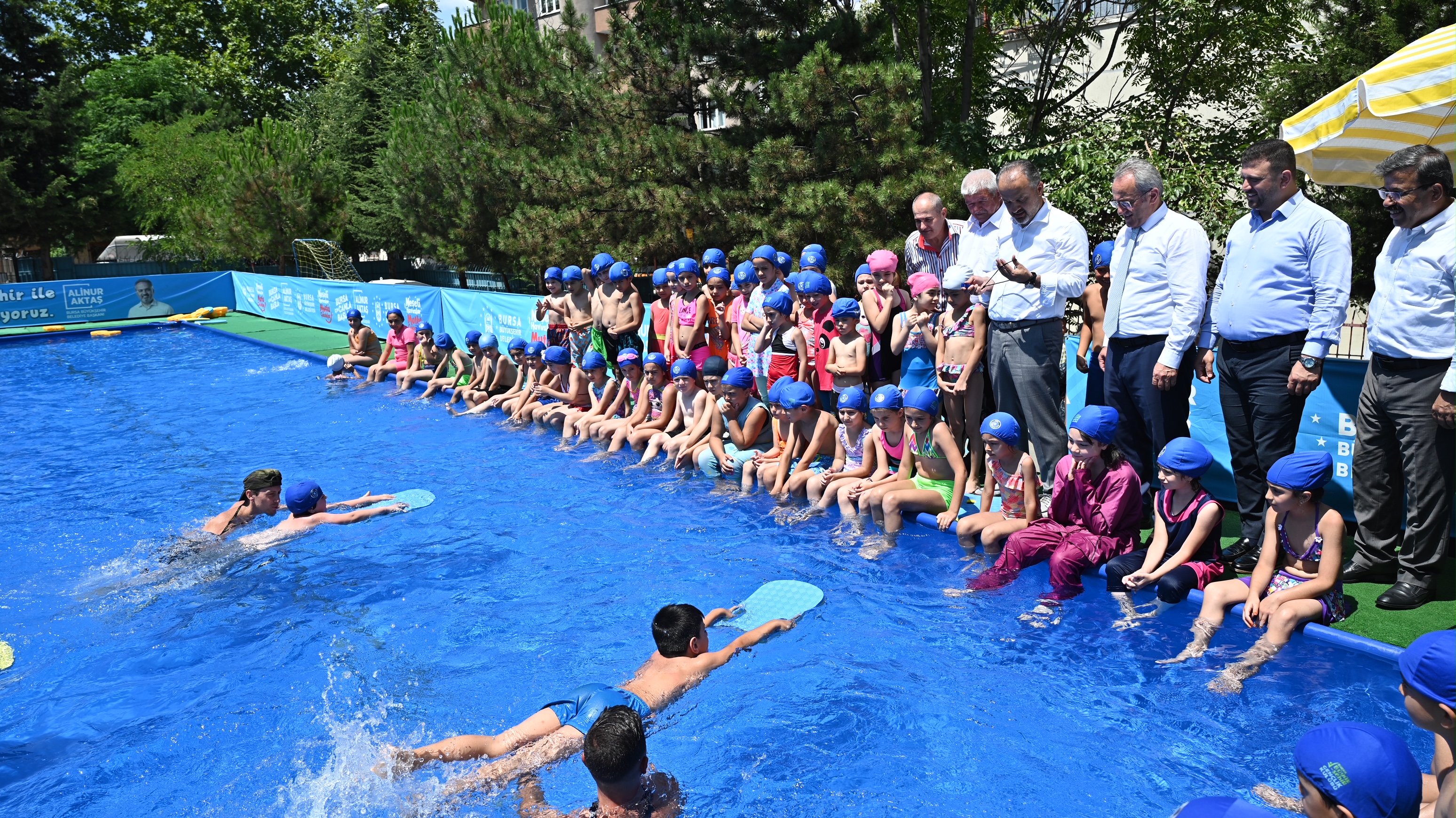 Proje kapsamında yaklaşık 5 bin çocuğun yüzme sporuyla buluşması hedeflenirken, Bursa Büyükşehir Belediye Başkanı Alinur Aktaş da Yıldırım ilçesindeki Fevzi Çakmak İlköğretim Okulu bahçesine kurulan havuzda yüzme eğitimi alan çocukları ziyaret etti. Küçük yüzücülerle sohbet edip, şakalaşan Başkan Aktaş, “Bursa’da hayat çocuklara ve gençlere güzel derken, aslında bunu bir motto olarak değil, bir yaşam biçimi olarak hayata geçiriyoruz ve buna dair yatırımlar yapıyoruz. Bunlar bizim geleceğimiz, bunlar bizim yarınlarımız, şehrimizin ve ülkemizin ilerdeki yöneticileri. Onları sporla, kültürle, bilimle ve sanatla büyütmek istiyoruz. Bursa’da 13 tane yarı olimpik kapalı yüzme havuzumuz var ama 3 milyonu aşan nüfusa çok yeterli bir sayı değil. Kurduğumuz portatif havuzlarla çocuklarımızı bu imkanla buluşturuyoruz. Onların neşelerine şahit olmak benim için de büyük bir mutluluk” diye konuştu.