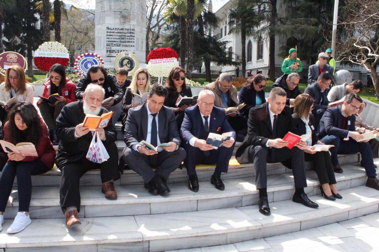 BURSA – ‘55. Kütüphaneler Haftası’ etkinlikleri kapsamında ‘Okumak Değiştirir’ sloganıyla bir araya gelen vatandaşlar, Heykel’de Atatürk Anıtı önünde hep birlikte kitap okudu.