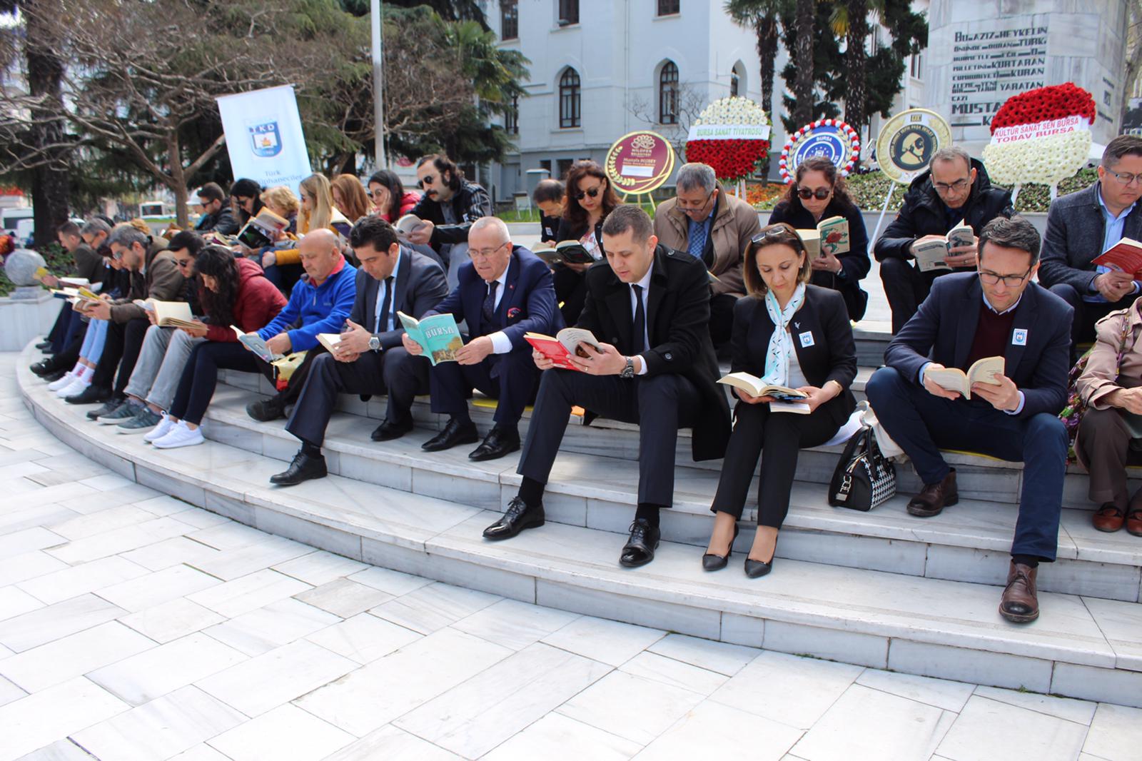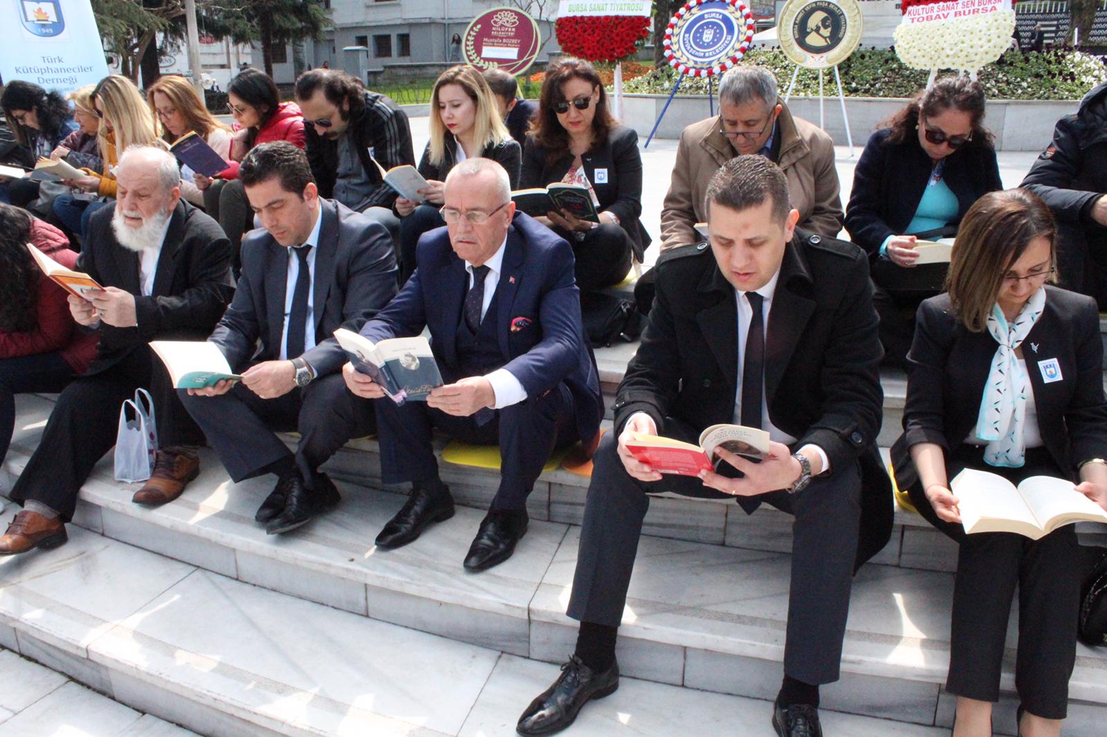 Bursa Valiliği öncülüğünde Türk Kütüphaneciler Derneği Bursa Şubesi organizasyonunda gerçekleştirilen, Büyükşehir Belediyesi ve Bursa Kent Konseyi’nin de katkı sağladığı ‘55. Kütüphaneler Haftası’ etkinlikleri kapsamında, toplumda kitap okuma farkındalığı oluşturmak amacıyla bir araya gelen vatandaşlar, Heykel Atatürk Anıtı önünde hep birlikte kitap okudu.