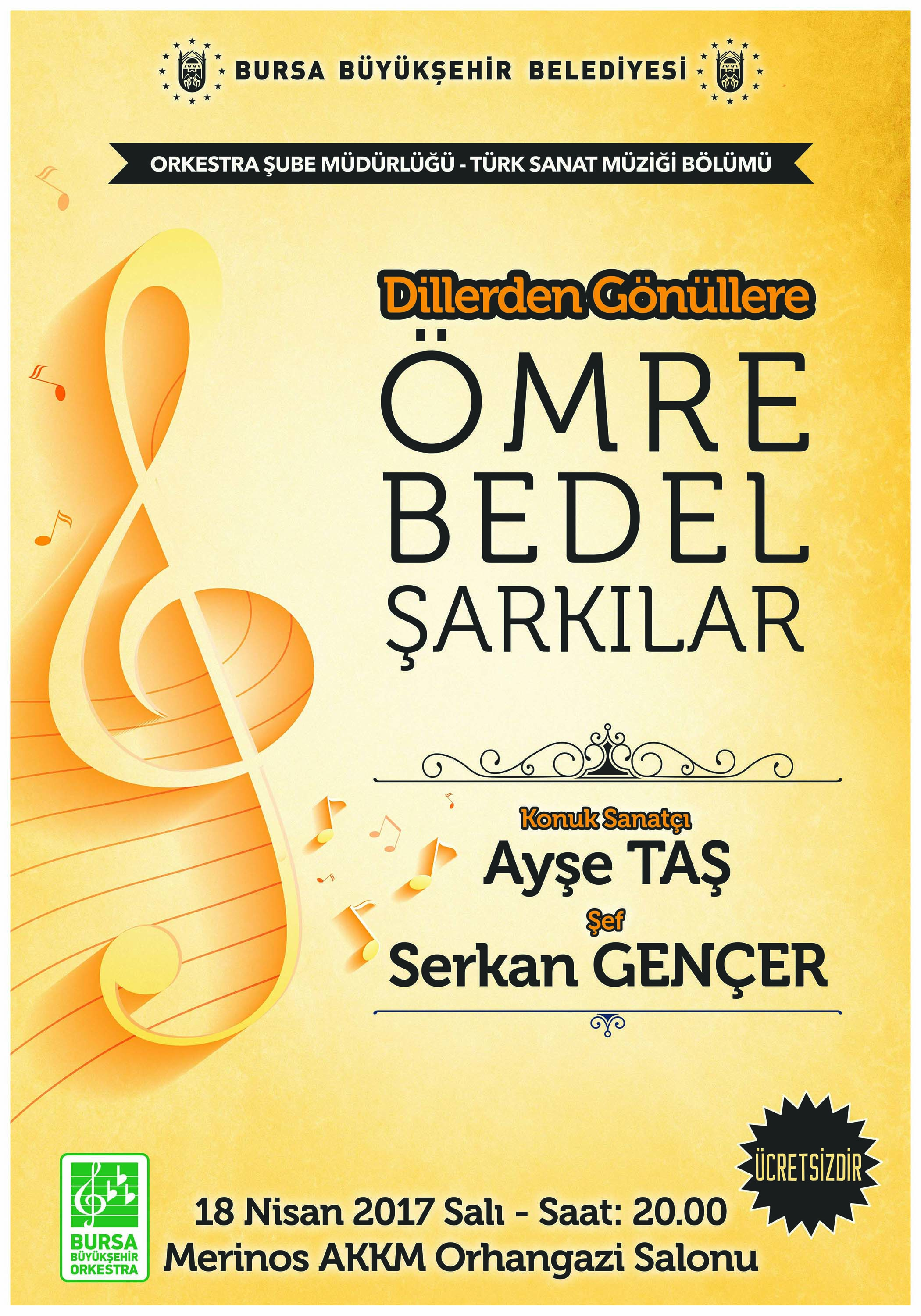 BURSA – Bursa Büyükşehir Belediyesi Orkestra Şube Müdürlüğü Türk Sanat Müziği Bölümü’nün ‘Dillerden Gönüllere Ömre Bedel Şarkılar’ temalı konseri, 18 Nisan Salı, saat 20.00’da Atatürk Kongre Kültür Merkezi (Merinos AKKM) Orhangazi Salonu’nda gerçekleştirilecektir.