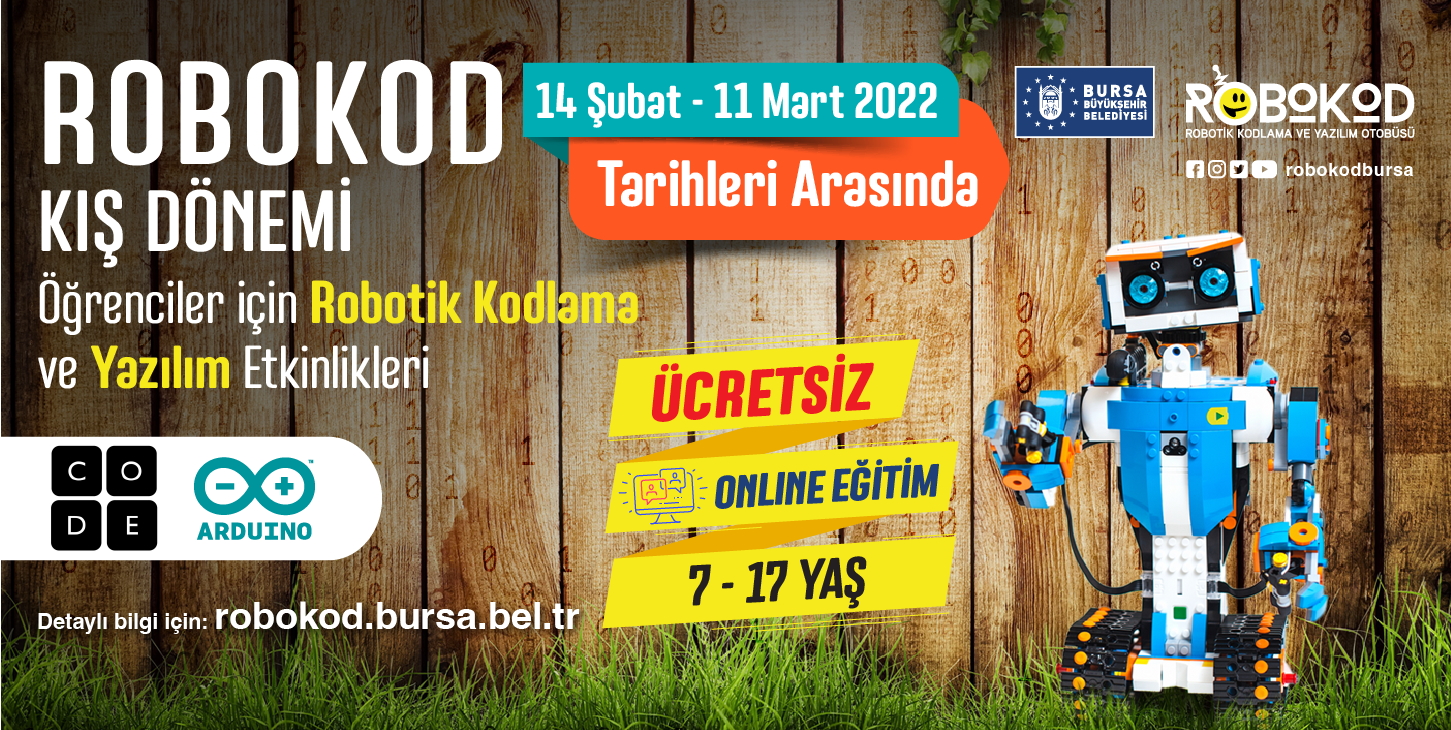 Robokod Kodlama ve Yazılım otobüslerinde yüz yüze verilen eğitimler, pandemi nedeniyle online yapılmaya devam ediyor. Katılımın tamamen ücretsiz olduğu eğitimler, zoom programı üzerinden online (Canlı) olacak. 7-10 ve 11-17 yaş arası öğrencilerin katılabileceği eğitimler, 14 Şubat–11 Mart tarihleri arasında 4 hafta süreyle yapılacak.