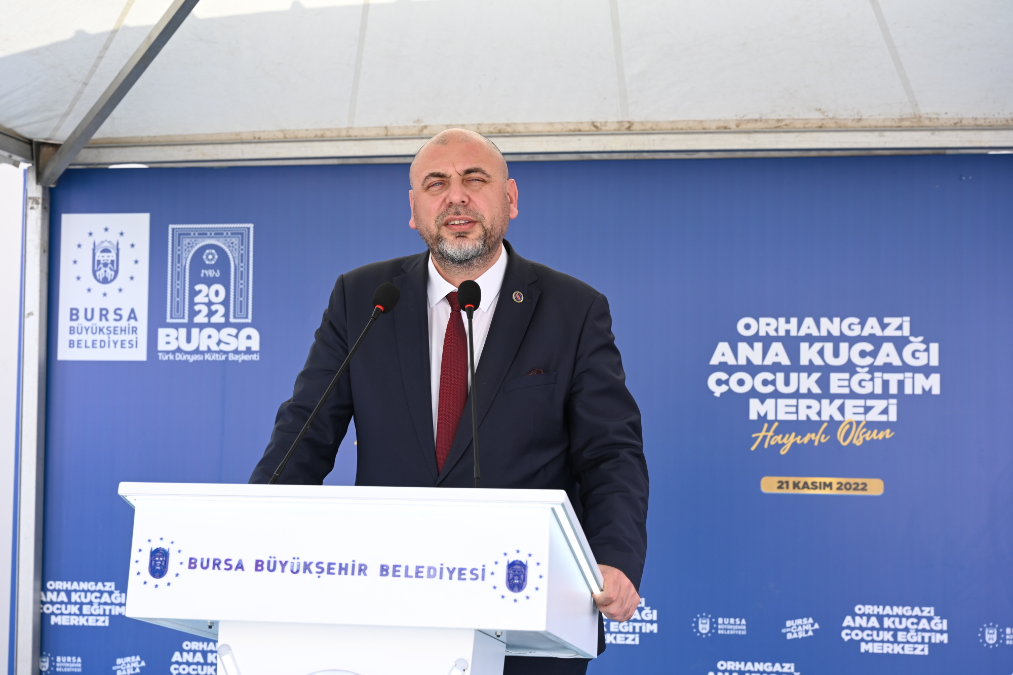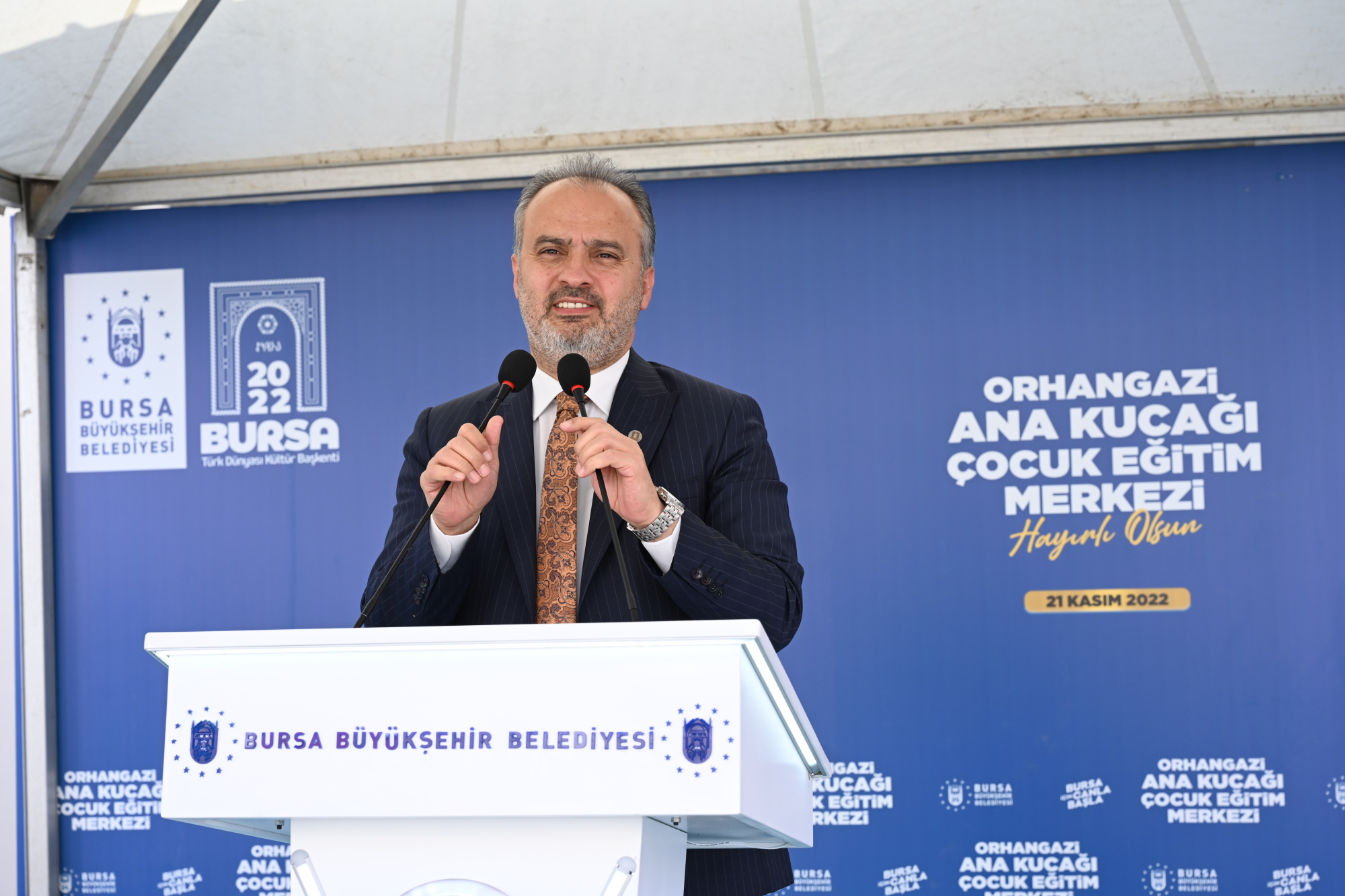 Ana Kucaklarının tüm şehri sarmaya devam ettiğini ve dönem sonuna kadar sayıyı 50’ye çıkarmayı hedeflediklerini belirten Bursa Büyükşehir Belediye Başkanı Alinur Aktaş, Orhangazi’deki 3 sınıflı merkezin talepleri karşılamakta zorlandığını bu nedenle ilçeye 8 sınıflı modern bir Ana Kucağı kazandırdıklarını söyledi. Oyun çağındaki 4-6 yaş arasındaki çocuklara vatan, millet ve bayrak sevgisini öğretmeye çalıştıklarını ifade eden Başkan Aktaş, “Sokaklarımızın daha güzel olmasını, şehirlerimizin daha temiz olmasını, insanlarımızın daha güler yüzlü olmasını, tatlı dilli olmasını, ticaretin daha keyifli olmasını, daha dürüst olmasını arzu ediyorsak, yapacağımız tek bir şey var: Geleceğimiz olan şu yavrularımıza yatırım yapmak. Önemli olan bizim bu çocukların yüreklerini, gönüllerini ve beyinlerini doyurmaktır. Evet yaptığımız farklı farklı çalışmalar var. Altyapı ile alakalı, üst yapı ile alakalı spor tesisleriyle alakalı, restorasyonla alakalı çalışmalarımız var. Fakat bizim özellikle geleceğimiz olan yavrularımıza yaptığımız bu yatırım bizim için çok kıymetli ve değerli. Geleceğin teminatı olan çocuklarımıza Büyükşehir Belediyesi olarak böyle bir destek vermekten dolayı son derece mutluyuz, bahtiyarız” dedi.
