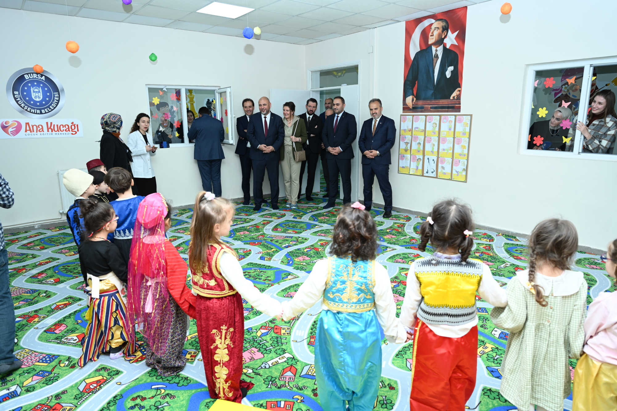 Büyükşehir Belediyesi’nin özellikle dar gelirli ailelerin çocuklarının da okul öncesi eğitim hizmetlerinden faydalanabilmesi amacıyla 2019 yılında 6 merkezle başlattığı Ana Kucakları, bugün adeta dev bir eğitim kurumuna dönüştü. Halen 180’i aşkın öğretmen ve yaklaşık 2 bin öğrenci eğitimlerin devam ettiği 21 Ana Kucağına sürekli yenilerini ekleyen Büyükşehir Belediyesi, diğer taraftan mevcut merkezleri de ihtiyaçlar doğrultusunda yeniliyor. Ana Kucaklarının açılan ilk merkezlerinden olan 3 sınıflı Orhangazi Ana Kucağı da 8 sınıflı yeni binasına taşındı. Talepler doğrultusunda daha ferah bir mekana taşınan Ana Kucağı, Büyükşehir Belediye Başkanı Alinur Aktaş, Orhangazi Belediye Başkanı Bekir Aydın, Bursa Milletvekili Zafer Işık ve Orhangazi Kaymakamı Süleyman Özçakıcı’nın da katıldığı törenle eğitime açıldı.