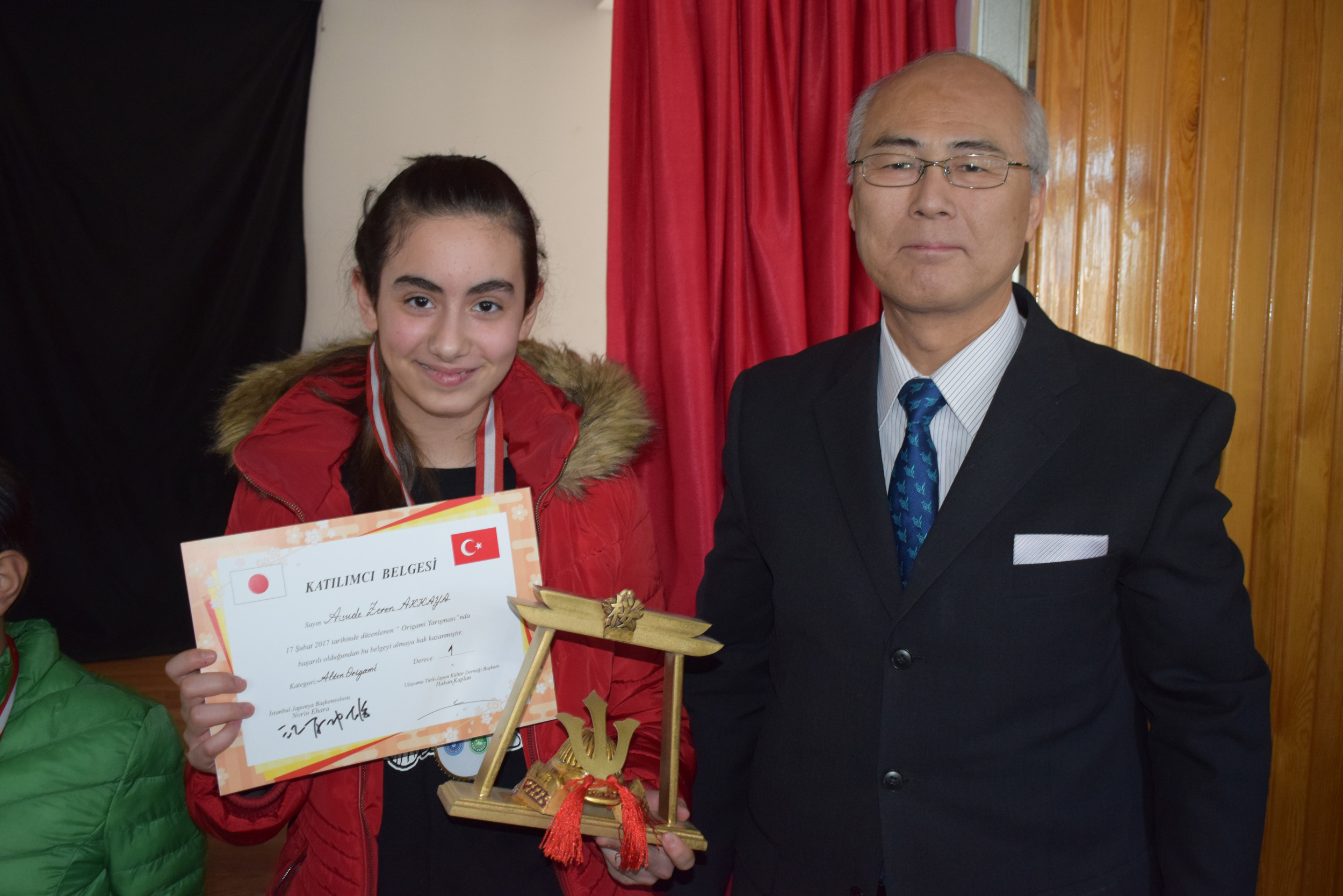 Japonya İstanbul Başkonsolosu Norio Ehara, konuşmasına Türkçe ‘Merhaba’ diyerek başladı. Kağıt katlama sanatı origami yarışmasının Bursa’da yapılmasının kendisini mutlu ettiğini dile getiren Ehara, origaminin Japonya’da yüzyıllardır yapılan bir sanat olduğunu, özellikle çocuklara ve kadınlara teşvik edildiğini ifade etti. Türkiye ile Japonya arasında güzel dostluk ilişkileri bulunduğunu hatırlatan Ehara, “Bu kapsamda origami yarışması yapılması iki ülke arasında sıcak ilişkilerin gelişimine katkı sunacaktır. Türk milletinin de bir gün Japonya’ya gelip origamiyi yerinde görmesini isterim. Yarışmaya katılan origamiler arasında seçim yaparken çok zorlandık. Birbirinden güzel eserler vardı. Tüm çocukları tebrik ediyorum. Yarışmaya katılan tüm çocuklar benim için birinci olmuştur. Bursa Kent Konseyi ile Bursa Uluyama Türk Japon Kültür Derneği’ne teşekkür ediyorum” dedi.