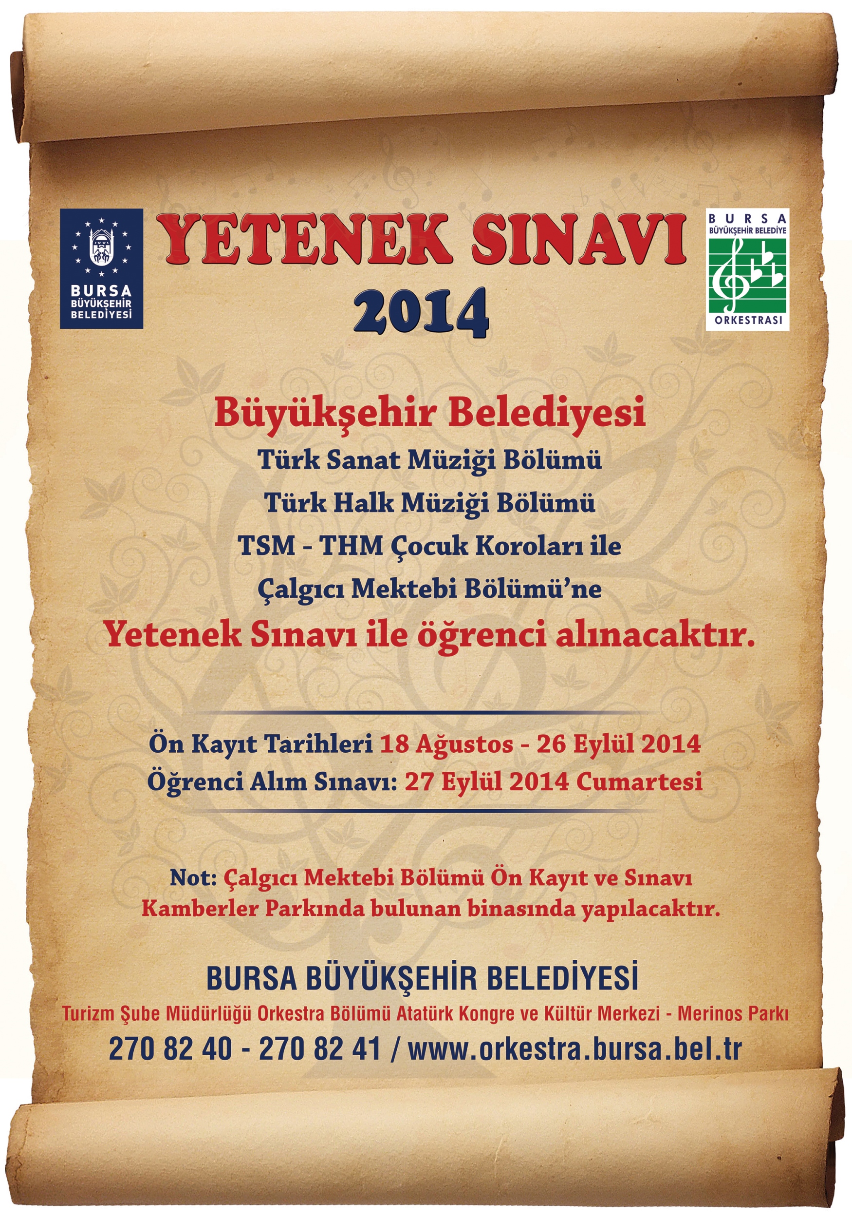 Müzikal yeteneğini geliştirmek isteyen tüm adaylar, Atatürk Kongre Kültür Merkezi’nde faaliyet gösteren Orkestra Şube Müdürlüğü’ne ve Çalgıcı Mektebi için ise Kamberler Parkı’ndaki Çalgıcı Mektebi binasına bizzat başvurabilir veya 270 82 40 ve 270 82 41 numaralı telefonlardan ya da www.orkestra.bursa.bel.tr internet adresinden bilgi alabilirler.