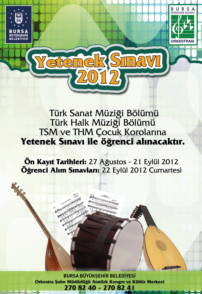 Müzikal yeteneğini geliştirmek isteyen tüm adaylar, Atatürk Kongre Kültür Merkezi’nde faaliyet gösteren Orkestra Şube Müdürlüğü’ne bizzat başvurabilir veya 270 82 40 ve 270 82 41 numaralı telefonlardan bilgi alabilirler.