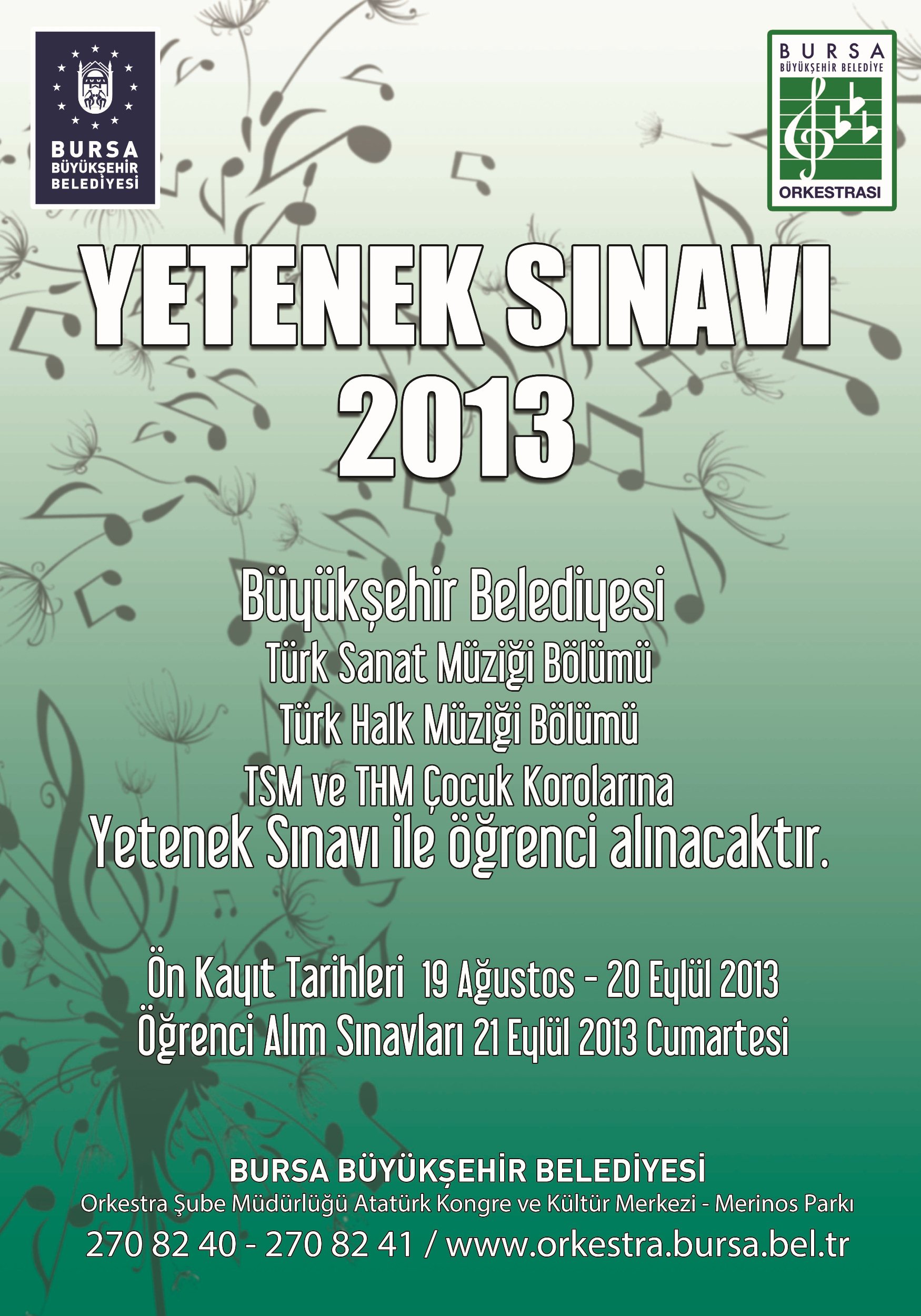 BURSA – Bursa Büyükşehir Belediyesi Orkestrası, 2013 – 2014 öğretim yılında müzikal yeteneğini ortaya çıkarmak isteyen yetenekli öğrencilerini arıyor.