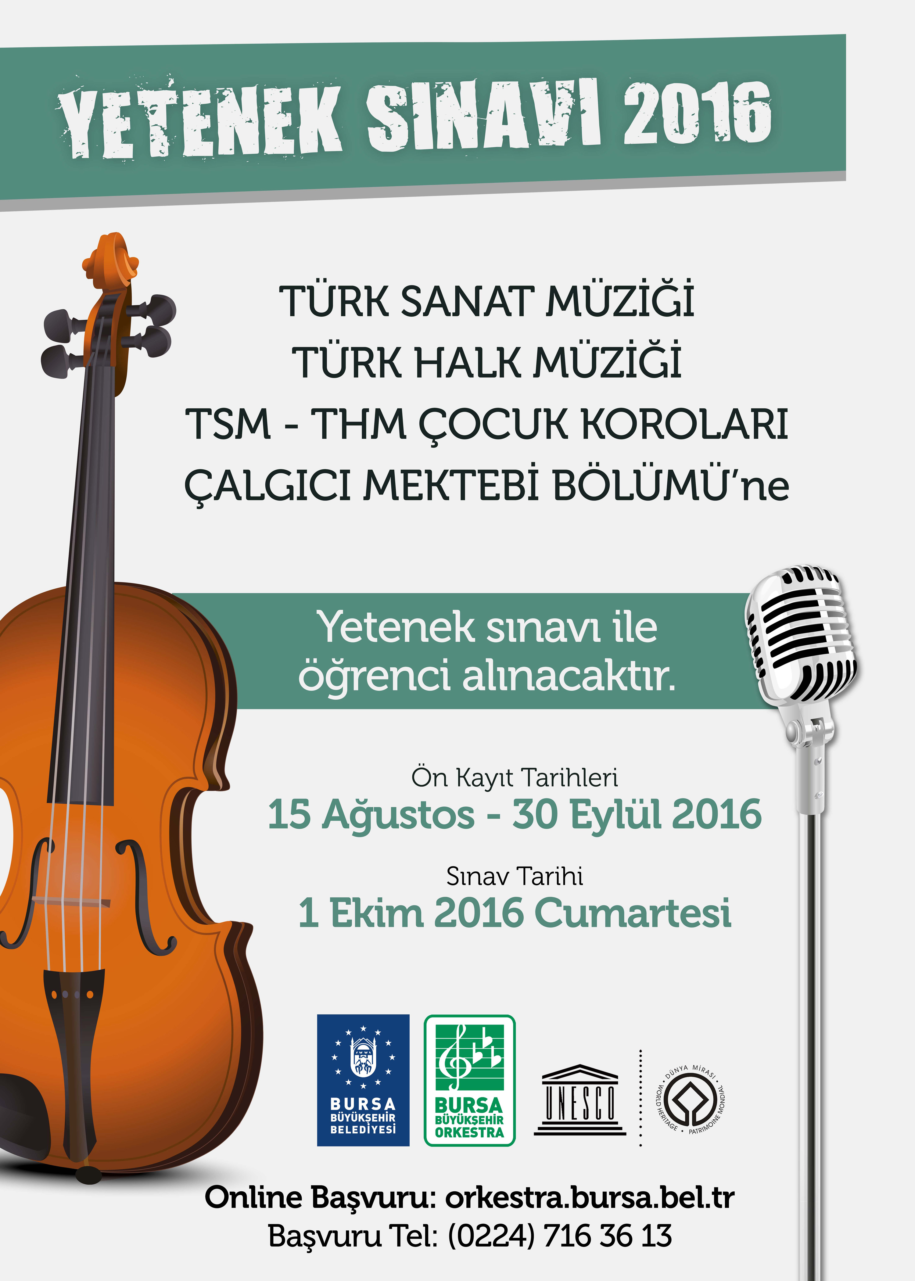 Sanatçı adaylarının yetenek sınavıyla katılacağı eğitimlerde; Türk Sanat Müziği ve Türk Halk Müziği bölümleri, Türk Sanat Müziği ve Türk Halk Müziği çocuk koroları ile Çalgıcı Mektebi’ne katılmak isteyen vatandaşlar, 30 Eylül Cuma gününe kadar ön kayıt yaptırabilecek, 1 Ekim Cumartesi günü de kesin kayıt için sınava girecekler. Müzikal yeteneğini geliştirmek isteyen tüm adaylar, Atatürk Kongre Kültür Merkezi’nde faaliyet gösteren Orkestra Şube Müdürlüğü’ne başvurabilir, (0224)7163613 numaralı telefondan bilgi alabilir veya www.orkestra.bursa.bel.tr internet adresinden online başvuru yaptırabilirler.