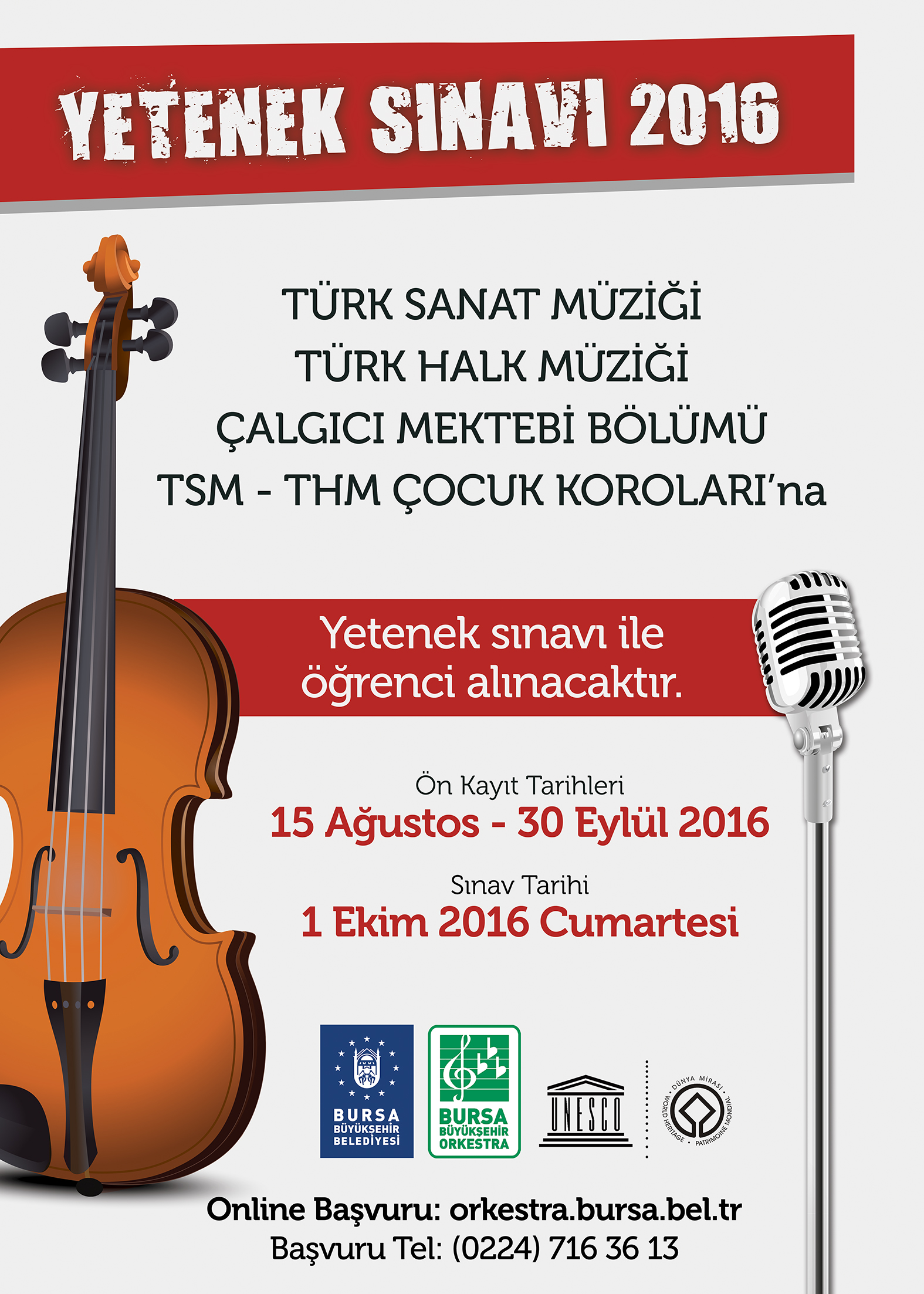 BURSA – Bursa Büyükşehir Belediyesi Orkestrası, 2016 – 2017 eğitim ve öğretim yılında müzikal yeteneğini ortaya çıkarmak isteyen öğrencilerini bekliyor.