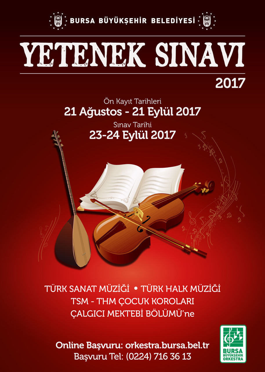 BURSA – Bursa Büyükşehir Belediyesi Orkestrası, 2017 – 2018 eğitim ve öğretim yılında müzikal yeteneğini ortaya çıkarmak isteyen öğrencilerini bekliyor.