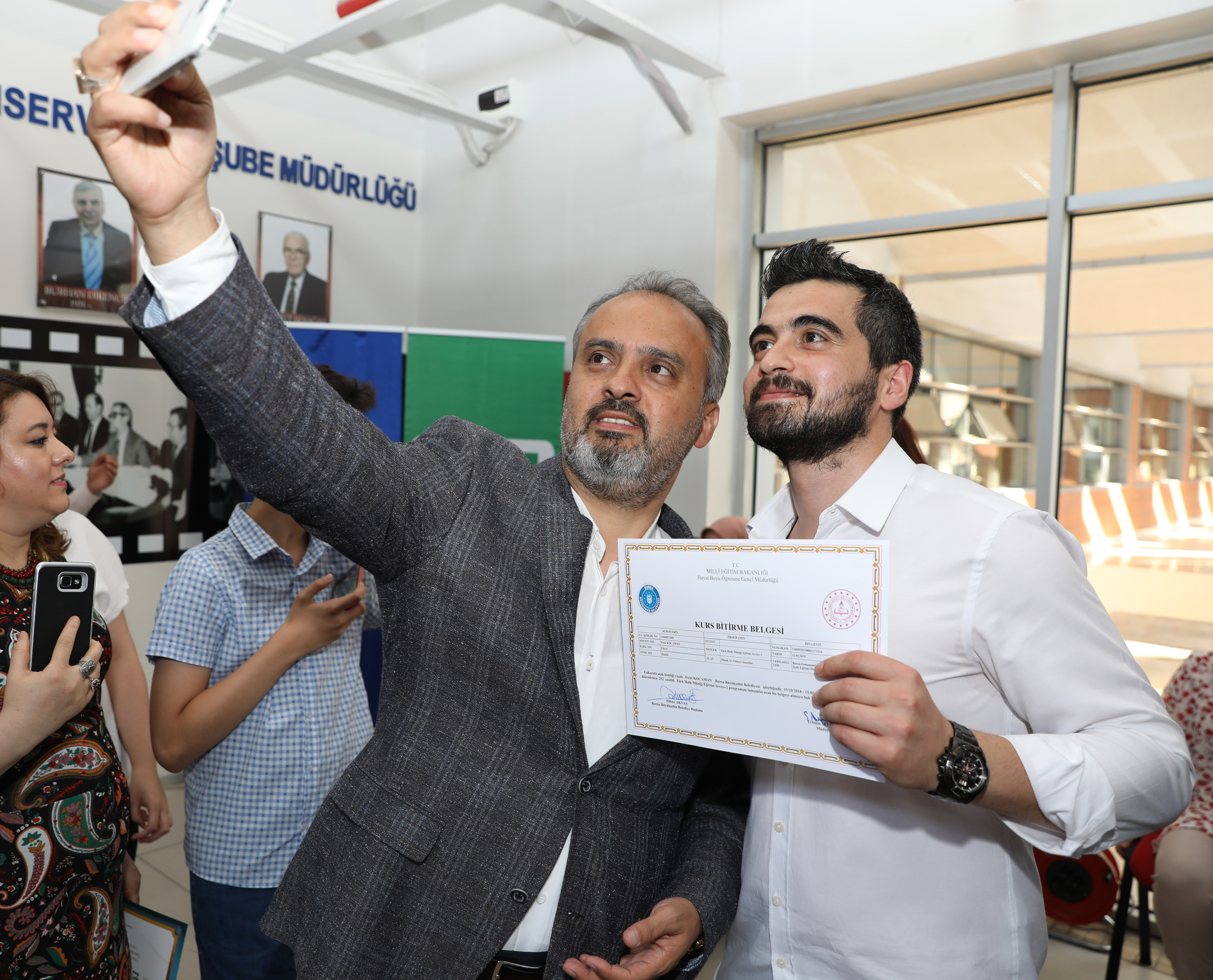 Bursa’yı geleceğe taşıyan yatırımlara imzasını atarken aynı zamanda kentte yaşayan her yaştan vatandaşa yönelik sosyal ve kültürel faaliyetleri de hayata geçiren Büyükşehir Belediyesi tarafından, konservatuar bünyesinde Türk Sanat Müziği ve Türk Halk Müziği eğitimleri gerçekleştirildi. Bursa Büyükşehir Belediye Başkanı Alinur Aktaş, eğitimlerini başarıyla tamamlayan 180 sanatseverin heyecanına ortak oldu. Başkan Aktaş, Atatürk Kongre Kültür Merkezi’nde (Merinos AKKM) faaliyet gösteren Büyükşehir Belediyesi Orkestrası’nda düzenlenen ve müzik dinletisiyle de renklenen törende, kursiyerlere sertifikalarını verdi.