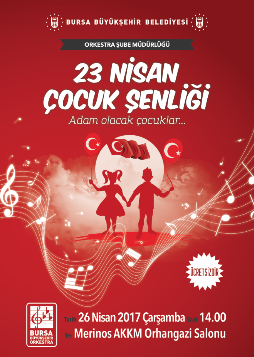 BURSA – Bursa Büyükşehir Belediyesi Orkestra Şube Müdürlüğü’nün ’23 Nisan Çocuk Şenliği’ temalı konseri, 26 Nisan Çarşamba günü saat 14.00’da Atatürk Kongre Kültür Merkezi (Merinos AKKM) Orhangazi Salonu’nda gerçekleştirilecektir.