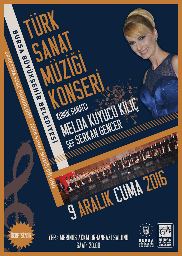 BURSA – Bursa Büyükşehir Belediyesi Orkestra Şube Müdürlüğü Türk Sanat Müziği Bölümü, Aralık ayı konserinde konuk sanatçı Melda Kuyucu Kılıç’ı ağırlıyor.