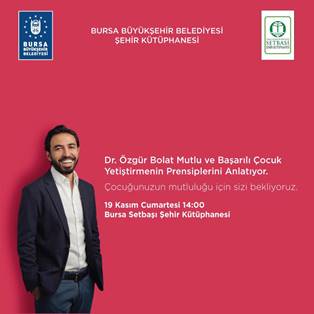 Bursa Büyükşehir Belediyesi Kültür ve Turizm Dairesi’ne bağlı olarak hizmet veren Kütüphaneler Şube Müdürlüğü, Eğitim Bilimci Dr. Özgür Bolat’ı ağırlıyor. Dr. Bolat, 19 Kasım Cumartesi günü saat 14.00’da Büyükşehir Belediyesi Şehir Kütüphanesi’nde, okurlarına, ‘Mutlu ve Başarılı Çocuk Yetiştirmenin Prensipleri’ni anlatacak.
