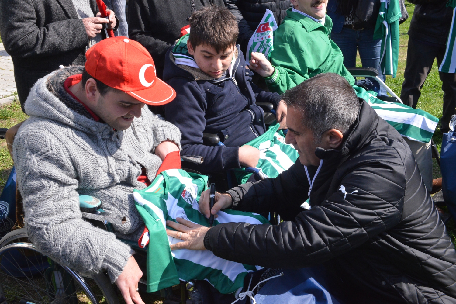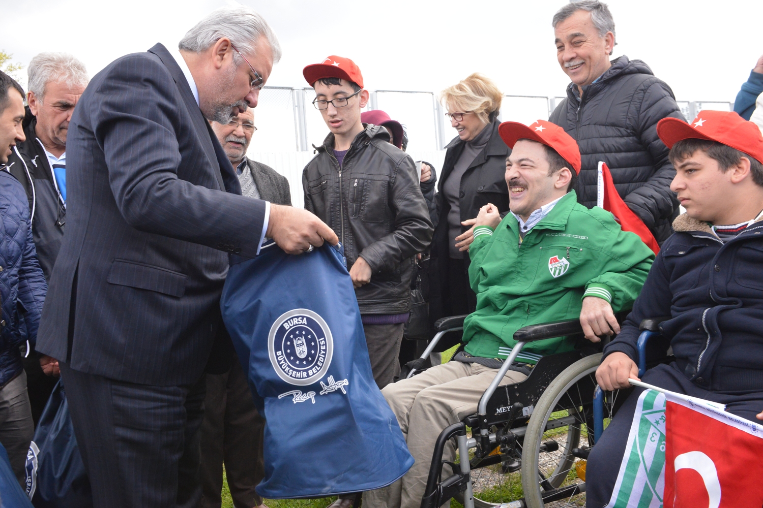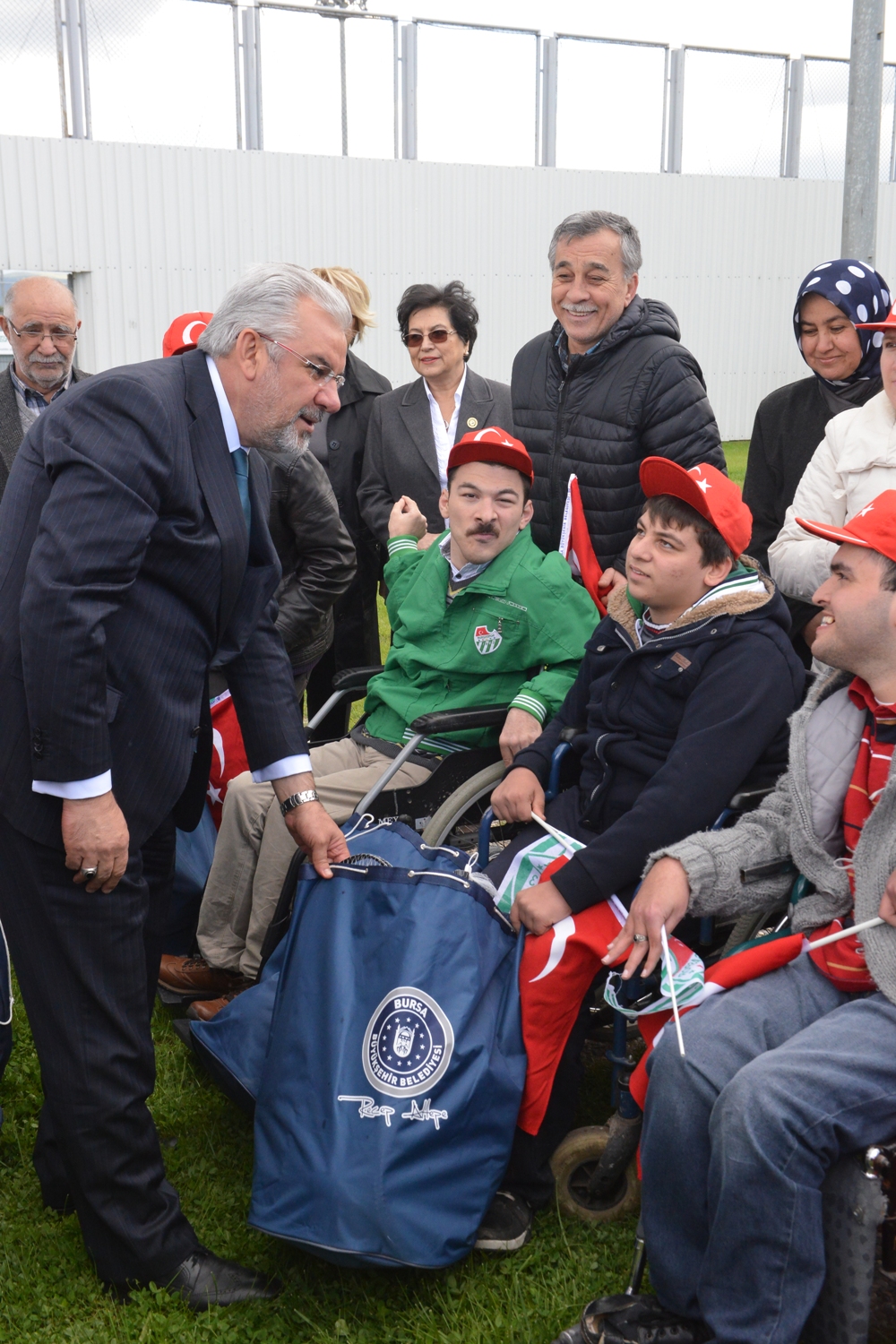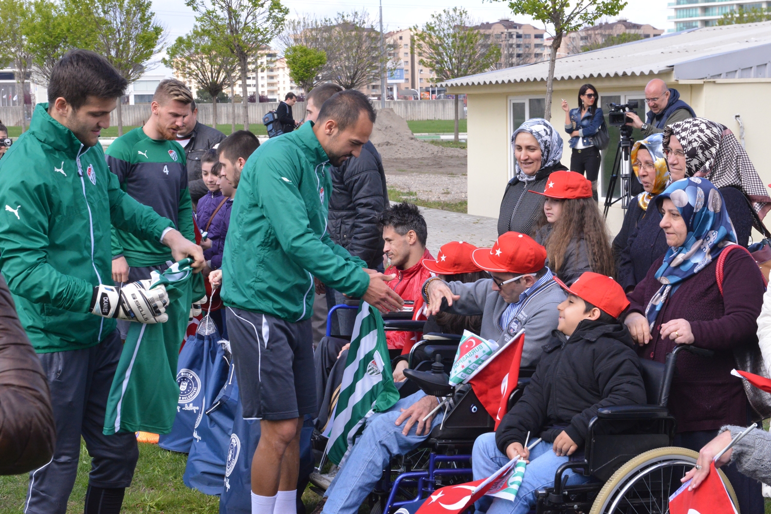 BURSA - Bursa Büyükşehir Belediyesi, Büyükşehir Belediyespor Kulübü ve Türk Anneler Derneği işbirliğinde organize edilen etkinlikte bedensel engelli çocuklar ve aileleri, 23 Nisan’ı Özlüce Tesislerinde Bursasporlu futbolcularla birlikte kutladı.