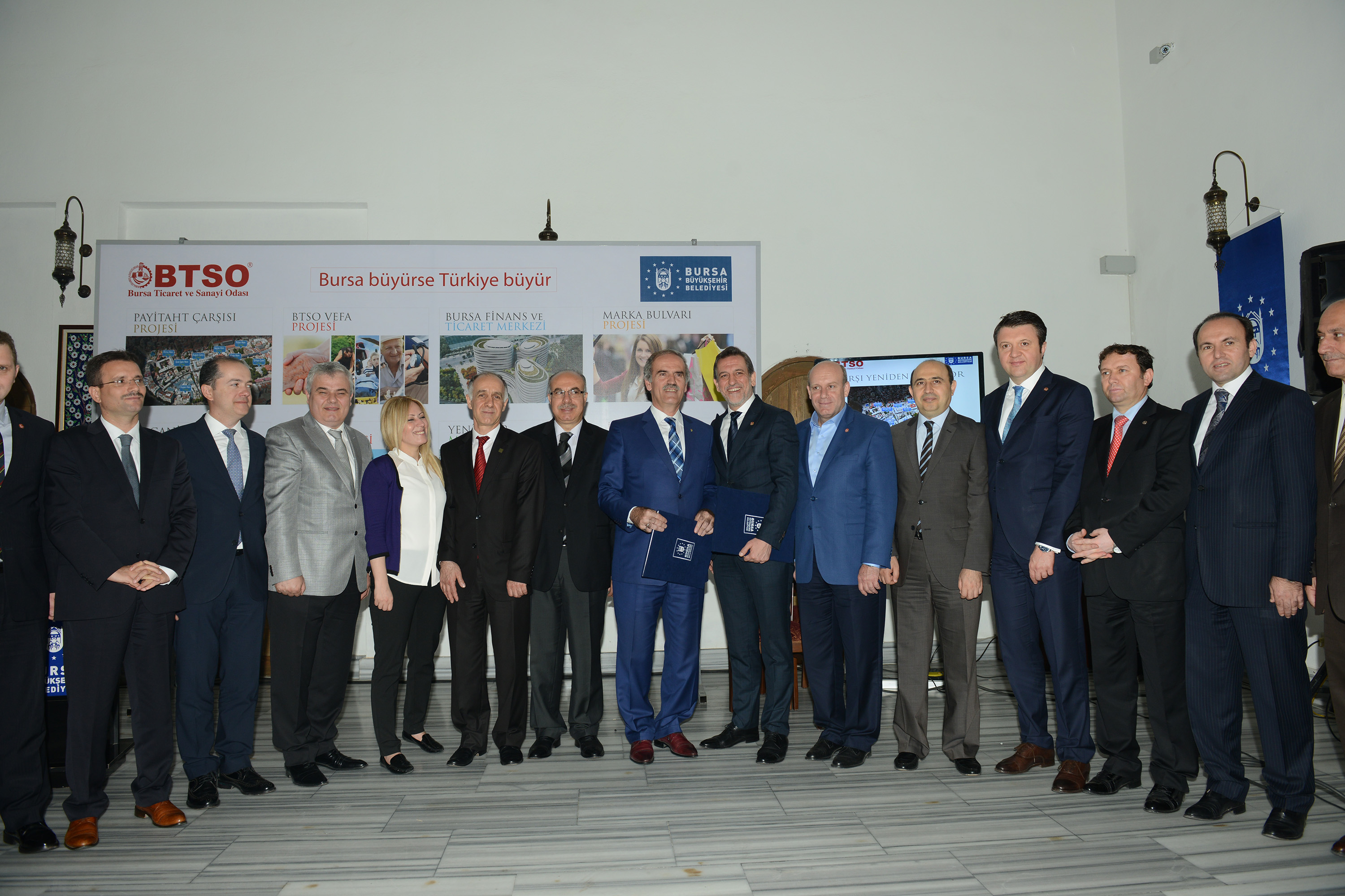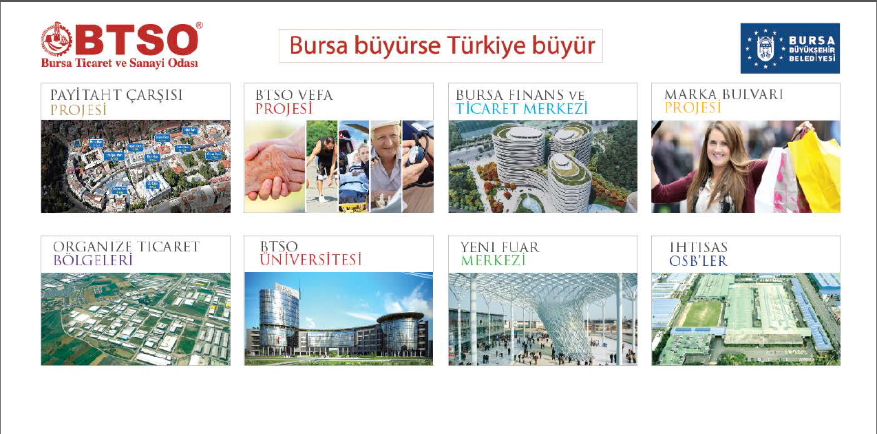 - PAYİTAHT ÇARŞISI, MARKA BULVARI, YENİ FUAR MERKEZİ, BURSA FİNANS VE TİCARET MERKEZİ, BTSO VEFA PROJESİ, ORGANİZE TİCARET BÖLGELERİ, BTSO ÜNİVERSİTESİ VE İHTİSAS ORGANİZE SANAYİ BÖLGELERİ’NDEN OLUŞAN 8 PROJEDE İŞBİRLİĞİ YAPACAK OLAN BÜYÜKŞEHİR BELEDİYESİ VE BTSO KENTİ GELECEĞE TAŞIYACAK ÖNEMLİ BİR HAMLE GERÇEKLEŞTİRİYOR.