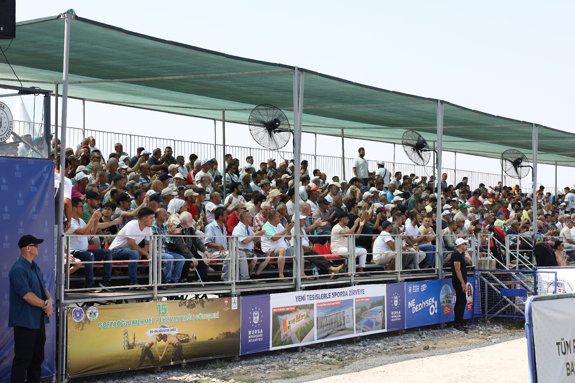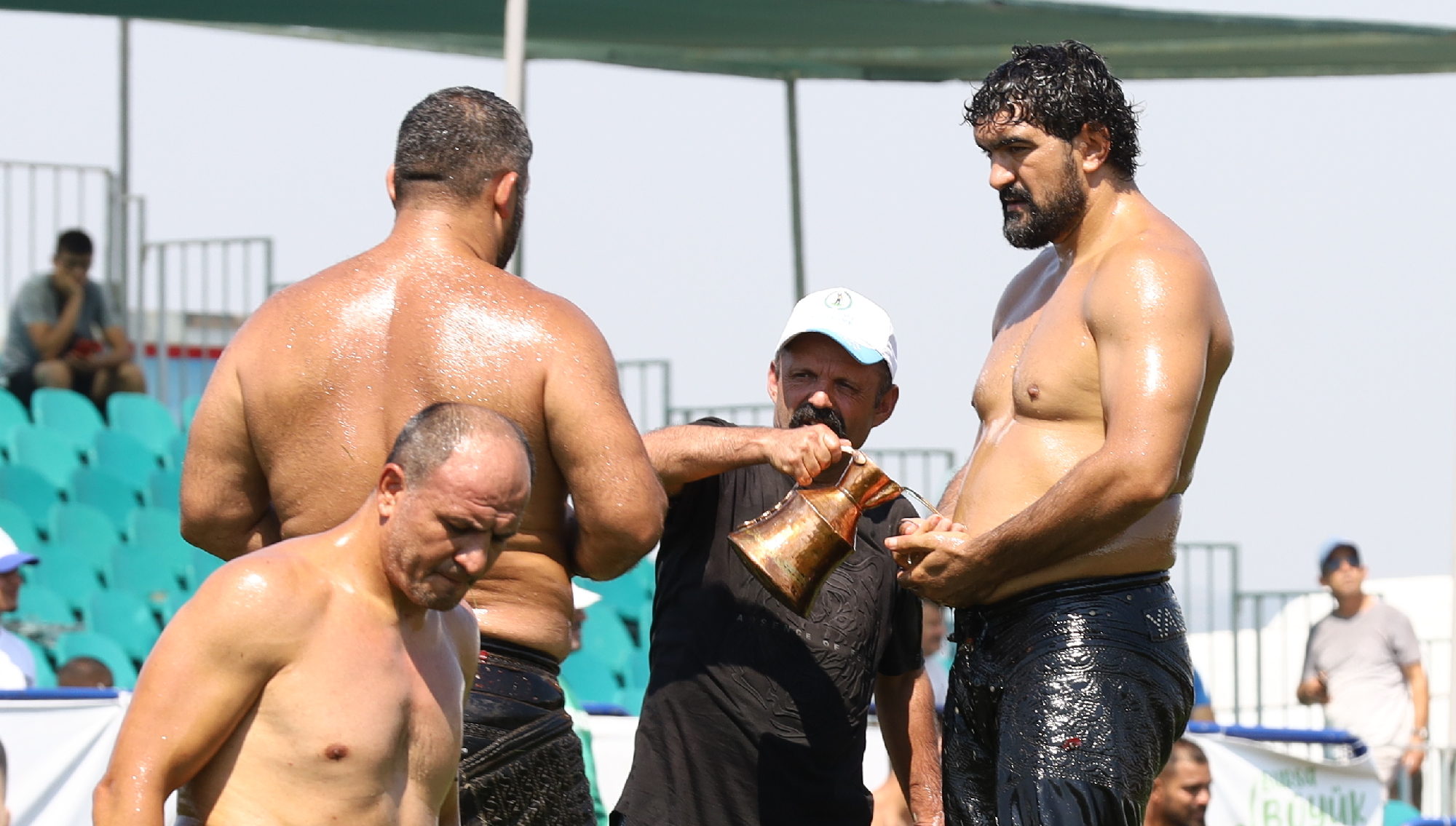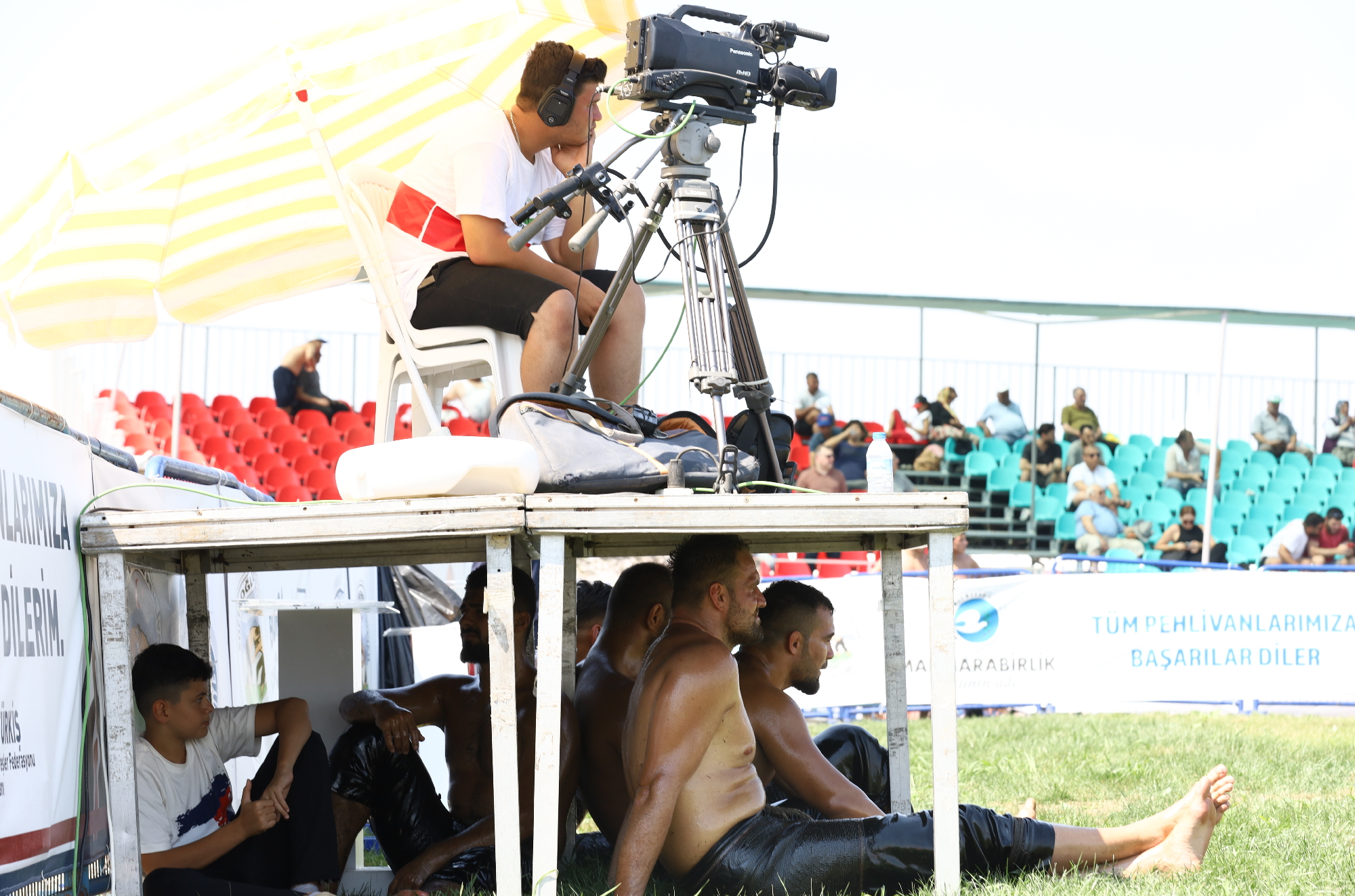Er meydanına dönüşen Yunuseli Havaalanı’nda yapılan etkinliğe güreş severler de yoğun ilgi gösterdi. Kura çekimlerinin ardından başlayan güreşlerde, karşılaşmalarını tamamlayan güreşçiler, güneşten korunmak için ilginç yollara başvurdu. Canlı yayın kameraları için oluşturulan platformun altına giren pehlivanlar, kavurucu sıcaktan korunmaya çalıştı. İlk gün karşılaşmalarını Bursa Büyükşehir Belediye Başkanı Alinur Aktaş, Türkiye Geleneksel Güreşler Federasyonu Başkanı İbrahim Türkiş ile birlikte izledi.