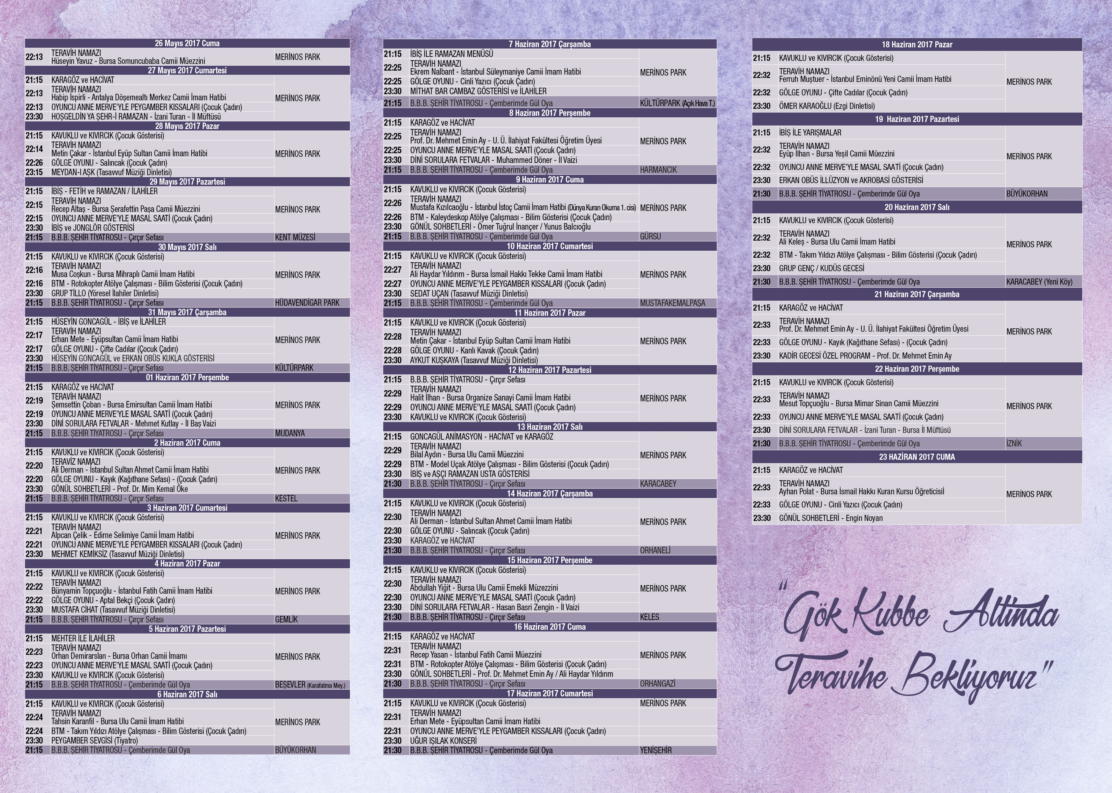 - Ramazan ayı, Büyükşehir Belediyesi tarafından hazırlanan ‘Şehr-i Ramazan’ programı ile bu yıl da Bursa’da manevi bir atmosferde yaşanacak.