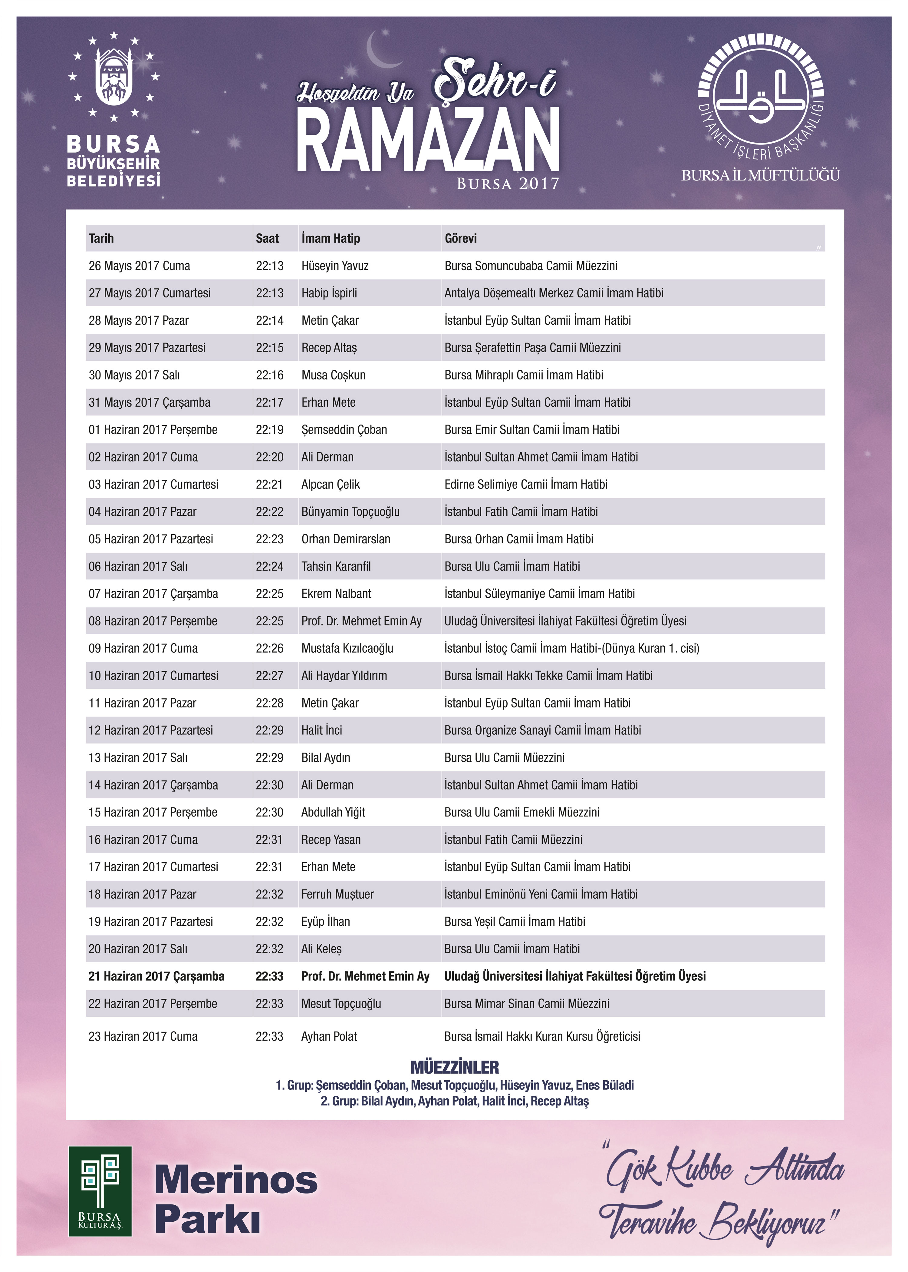 Başkan Altepe, Ramazan’ın nabzının bu yıl da 260 bin metrekarelik Merinos Parkı’nda atacağını söyleyerek, “Merinos ve diğer bölgelerde, Ramazan’ın ruhuna uygun şekilde sohbetlerden ortaoyunlarına kadar her türlü etkinlik gerçekleştirilecek. Merinos Parkı’nda kurulan ve teravih namazlarının açık alanda kılınacağı mescidimiz yaklaşık 5 bin kişiye hizmet verebilecek. Vatandaşlarımız, ünlü imam hatiplerle birlikte açık alanda teravih namazını eda edebilecekler” dedi.