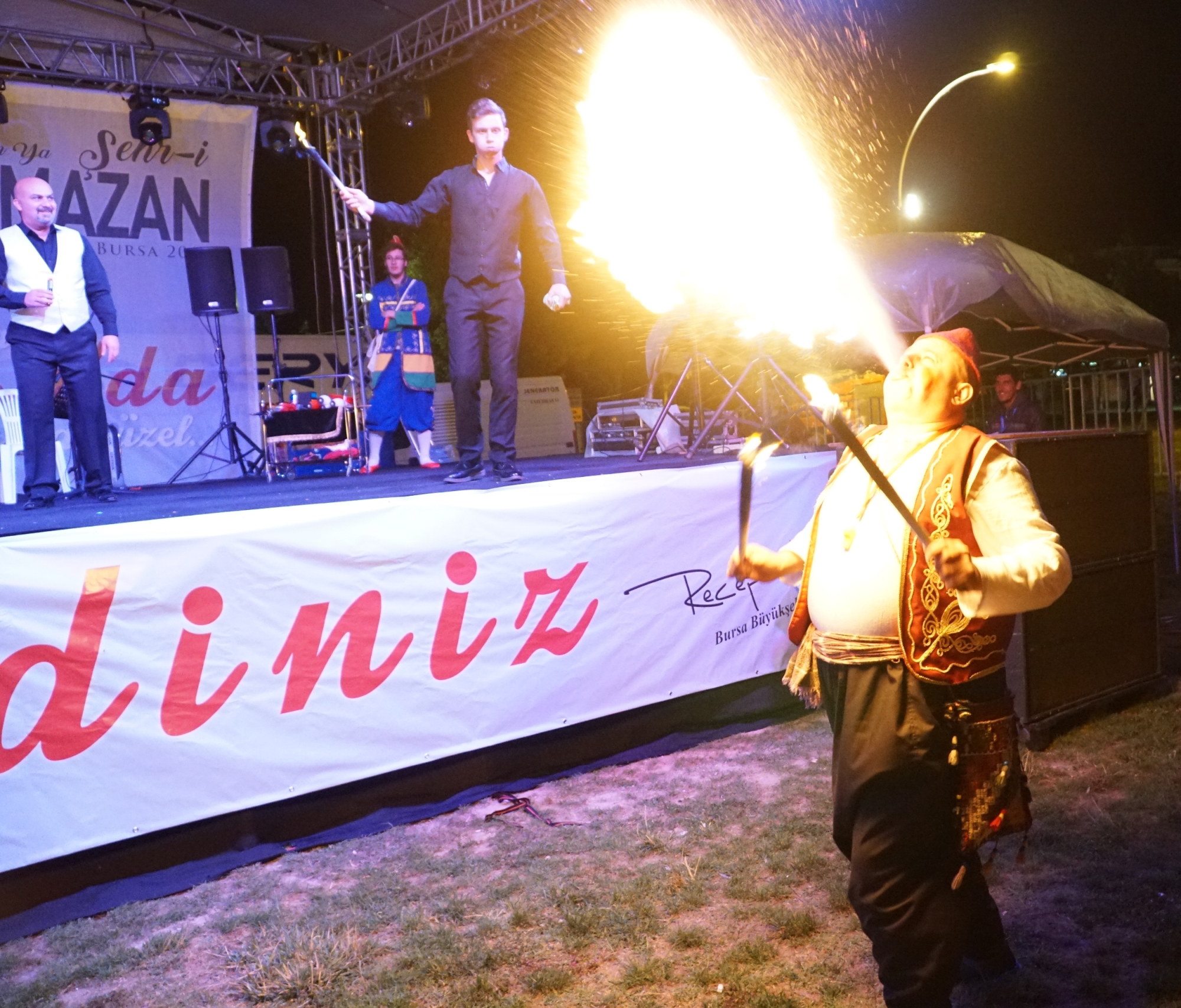 Bursa’da, 11 ayın sultanı Ramazan, ‘Şehr-i Ramazan’ programı ile gönüllere dokunuyor. Merinos Parkı’nda manevi bir atmosferde bir araya gelen vatandaşlar, bu kez Erkan Obüs’ün illüzyon, jonglör ve kukla gösterisini izledi. Nefes kesen gösteriler, izleyicilere heyecanlı anlar yaşattı. Bursalılardan büyük ilgi gören program kapsamında yapılan ‘Hüseyin Goncagül ile Bursa yarışıyor’ da keyifli anlara sahne oldu. Çocuk çadırında Bursa Bilim ve Teknoloji Merkezi’nin (BTM) ‘Gün takımyıldızı atölye çalışması’ ile ‘Bilim’ gösterisi gerçekleştirildi. Parkta kurulan namazgahta da Bursa İl Müftüsü Prof. Dr. Mehmet Emin Ay nezaretinde teravih namazı kılındı.