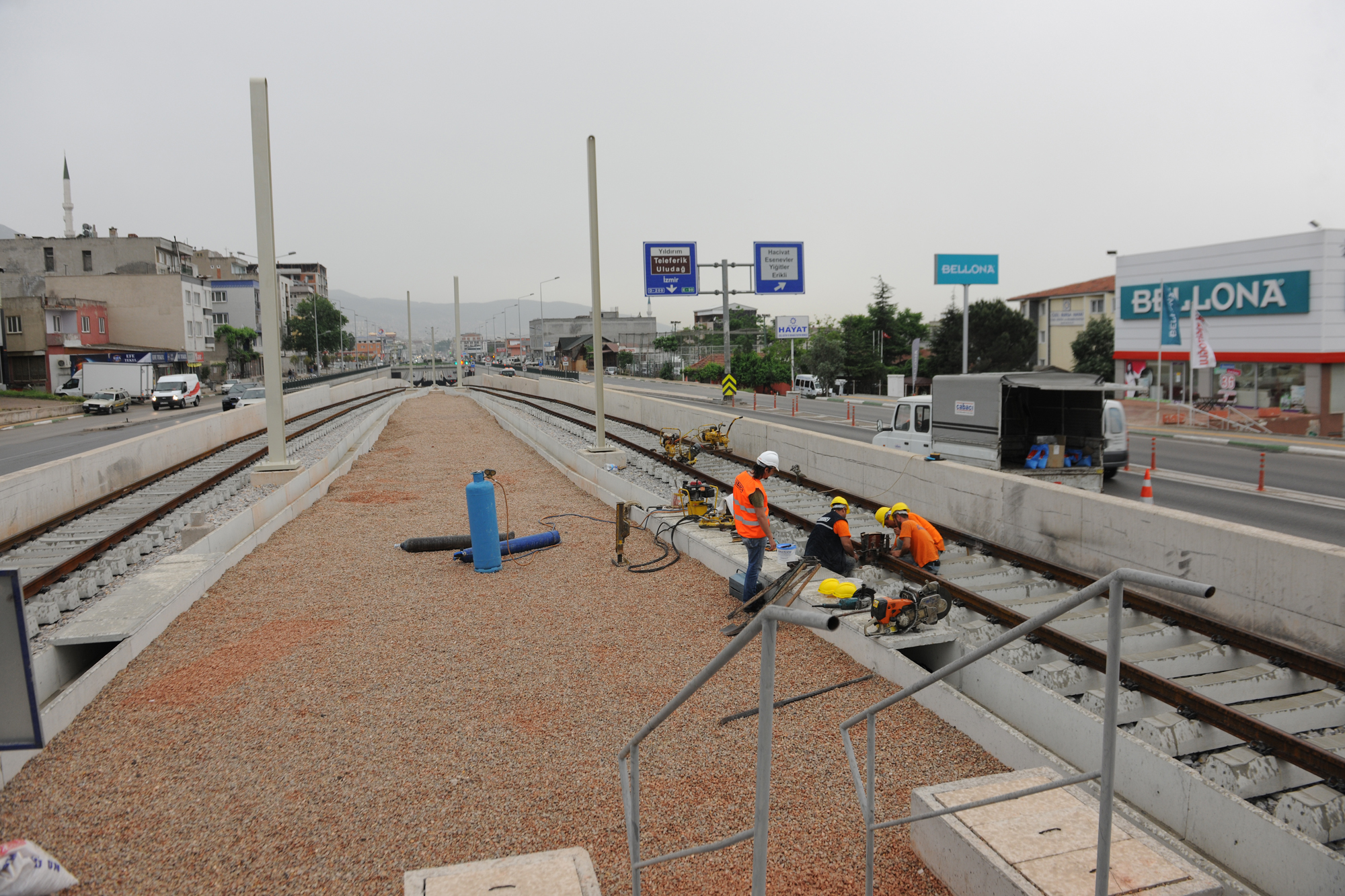Bursa’da ulaşım sorununu raylı sistem yatırımları çözmeyi hedefleyen ve bu doğrultuda bu dönem programda olmamasına rağmen inşaatına başlanan 7 duraklı 8 kilometrelik Bursaray Kestel Hattı’nda çalışmalar hızla sürüyor. Toplam 7 adet hemzemin istasyon, Esenevler ve Kestel olmak üzere iki adet köprülü kavşak, Hacıvat, Balıklı ve Deliçay Köprülerin yenilenmesi ve üç adet trafo binasını bünyesinde barındıran proje kapsamında ray döşeme çalışmalarına başlandı. Engelli vatandaşlar için engelli asansörleri ve yürüyen merdivenlerin yer aldığı ilk altı istasyondaki imalat ilerlemesi yüzde 85’leri aşarken, ince işler ve elektrik-mekanik tesisat işleri devam ediyor. Hat için gerekli olan tüm ray, travers, makasların temini tamamlanırken, balast serimi, travers ve ray montajlarına ilerleme oranı yüzde 40’lara ulaştı. Toplam 8 bin 100 metrelik hattın yaklaşık 7 bin metrelik kısmının alt yapıları ve betonarme imalatları tamamlanırken, Otosansit – Gürsü Kavşak yapısı arası ve Arabayatağı İstasyonu Bekleme Hattını kapsayan bin metrelik hatta ait çalışmalar da hızla devam ediyor.