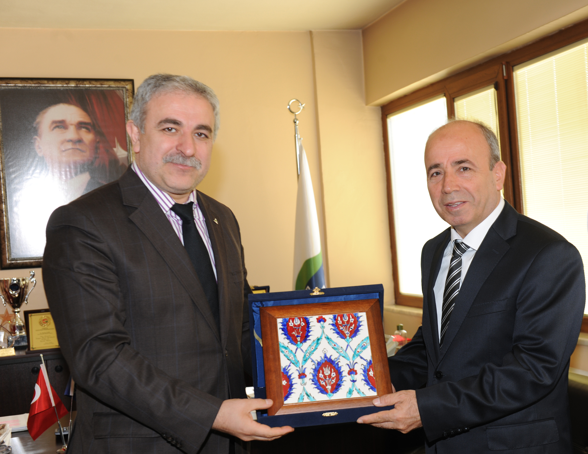 Emniyet Müdürü Kahya’ya Belediyespor Kulübü’nün tesis ve salonlarını gezdiren Satık, günün anısına Kahya’ya çini plaket verdi.