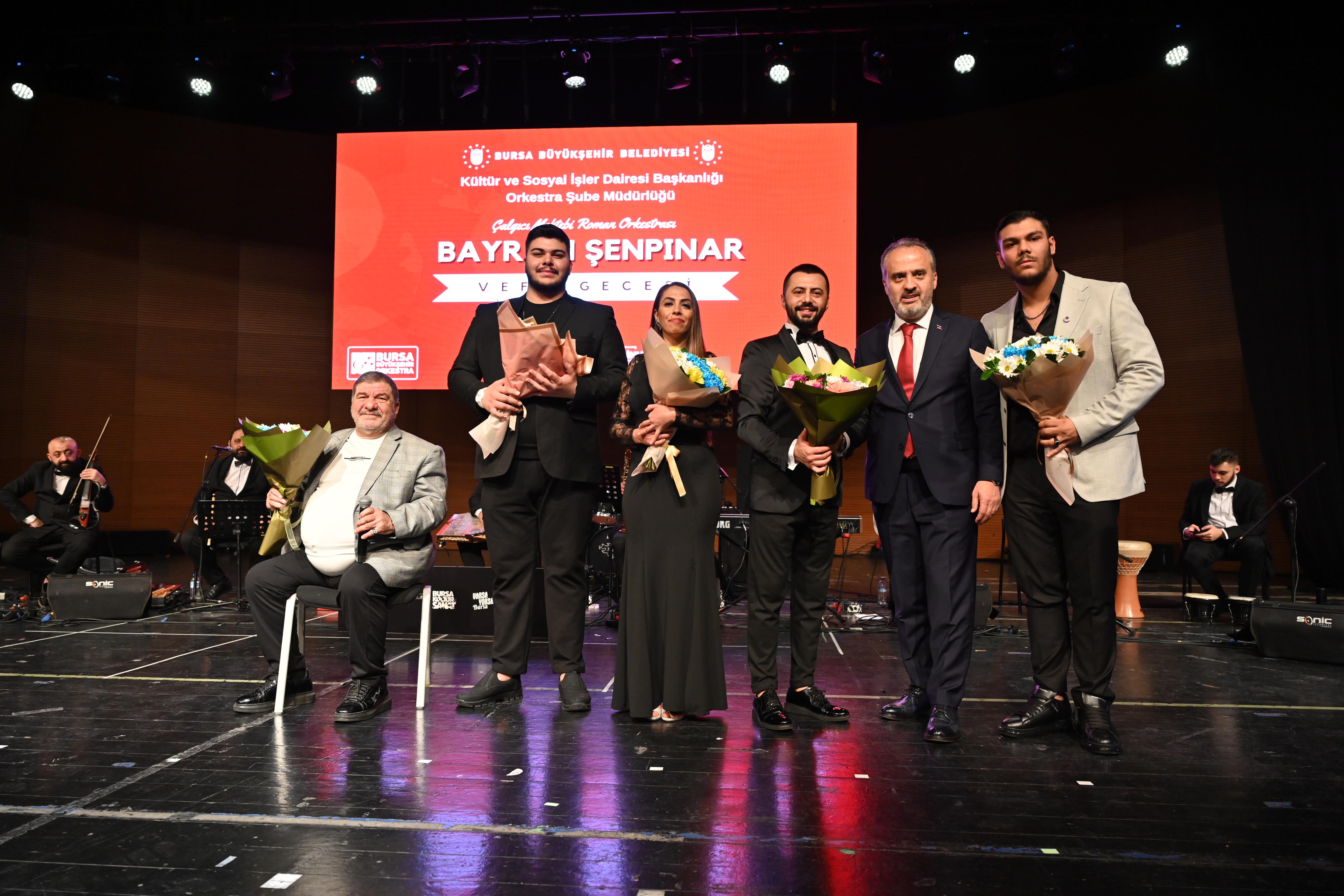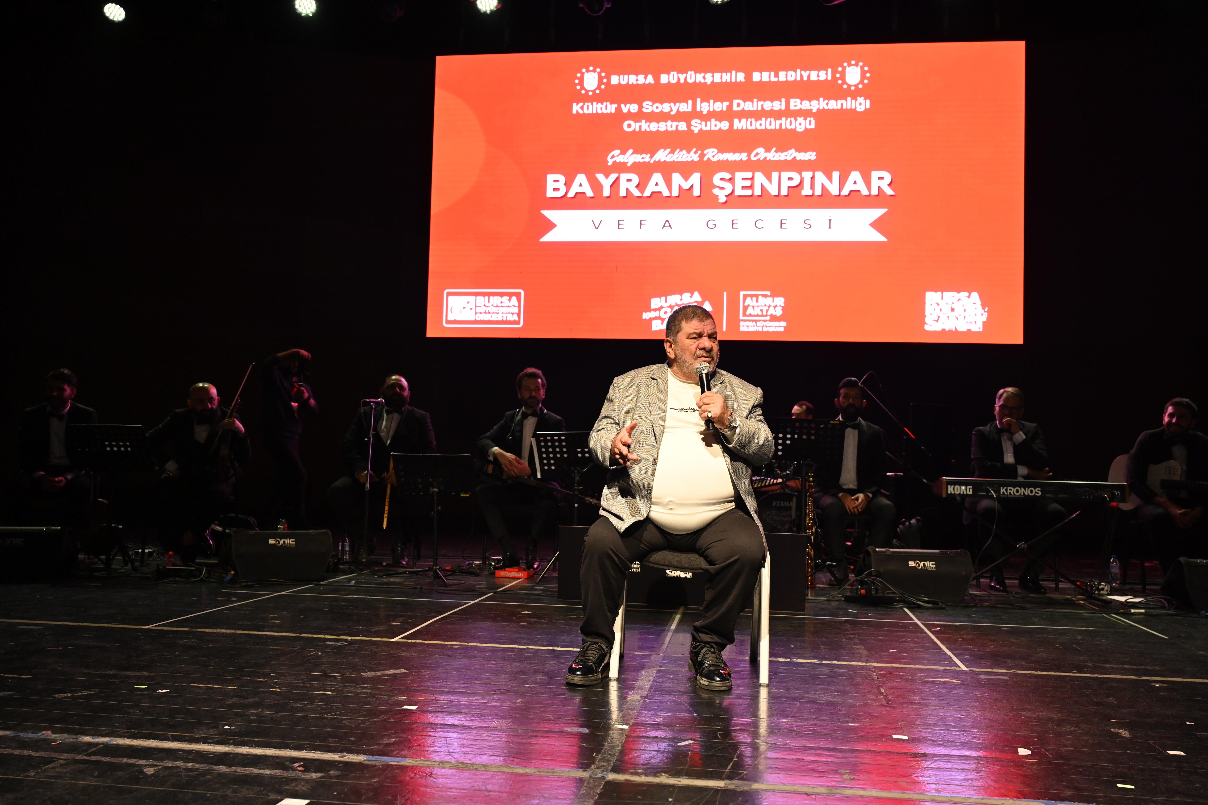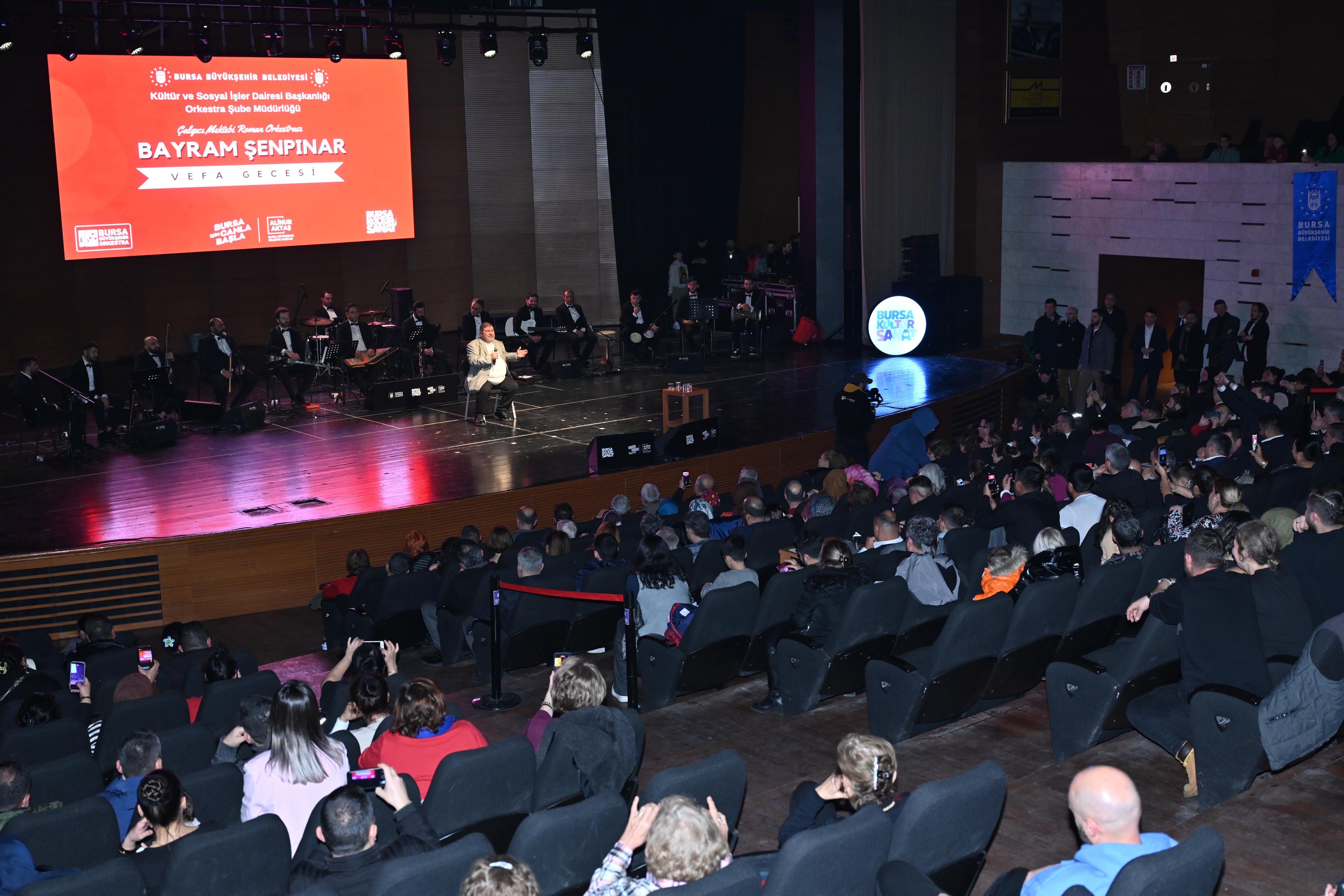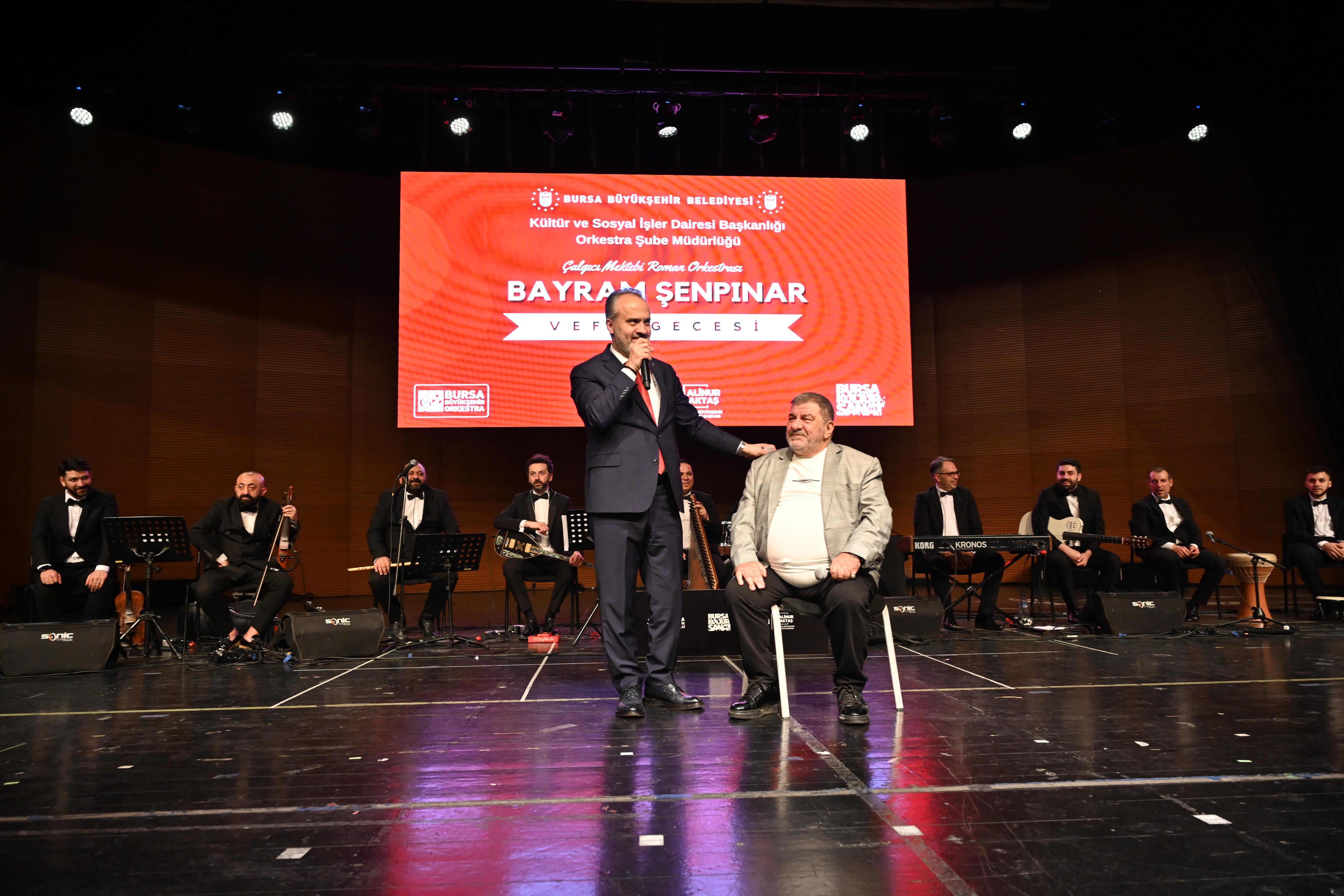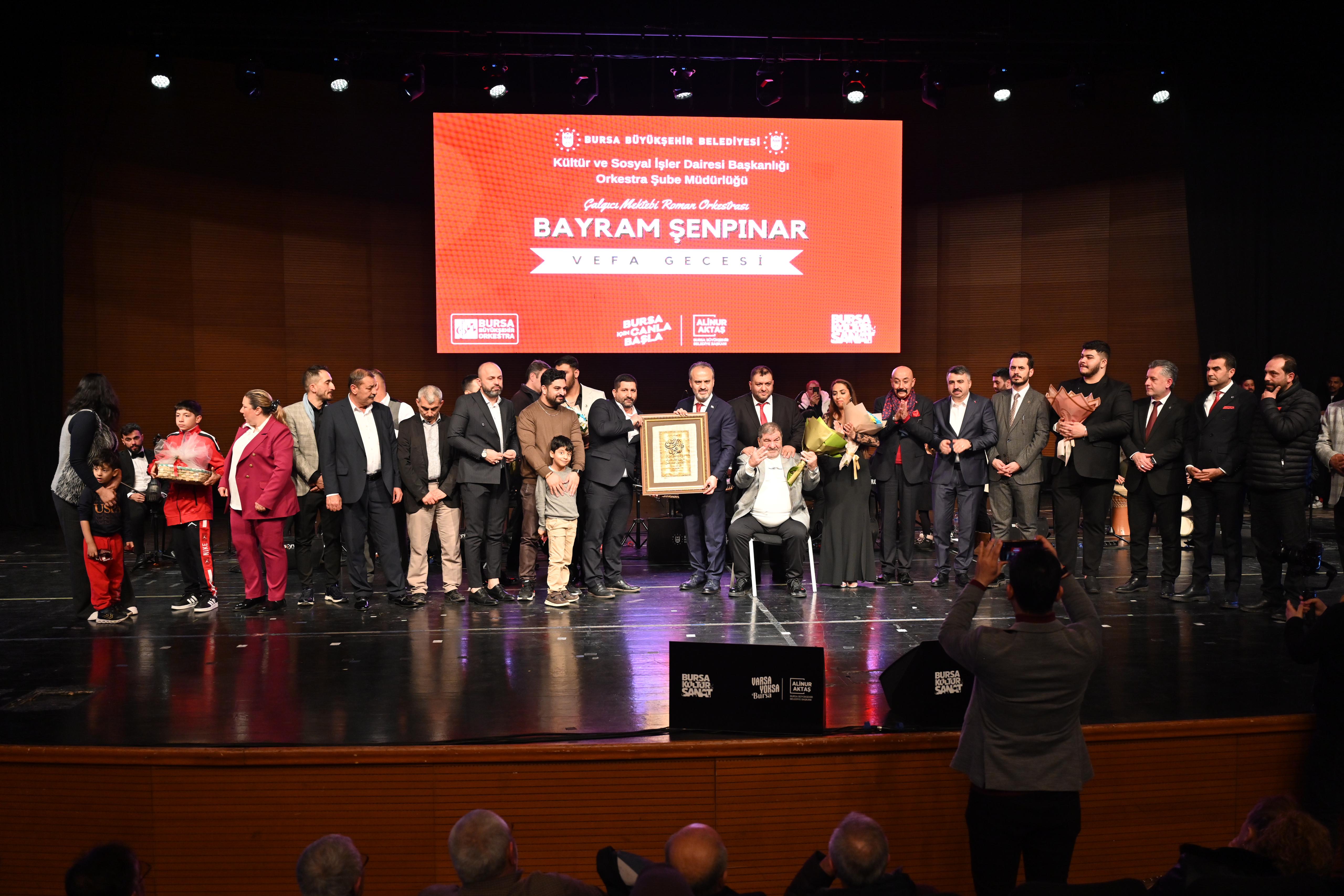 Bursa Büyükşehir Belediyesi Orkestrası bünyesinde faaliyetlerini sürdüren Çalgıcı Mektebi Roman Orkestrası, Bursalı usta sanatçı ‘Bayram Şenpınar’ adına vefa gecesi konseri düzenlendi. Programa, Bursa Büyükşehir Belediye Başkanı Alinur Aktaş’ın yanı sıra Yıldırım Belediye Başkanı Oktay Yılmaz, siyasi parti temsilcileri, şehir içi ve şehir dışından gelen Roman Dernekleri’nin başkanları ve çok sayıda sanatsever katıldı.