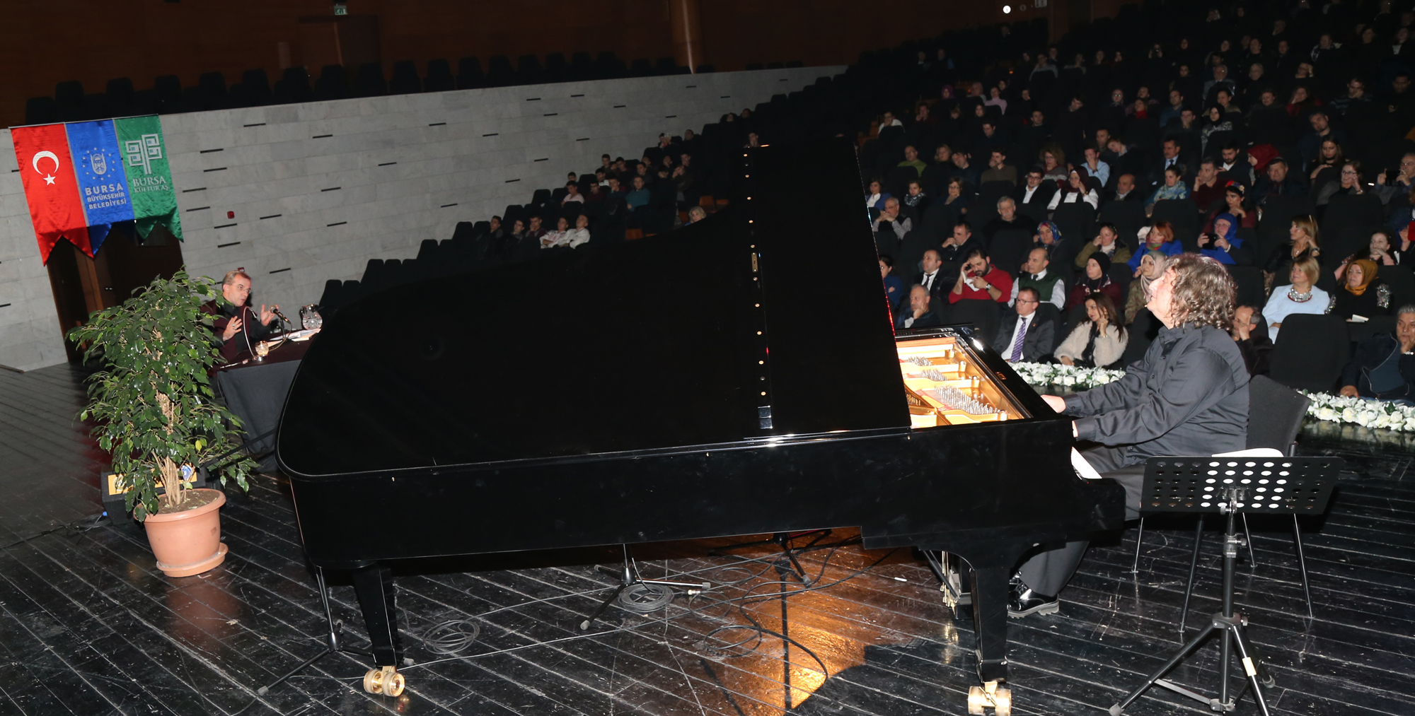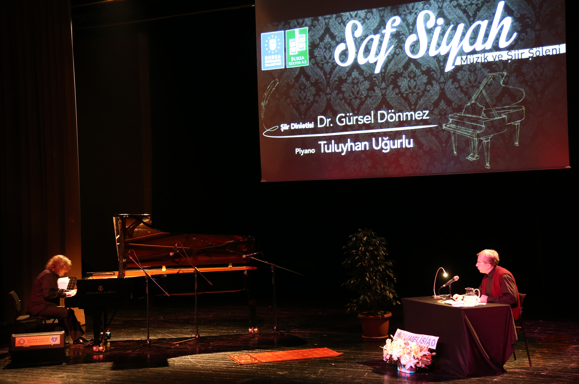 Bursalı sanatseverlere duygusal anlar yaşatan programda, Başbakan Baş Danışmanı Dr. Gürsel Dönmez’in şiirlerine usta sanatçı Tuluyhan Uğurlu piyanosuyla eşlik etti. Vatandaşlar, Dr. Gürsel Dönmez’in ‘Saf Siyah’ adlı şiir kitabından şiirlerini okuduğu programda keyifli anlar yaşadı. Usta sanatçı Tuluyhan Uğurlu ise piyano dinletisiyle dinleyicileri müzik yolculuğuna çıkardı.