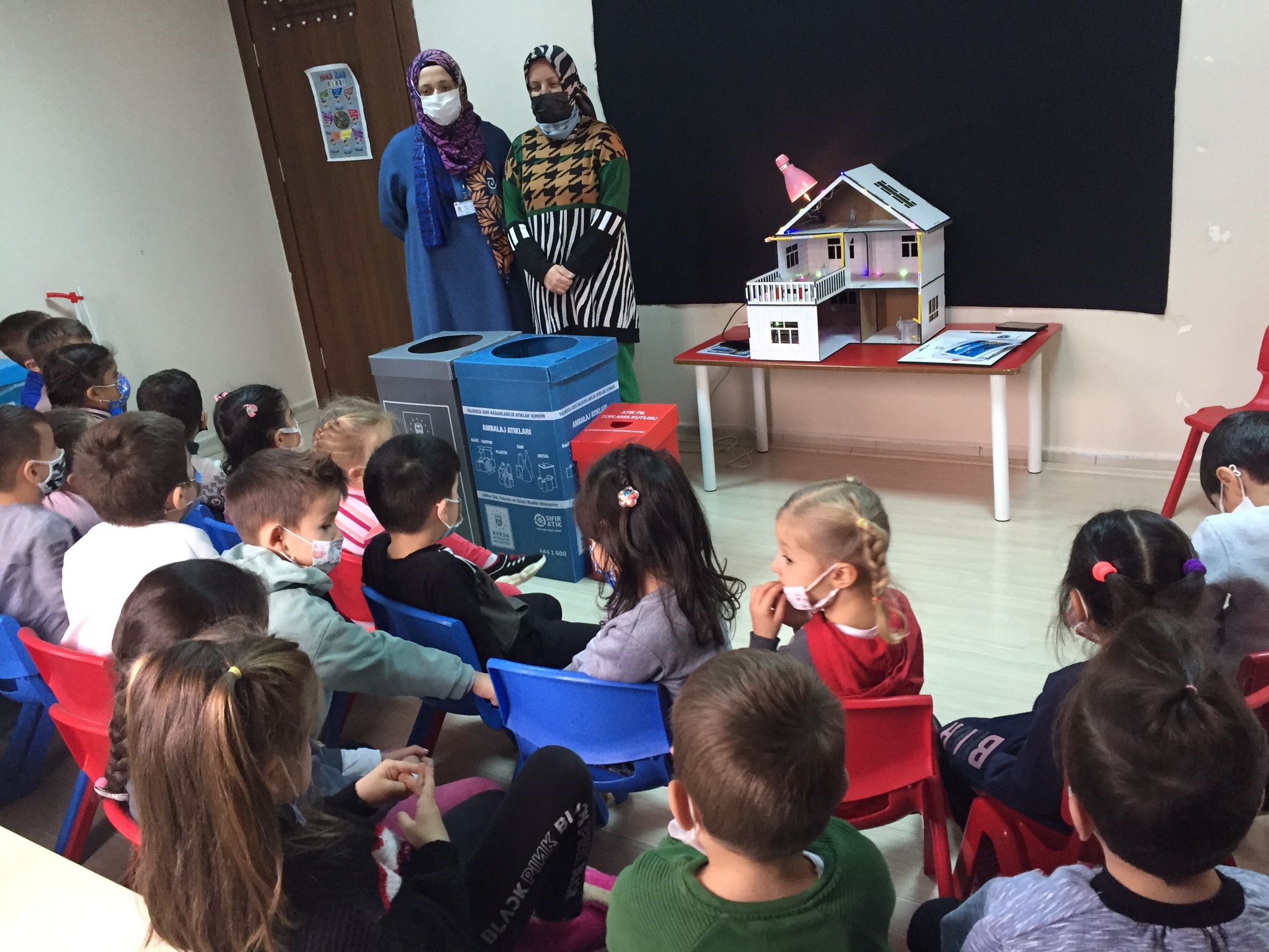 Hacı Sevim Yıldız Mobilya ve İç Mekan Tasarımı Teknolojisi M.T.A.L okulu tarafından ‘proje kapsamında kullanılmak üzere’ hediye edilen eğitici materyallerle uygulamalı atölye çalışmaları gerçekleştirildi. Güneş enerjisi ile çalışan Sıfır Atık Evi, Puzzle, Atığımı Nereye Atayım, Flaş Kartlar ile Doğru Öğreniyorum atölyeleri ile çocuklar, hem enerjinin doğru kullanımını hem de çevrenin nasıl korunacağını öğrenmiş oldu.