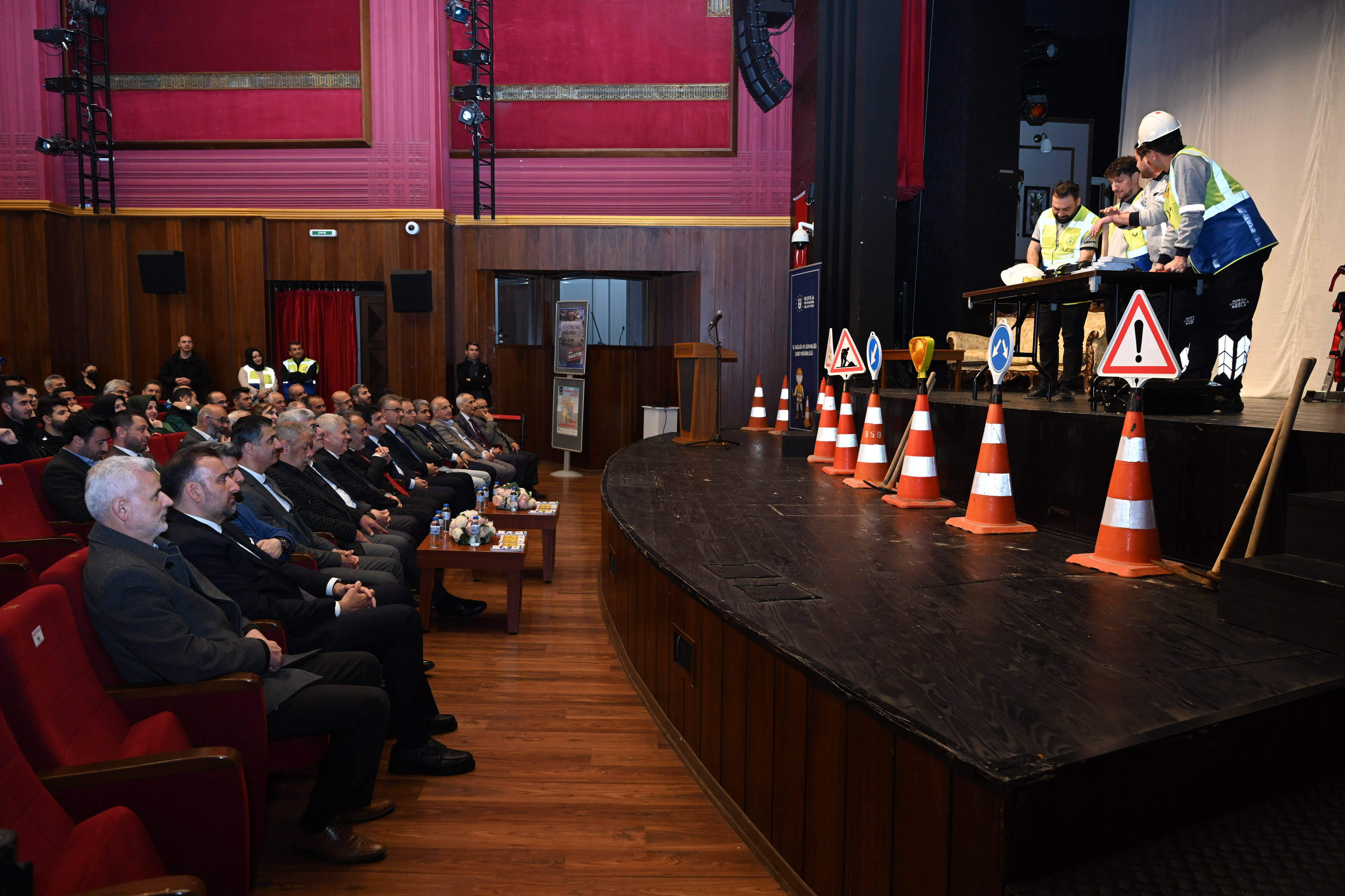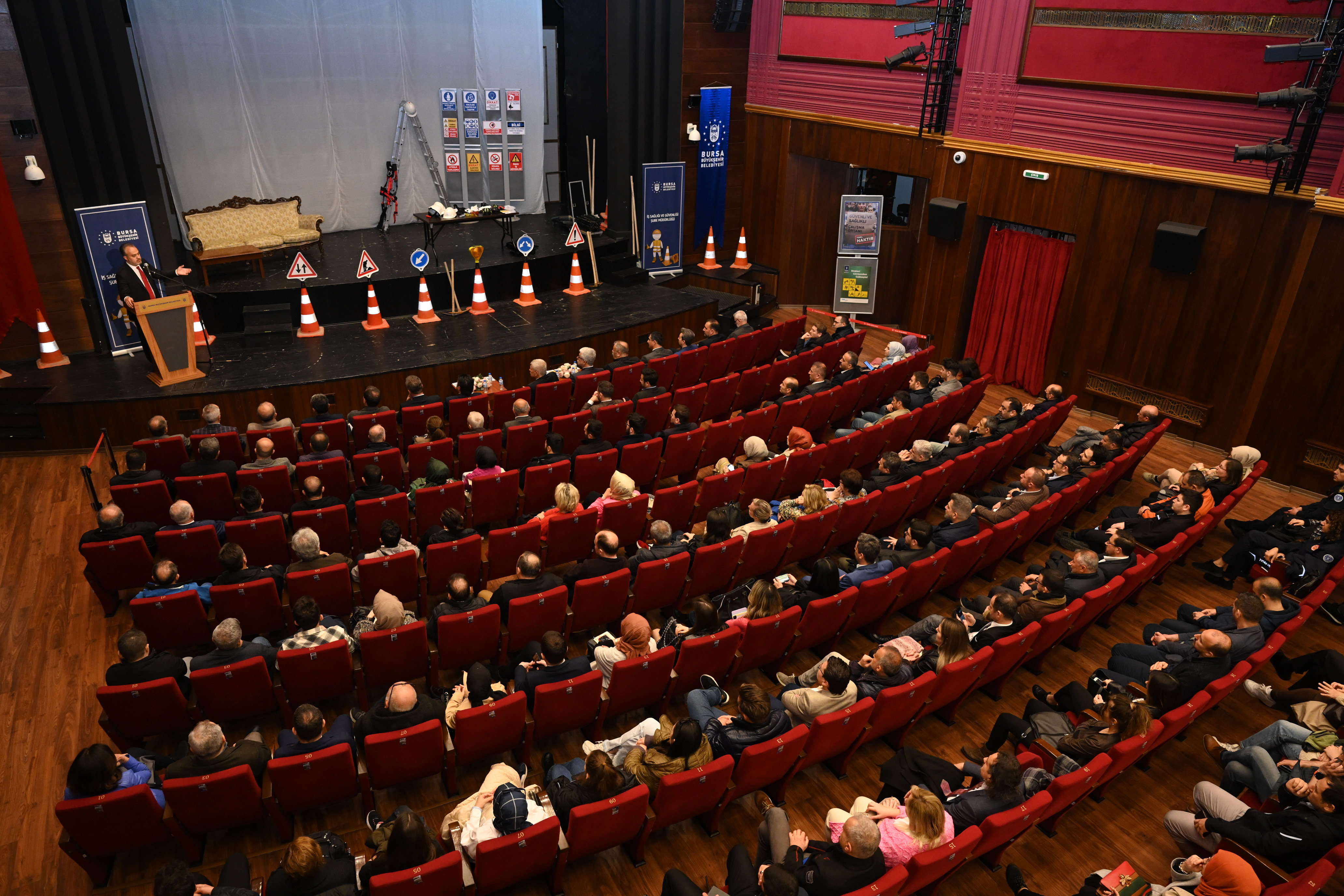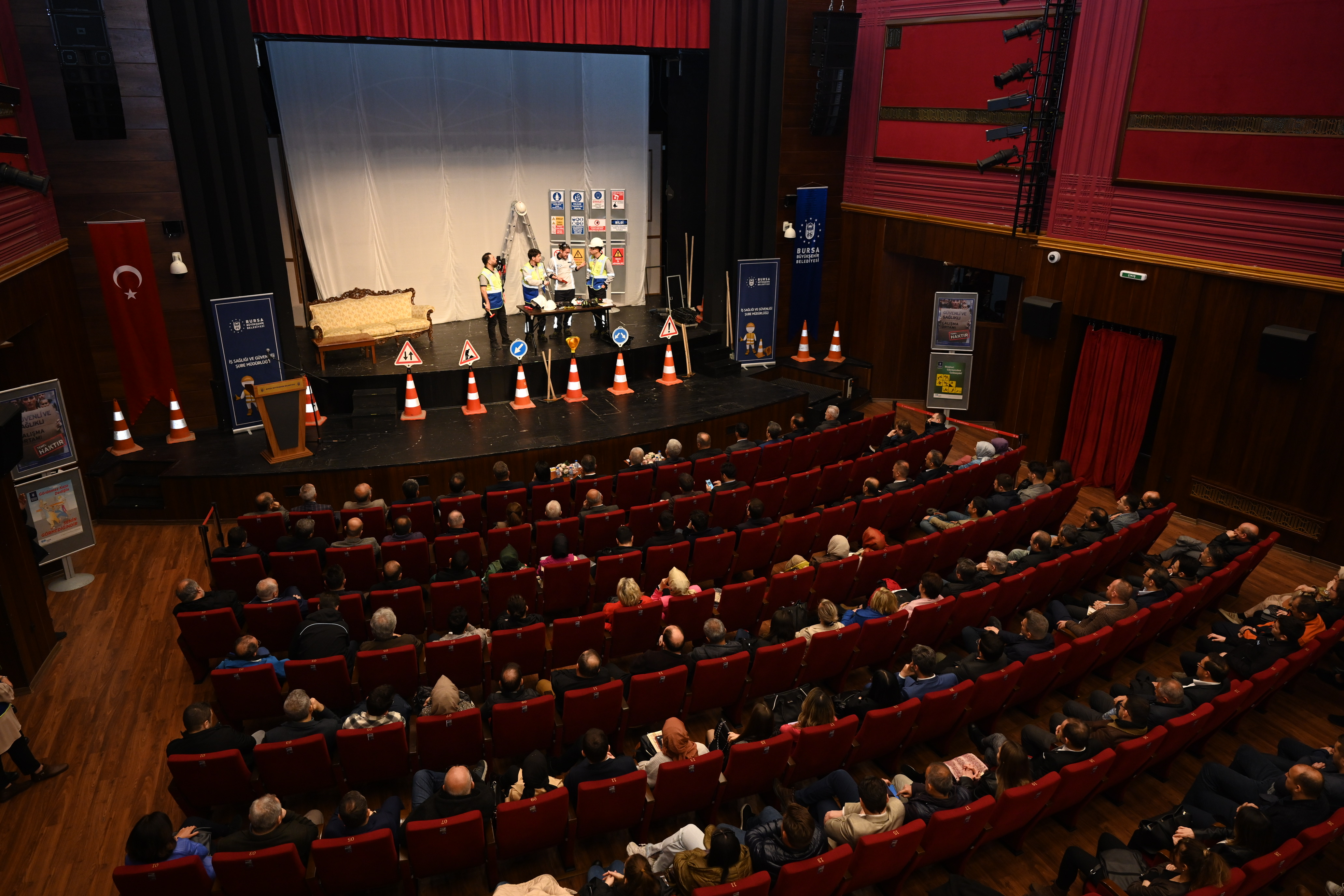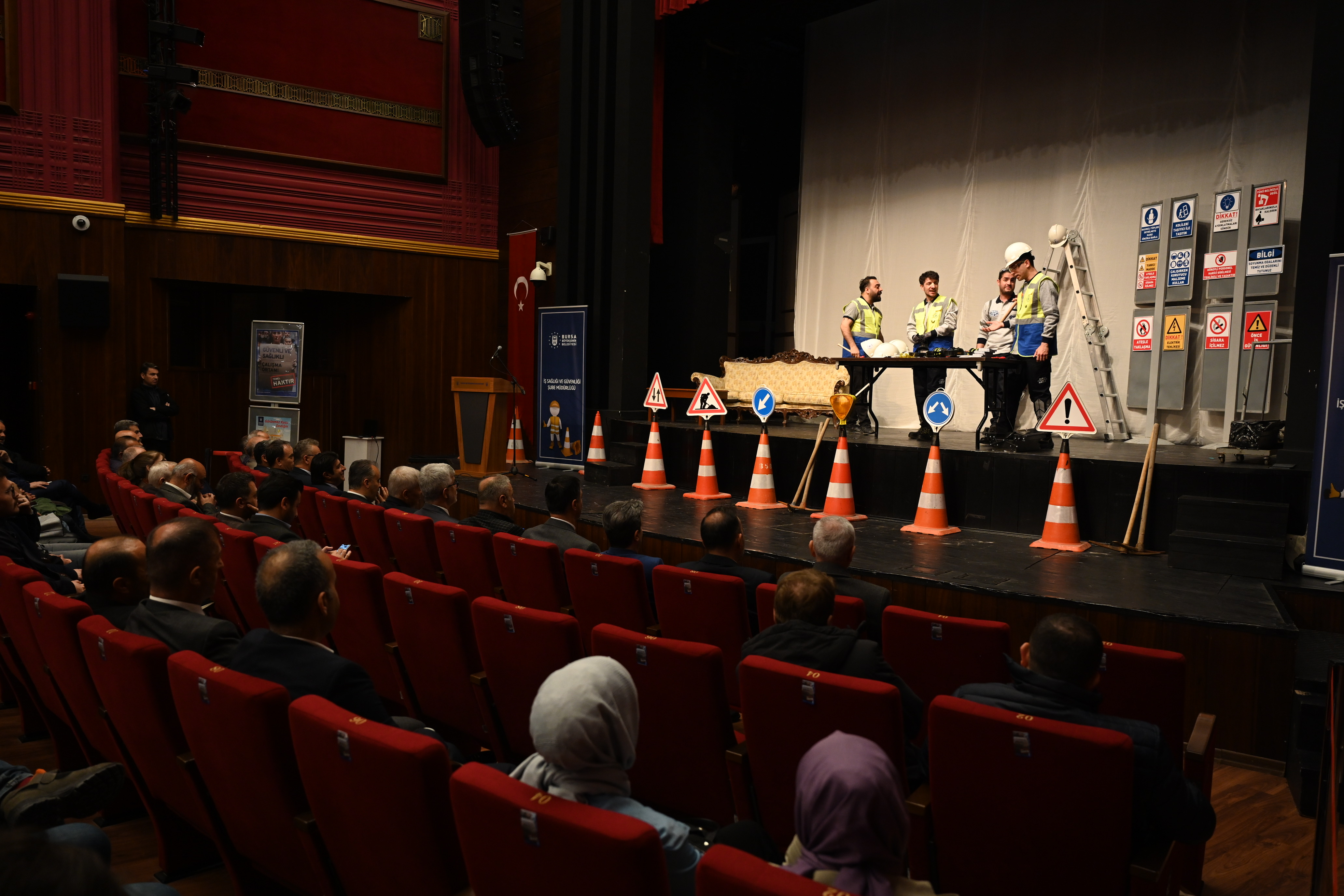Bursa Büyükşehir Belediyesi İş Sağlığı ve Güvenliği Şube Müdürlüğü, 28 Nisan İş Sağlığı ve Güvenliği Günü’nde farklı bir etkinliğe imza attı. Tayyare Kültür Merkezi’nde düzenlenen programda iş güvenliğine yönelik farkındalığın artırılmasına yönelik yaklaşık 1,5 saatlik ‘’Bize Bir Şey Olmaz’’ isimli interaktif tiyatro gösterisi sunuldu. Gösterileride basit gibi görünen tedbirlerin alınmaması yüzünden yaşanan kazalar sahnelenirken, izleyicilerin interaktif katılımıyla yaptıkları önerilerle sahnedeki kazaların önlenmesi sağlandı.
