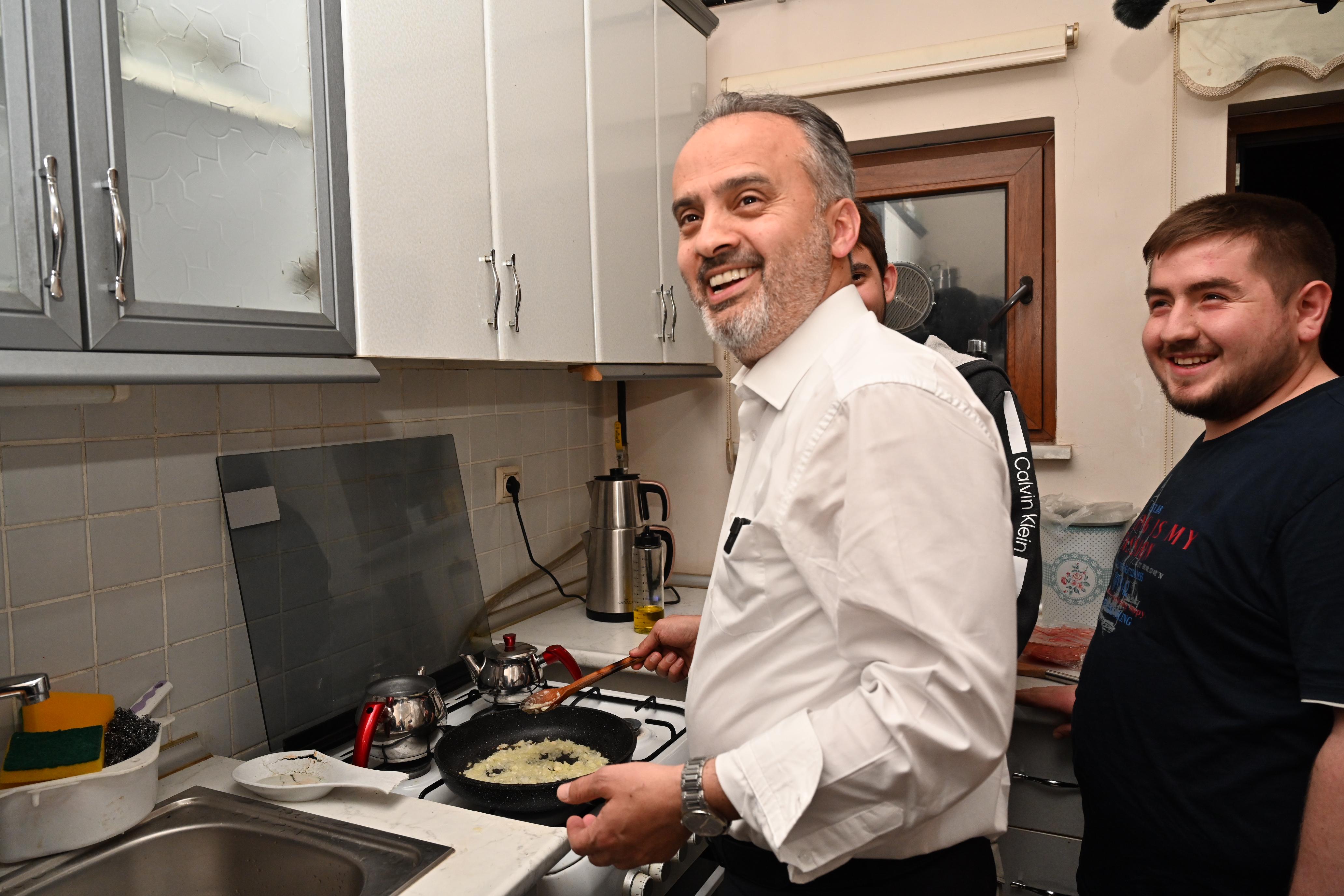 Gençleri merkeze alan proje ve uygulamalarla Bursa’nın genç dostu şehir olmasında öncülük eden Büyükşehir Belediye Başkanı Alinur Aktaş, yoğun programına rağmen gençlerin sosyal medya üzerinden davetini kırmayarak sahur sofrasına konuk oldu. Hasan Yasir Öztürk, Zikrullah Köse, Asım Gelişgen, Emir Boz, Taha Pinal, Caner Çal, Kadir Tuna ve Kudret Küçük isimli üniversite öğrencilerini birlikte yaşadıkları evde ziyaret eden Başkan Alinur Aktaş, gençler için ocağın başına geçerek menemen yaptı.