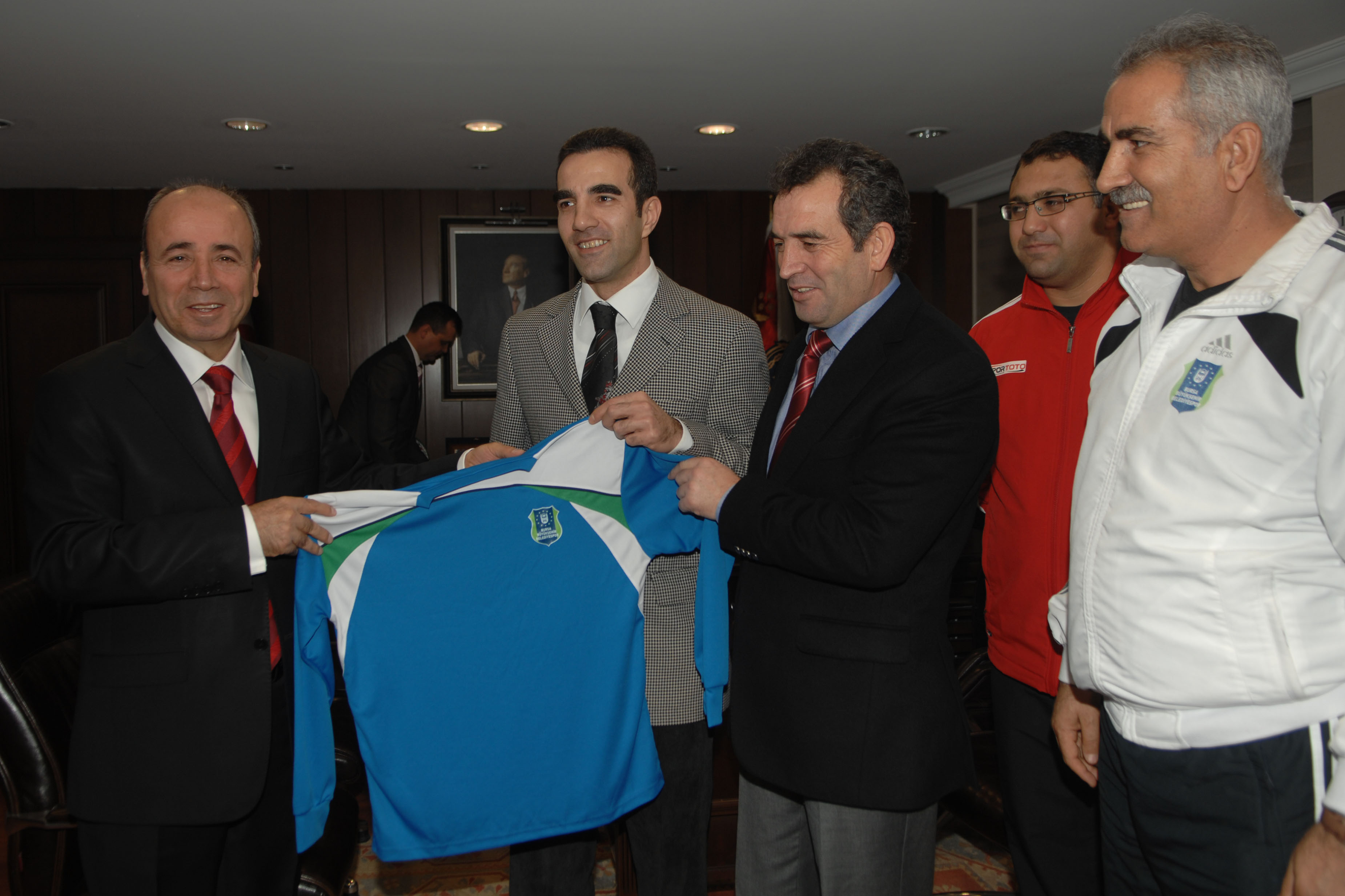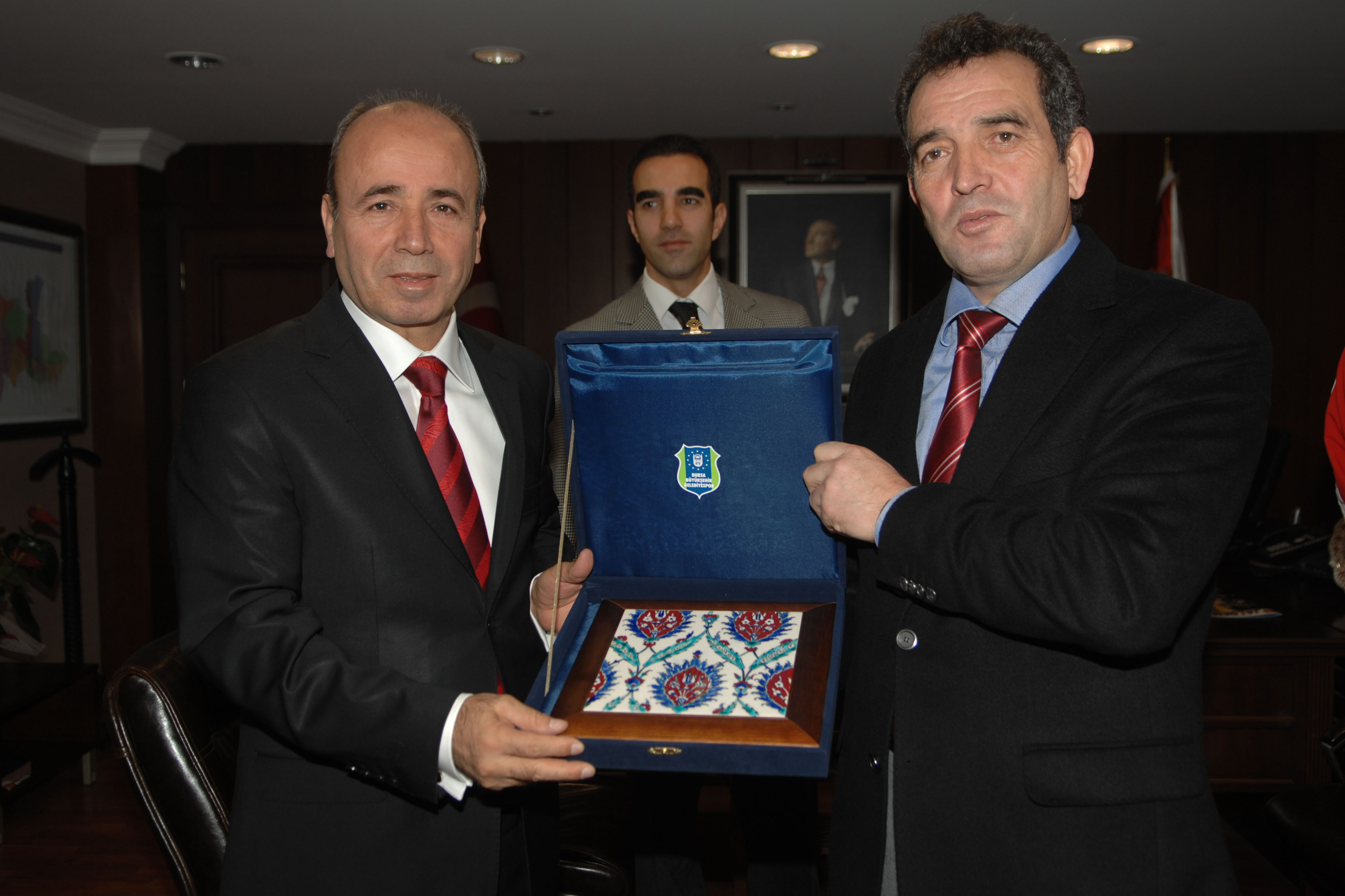 Büyükşehir Belediyespor yöneticisi Muzaffer Karadeniz de Bursa Emniyet Müdürü Kahya’ya, Büyükşehir Belediyespor forması ile İznik çinileriyle işlenmiş çiçek figürünün yer aldığı seramik tablo takdim etti.