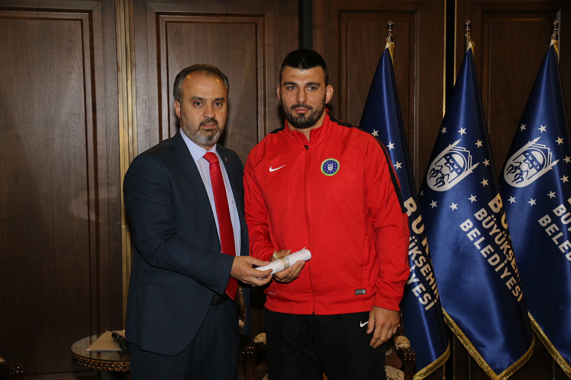 BURSA - Sırbistan’ın Novi Sad şehrinde yapılan 2017 Avrupa Güreş Şampiyonası'nda 97 kiloda şampiyon olan Bursa Büyükşehir Belediyespor Kulübü sporcusu Rıza Yıldırım, Büyükşehir Belediyesi tarafından arsa ile ödüllendirildi. Şampiyon güreşçi Rıza Yıldırım’ı tebrik eden Büyükşehir Belediye Başkanı Alinur Aktaş, her başarının ardından büyük emekler olduğunu belirterek, bu başarıda emeği olan sporcusundan yöneticisine herkesi kutladı.
