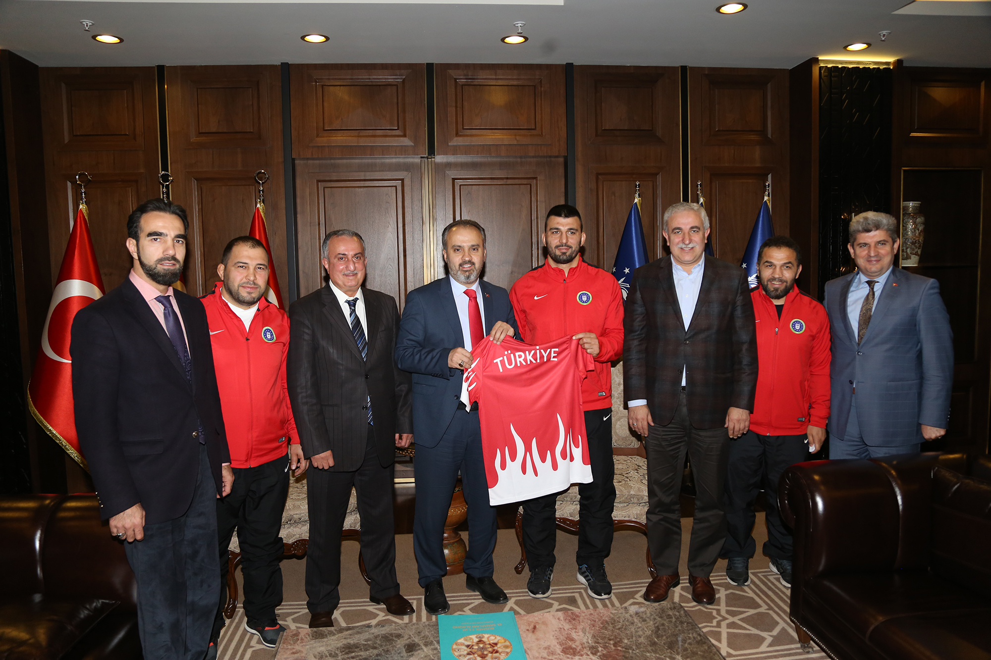 Büyükşehir Belediye Başkanı Alinur Aktaş, Avrupa şampiyon milli güreşçi Rıza Yıldırım, Büyükşehir Belediyespor Kulübü Başkan Yardımcısı İlhan Satık, Büyükşehir Belediyesi Başkanvekili ve Belediyespor’un güreş branşı sorumlu yönetim kurulu üyesi Abdullah Karadağ, Kulüp Müdürü Taha Başparmak ve antrenörler Ahmet Gülhan, Hakan Koç ve Tamer Kısacık’ı ağırladı. Ziyarette güreş branşı ile ilgili bilgi alan Başkan Aktaş, “Büyükşehir Belediyespor Kulübümüz, başta voleybol ve basketbol takımımız olmak üzere, içinde barındırdığı branşlar ve belediyemizin destekleriyle yapılan spor tesisleriyle Bursa'da spor hayatının canlanmasına vesile oluyor. Yapılan bu çalışmalar ve tesisler beraberinde şampiyonlukları, ulusal ve uluslararası başarıları getiriyor” dedi.